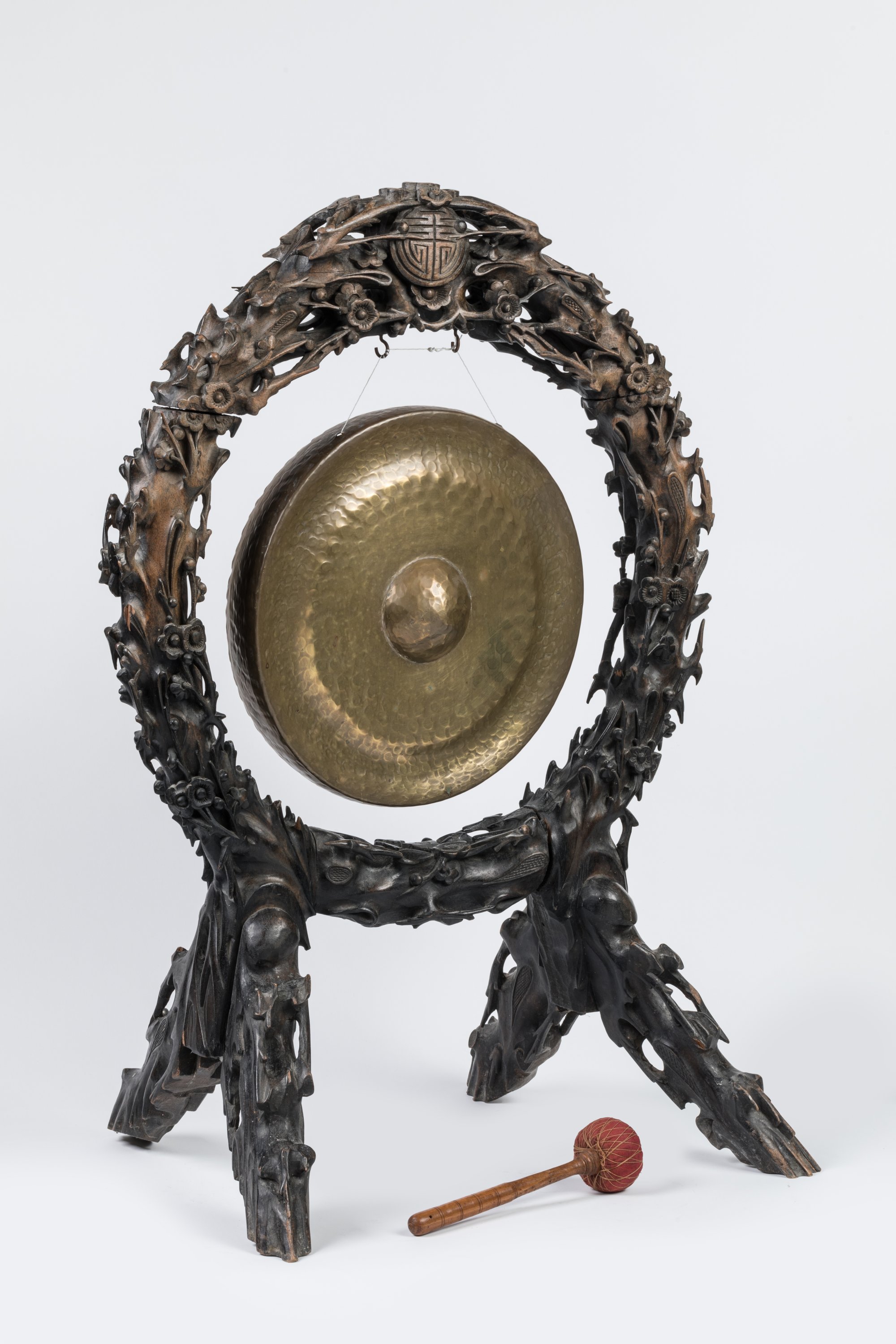 Montant en bois noirci sculpté de branches de prunier en fleurs entourant un caractère « shou ».