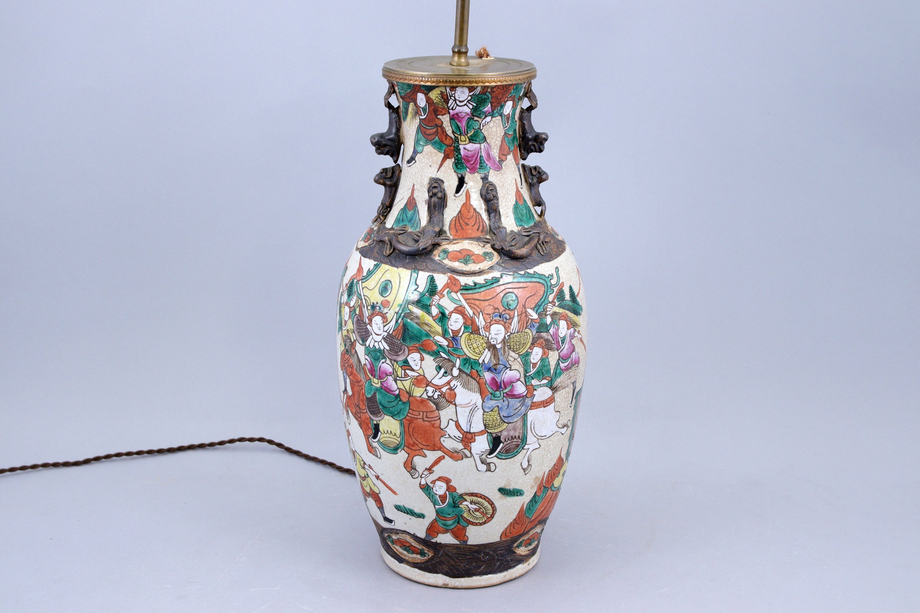A décor de guerriers à pied et à cheval, l'épaulement orné de qilong en relief et deux anses en forme de lions s'affrontant.