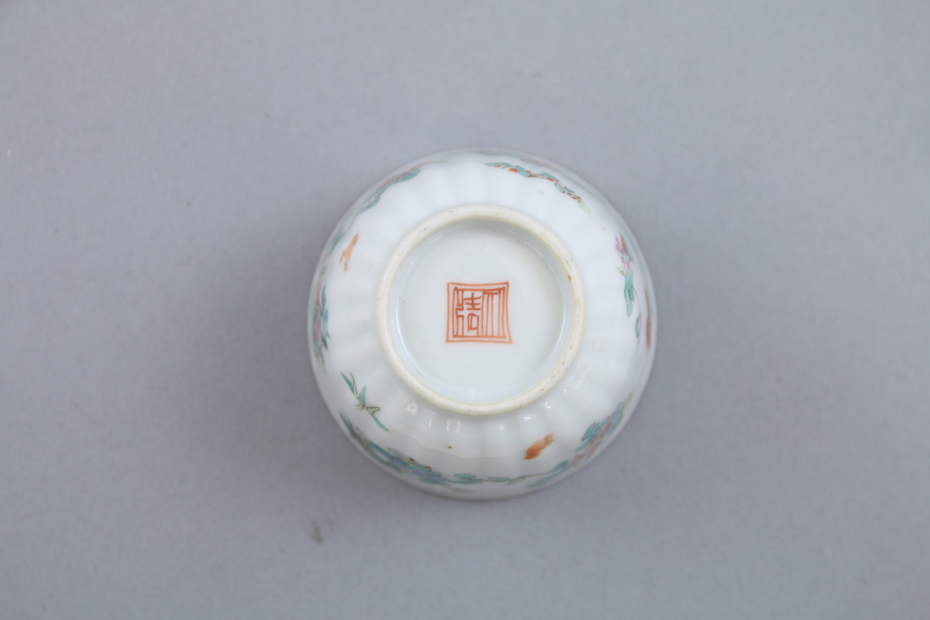 A décor polychrome de fleurs et d'insectes sur fond blanc. Marque au revers.