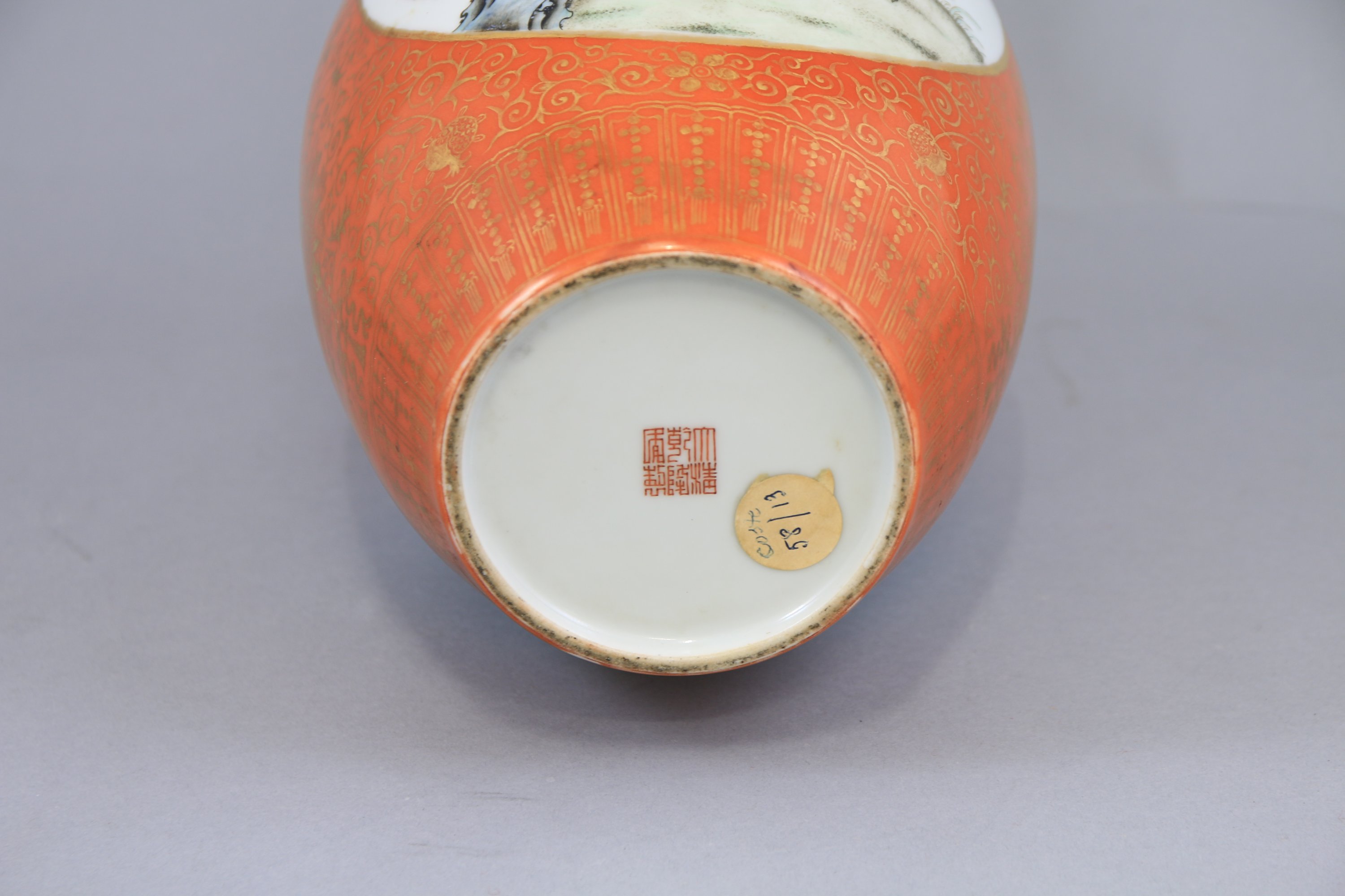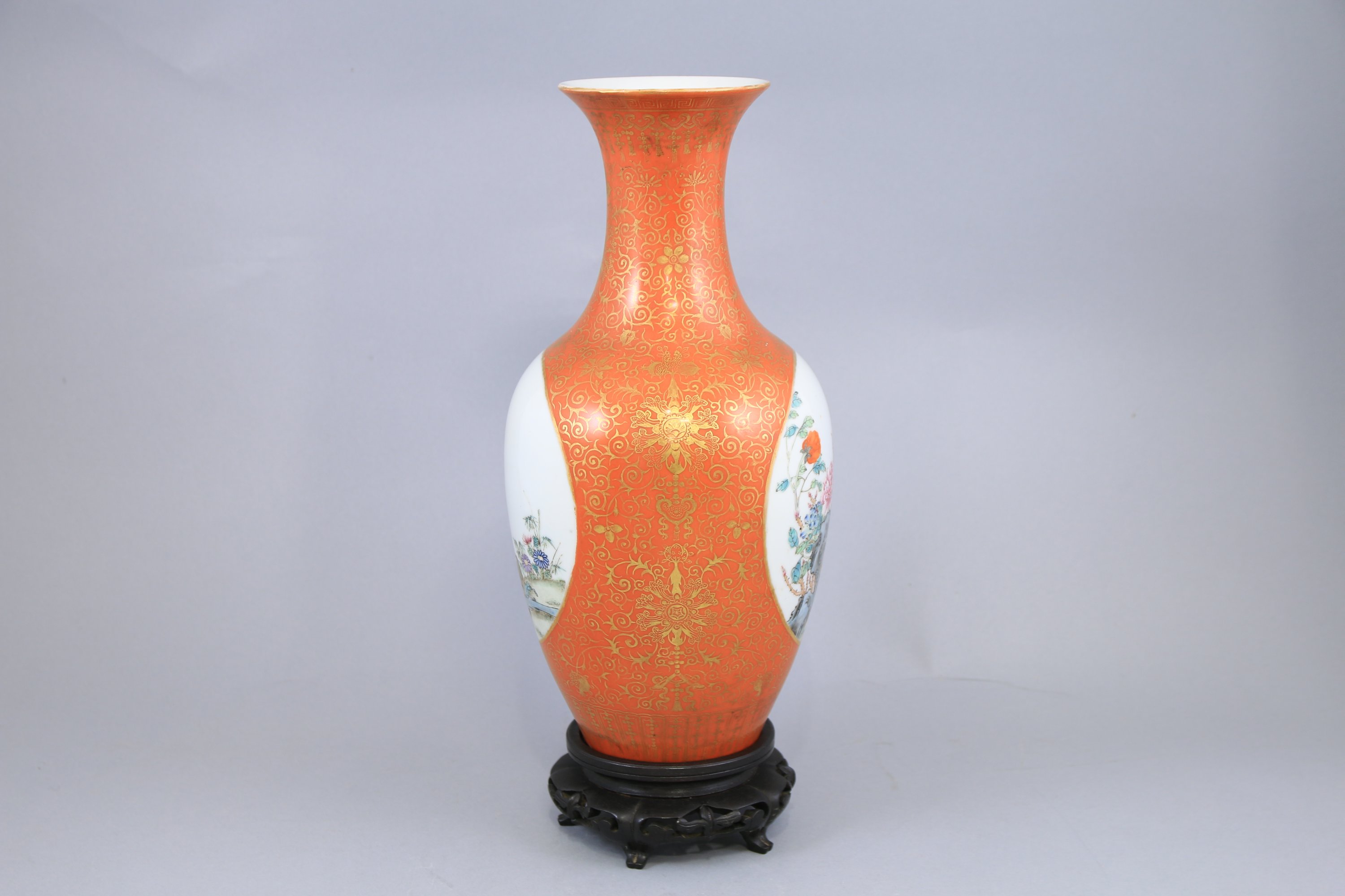 A col évasé et décor de réserves de coqs et poules dans les pivoines et couple de cailles dans les bambous sur fond émaillé corail et or de rinceaux de lotus épanouis, ruyi, pierres sonores et grenades, le col orné de frises de ruyi, pendeloques et grecques.