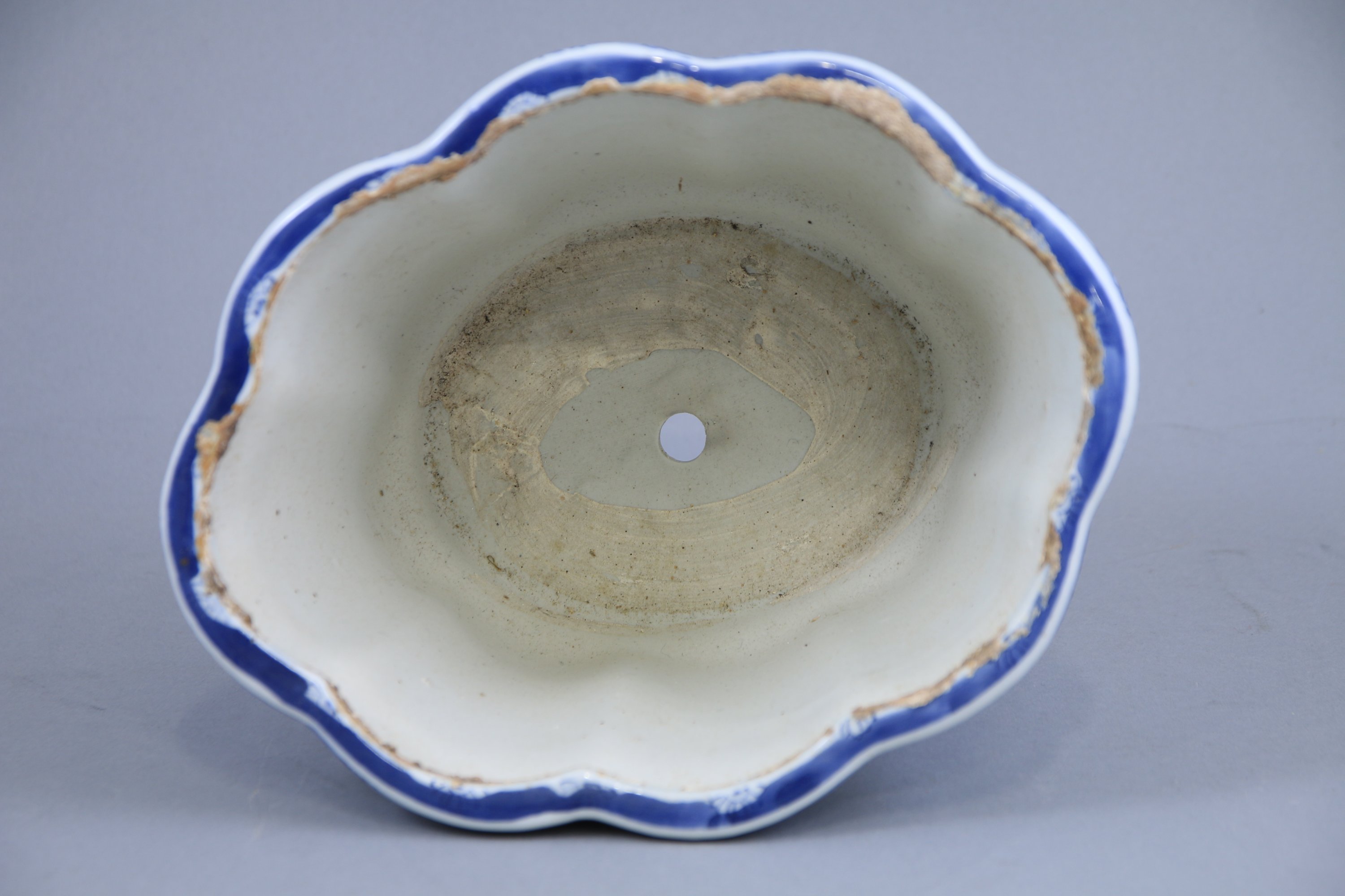 - Un cache-pot polylobé en porcelaine à décor bleu de végétaux dans des réserves sur fond blanc. Haut. 15,5 Long. 26 Prof. 21 cm. (accidents, percé).