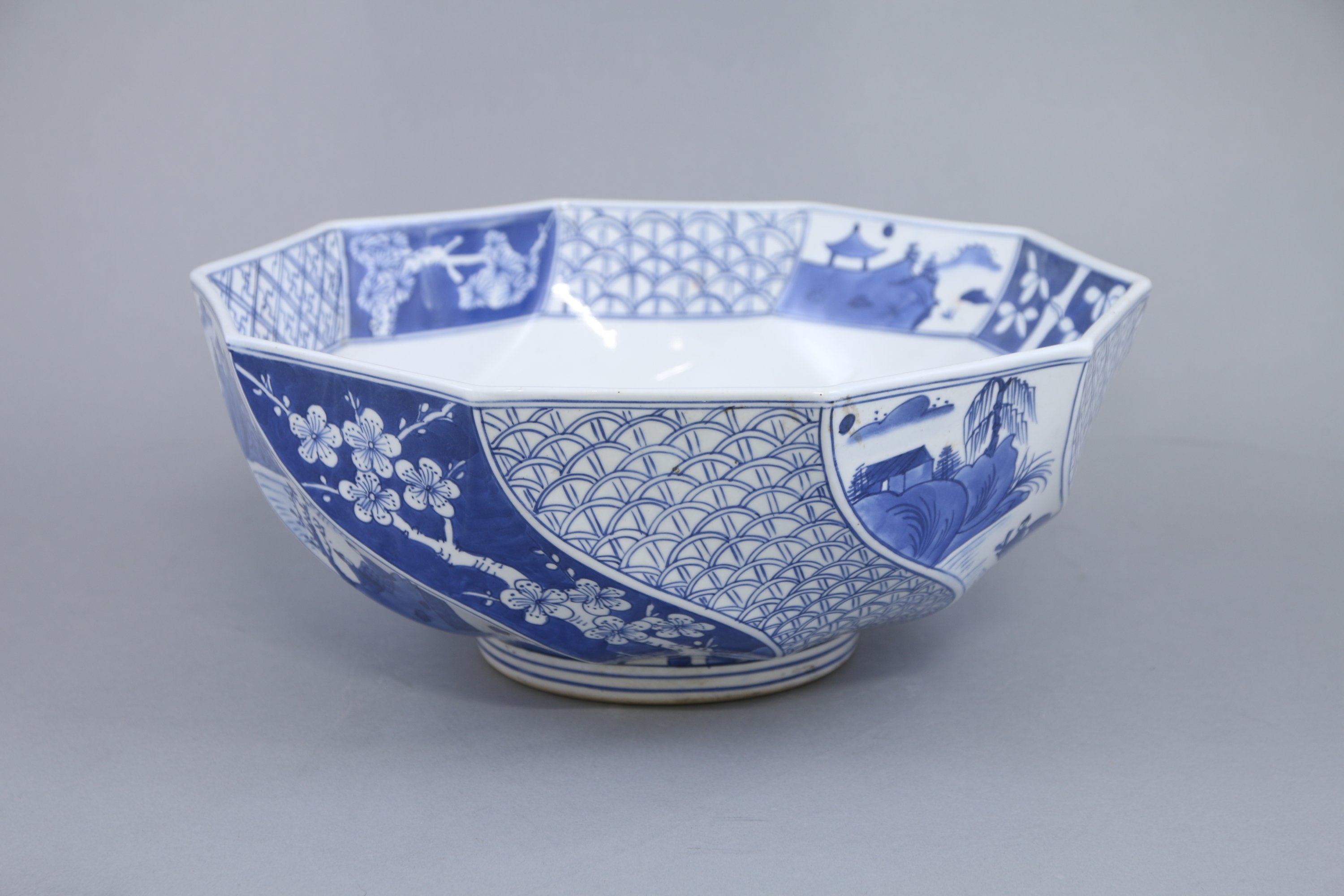 - Grande coupe en porcelaine bleue et blanche à décor de paysages et de végétaux, signé au revers. Haut. 14,5 Diam. 37 cm.