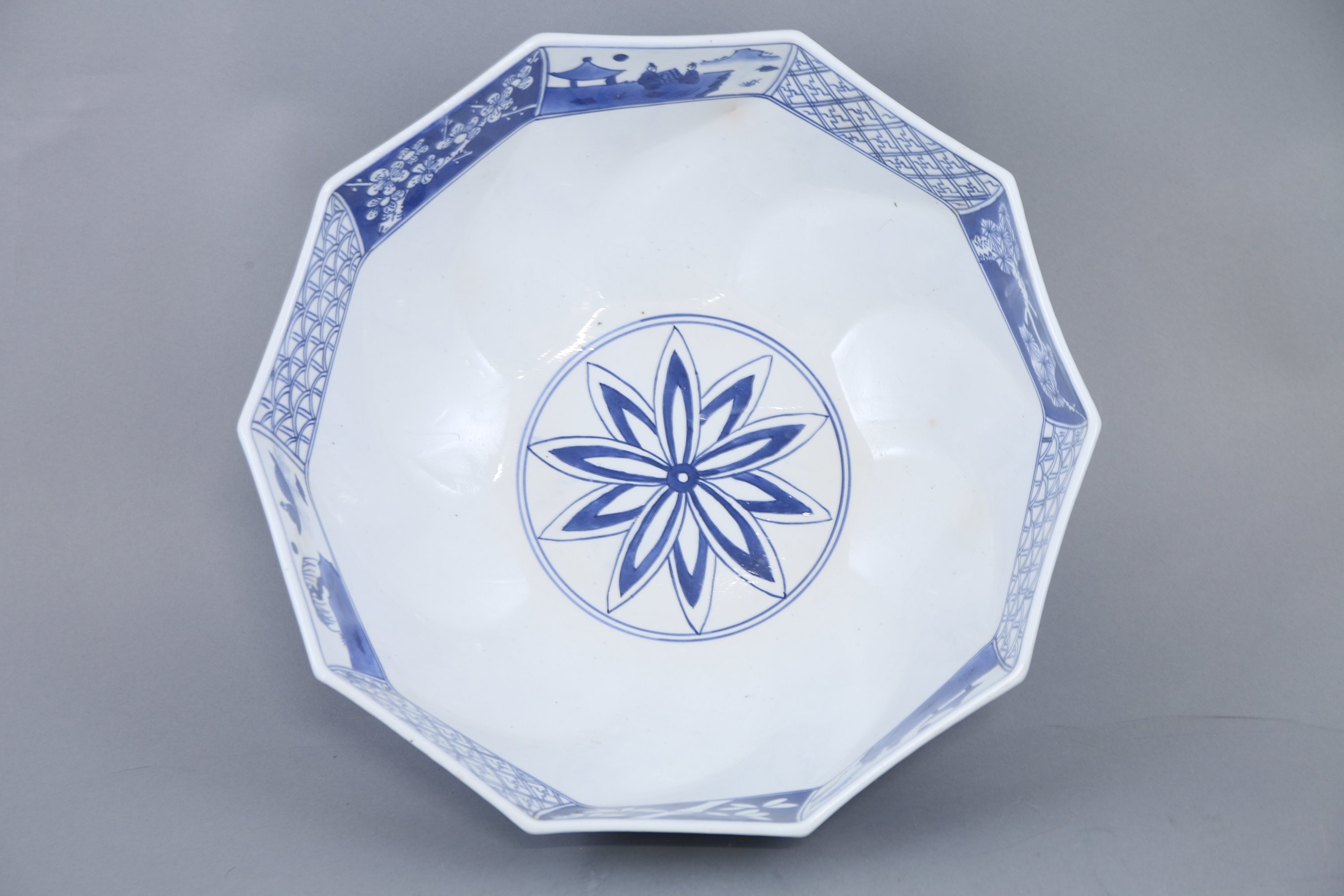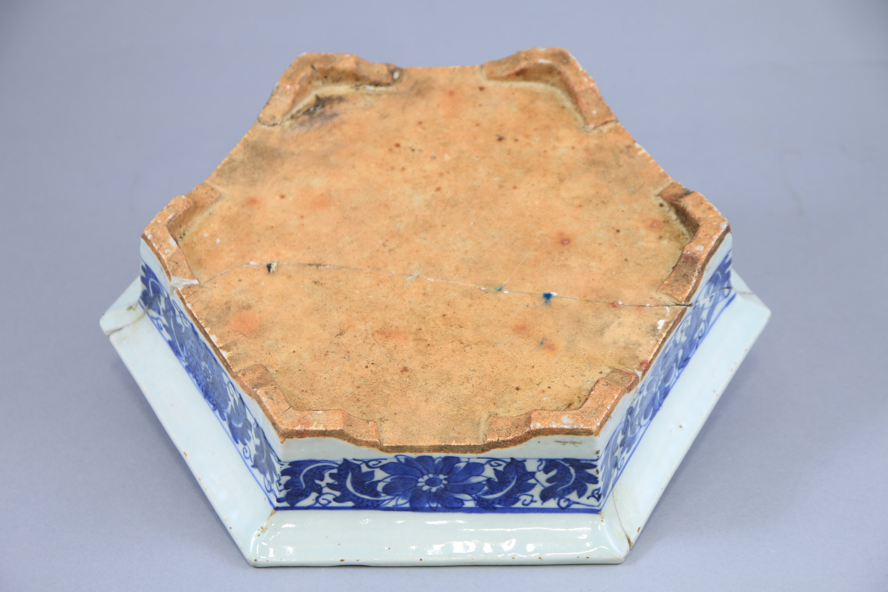 - Chine XIXe, cache-pot hexagonal à décor bleu de végétaux sur fond blanc Haut. 7,5 Diam. 33 cm. (accidents et restaurations).