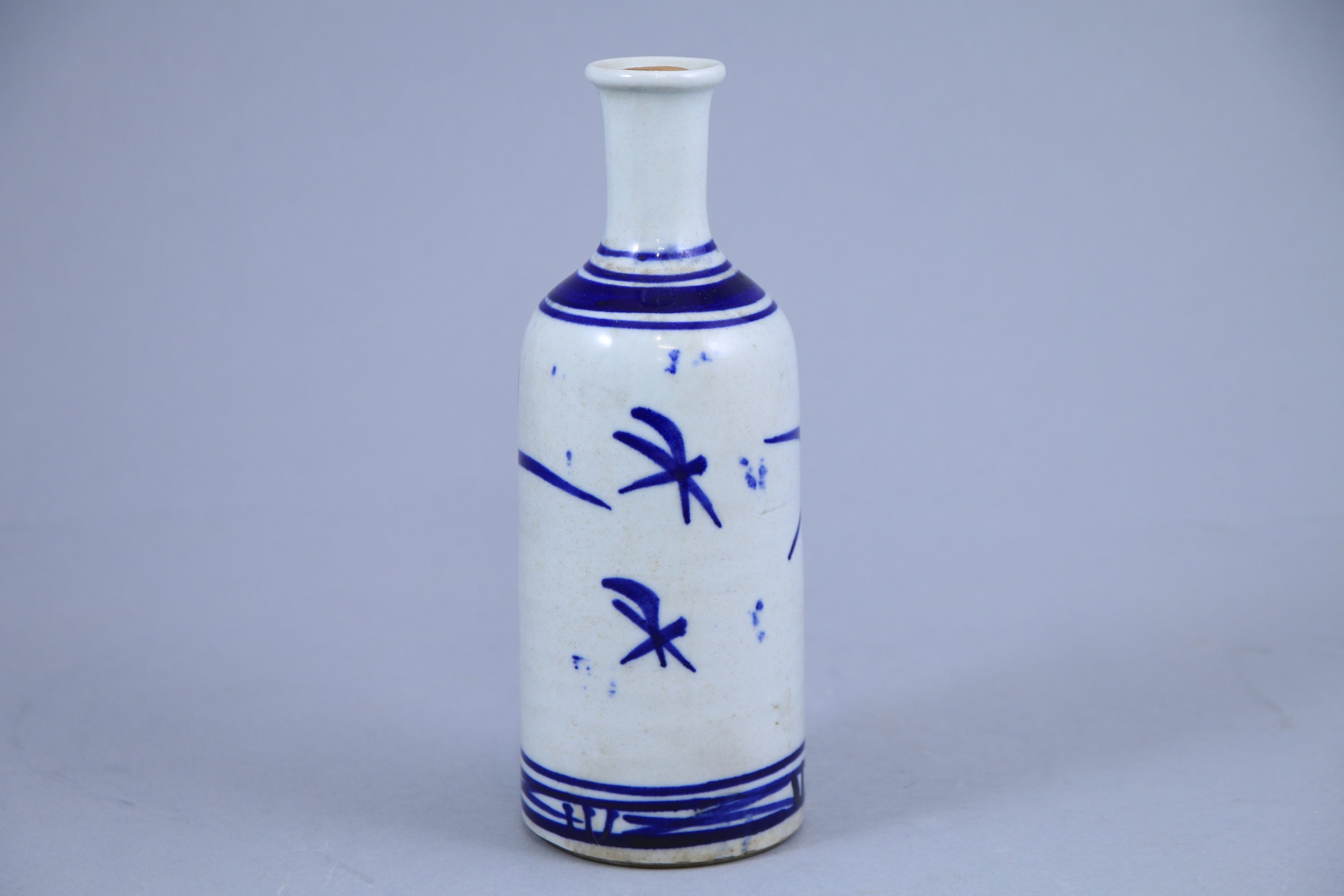 - Une bouteille à saké en porcelaine à décor de végétaux bleu sur fond blanc. Haut. 22 cm.