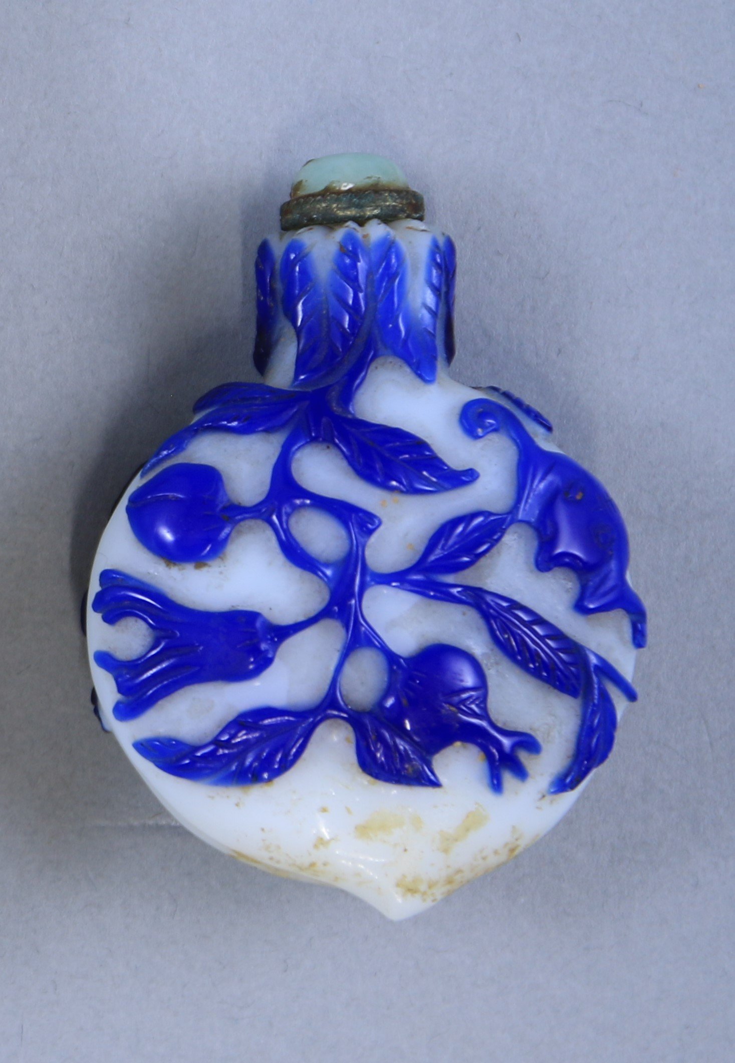 Verre overlay bleu foncé sur fond blanc opaque de chauve-souris en vol dans les trois abondances (sanduo) : pêche, grenade et main de bouddha.