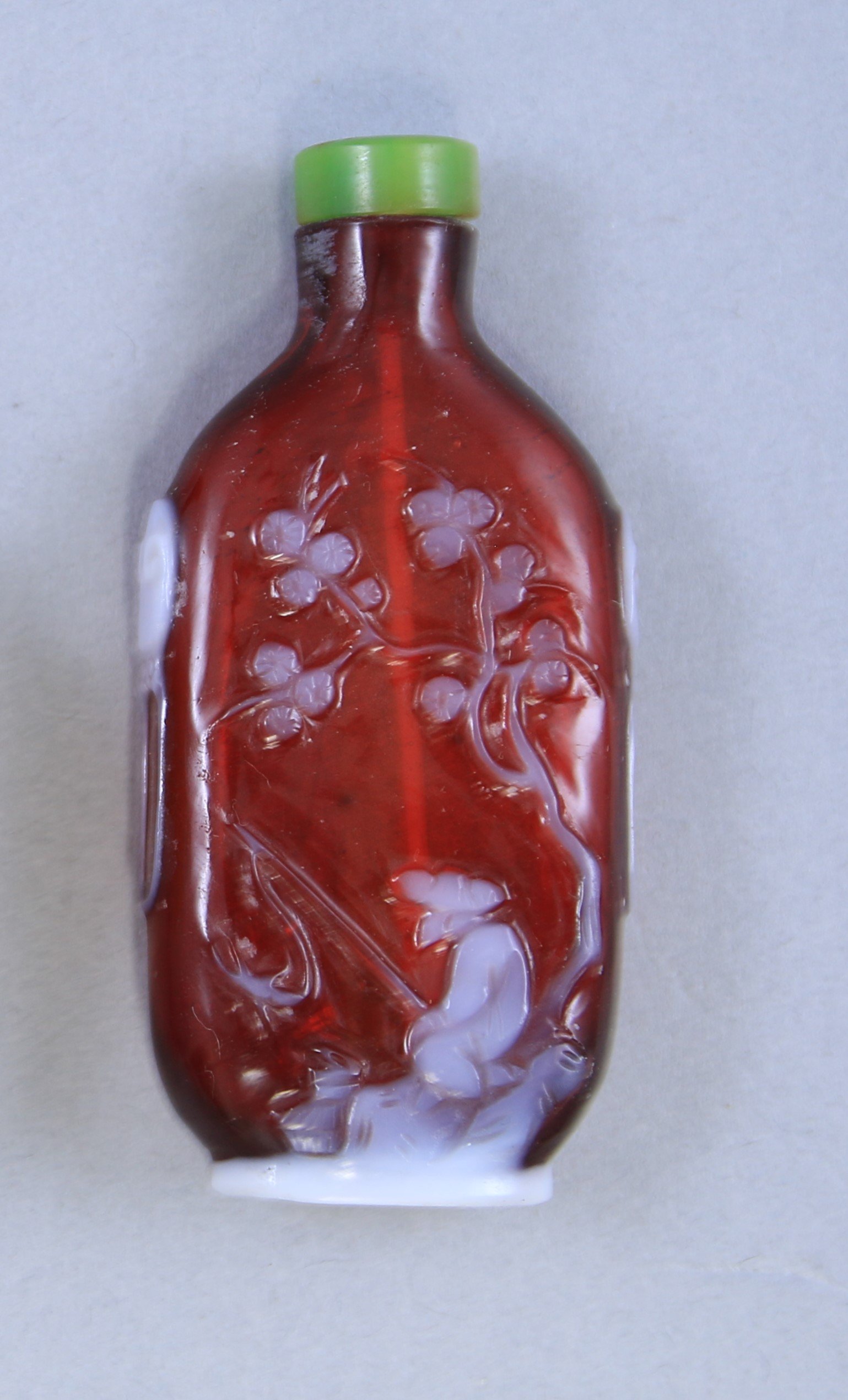 Verre overlay blanc opaque sur fond rouge translucide d'un pêcheur sous un pin et personnage sur un rocher, deux anses soutenant des anneaux.