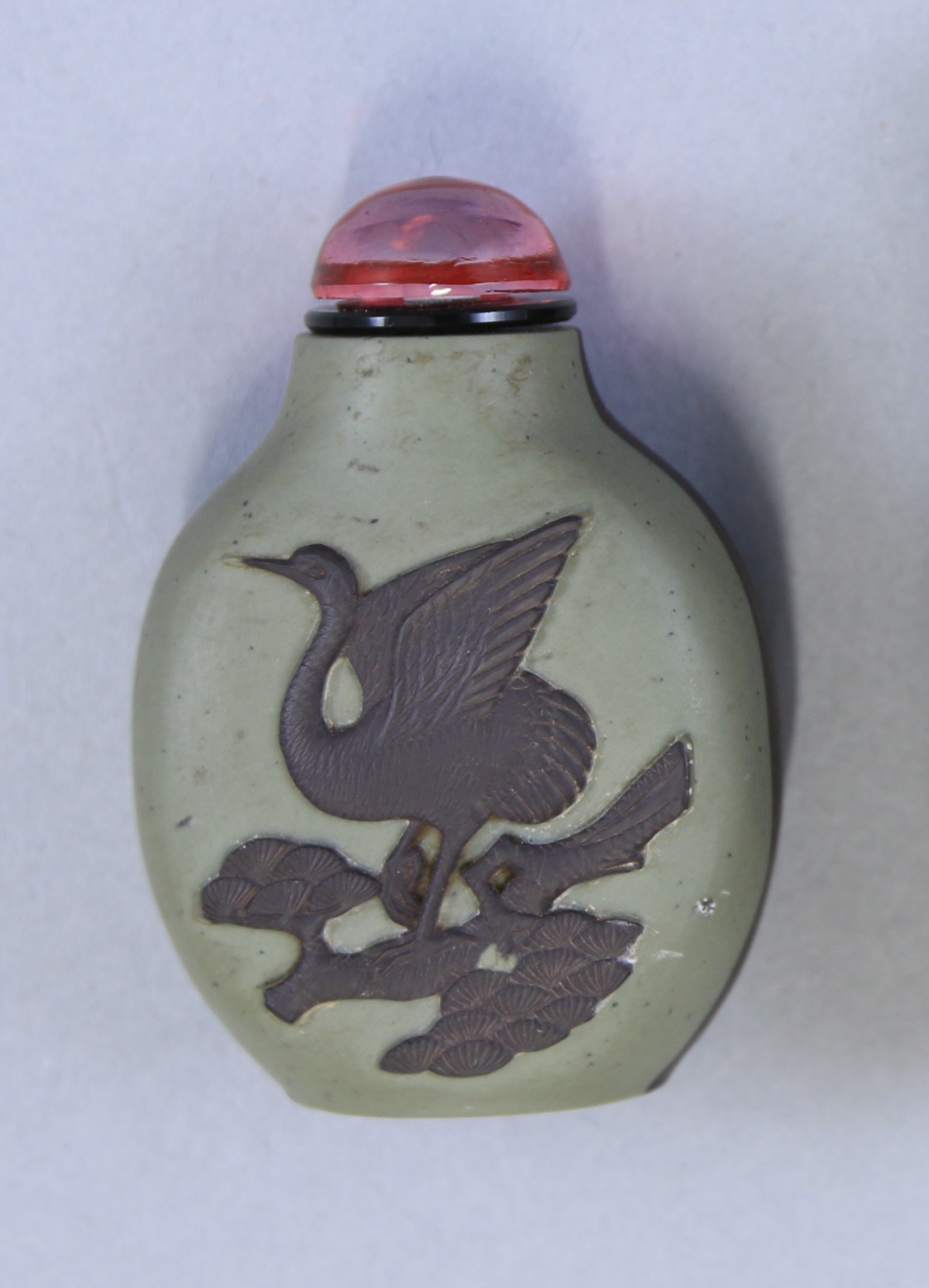 Songhuashi kaki et brune sculpté d'une grue posée sur une branche de pin.