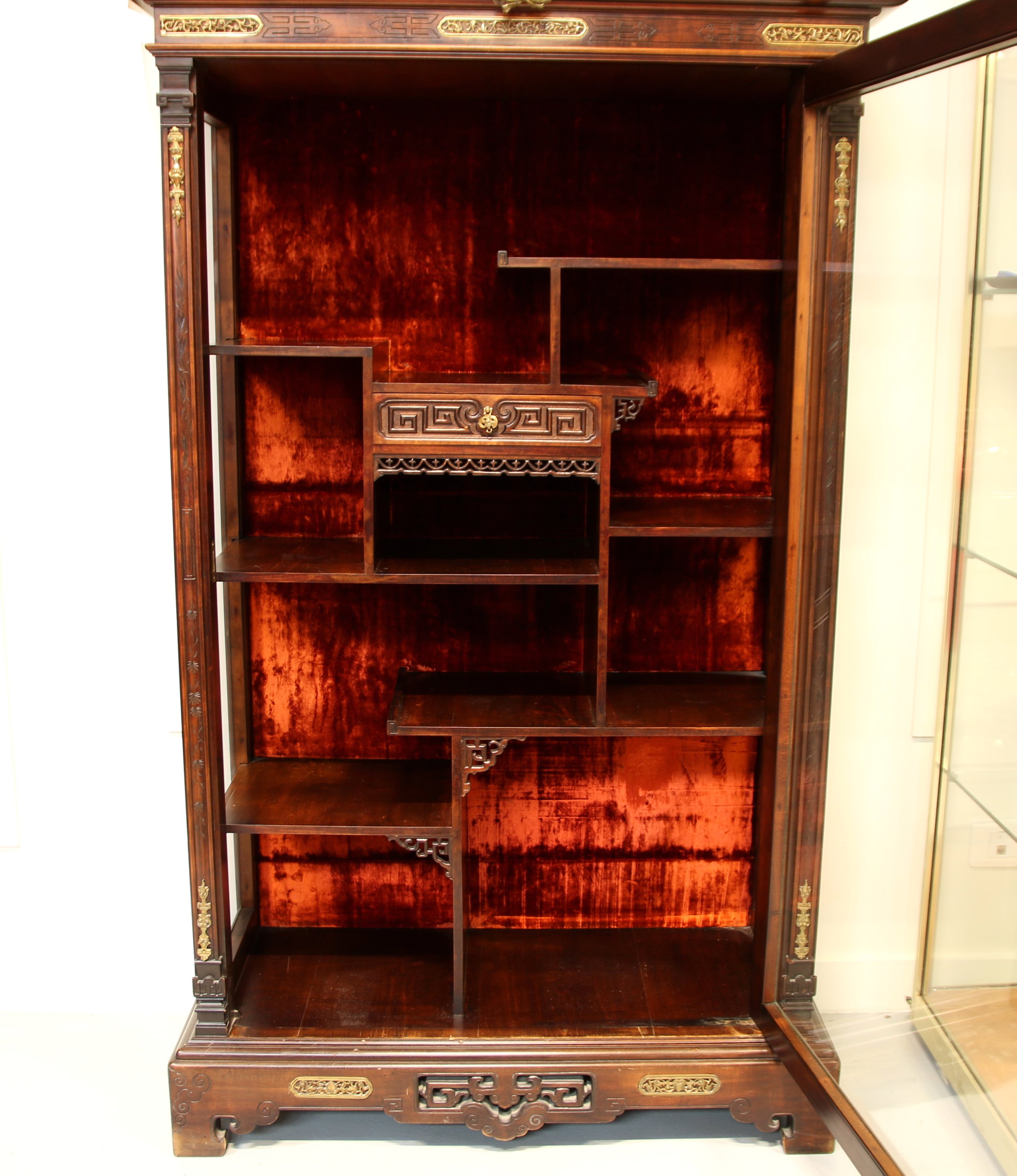 Riche décor japoniste de frises ajourées, de nuages et de grecques, la corniche abrite une niche d'où émerge le corps d'un dragon. Elle ouvre par une porte vitrée dévoilant douze étagères formant neuf niches asymétriques et un tiroir. Fond recouvert d'un velours cuivré. Le tablier à décor ajourés et entourés de quatre pieds. Ornementations de bronzes dorés à décor de frises végétales aux angles, montants et piètement.