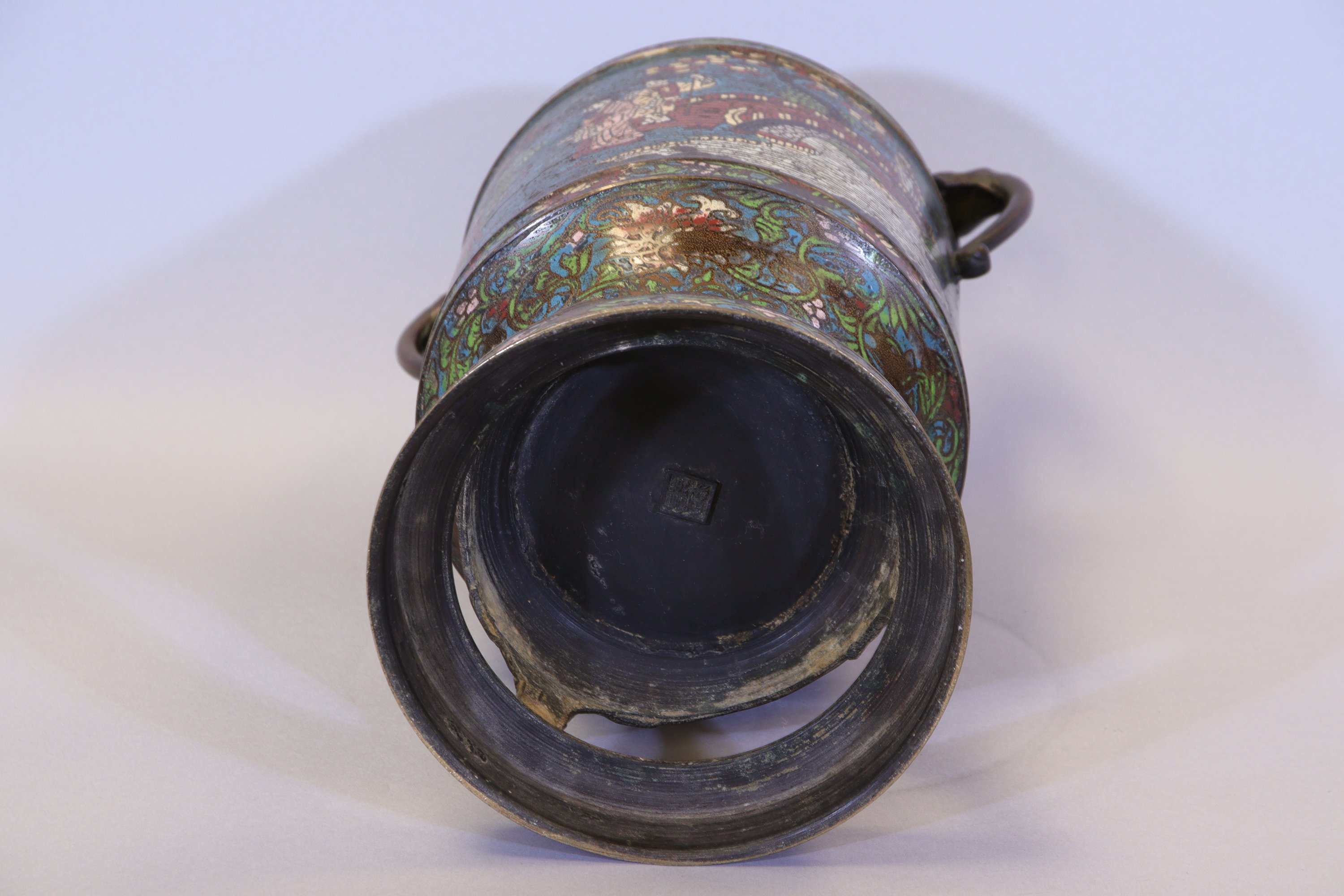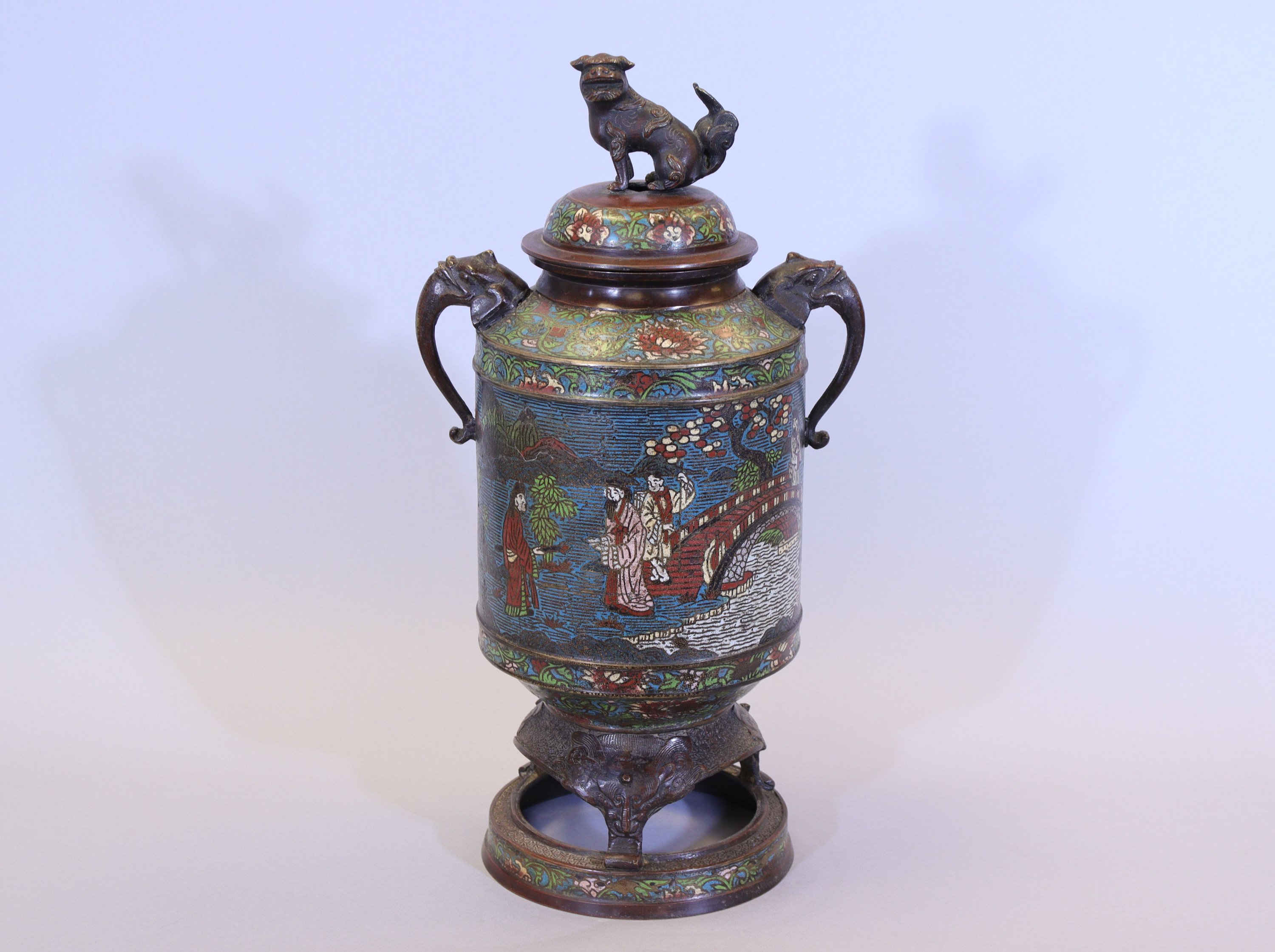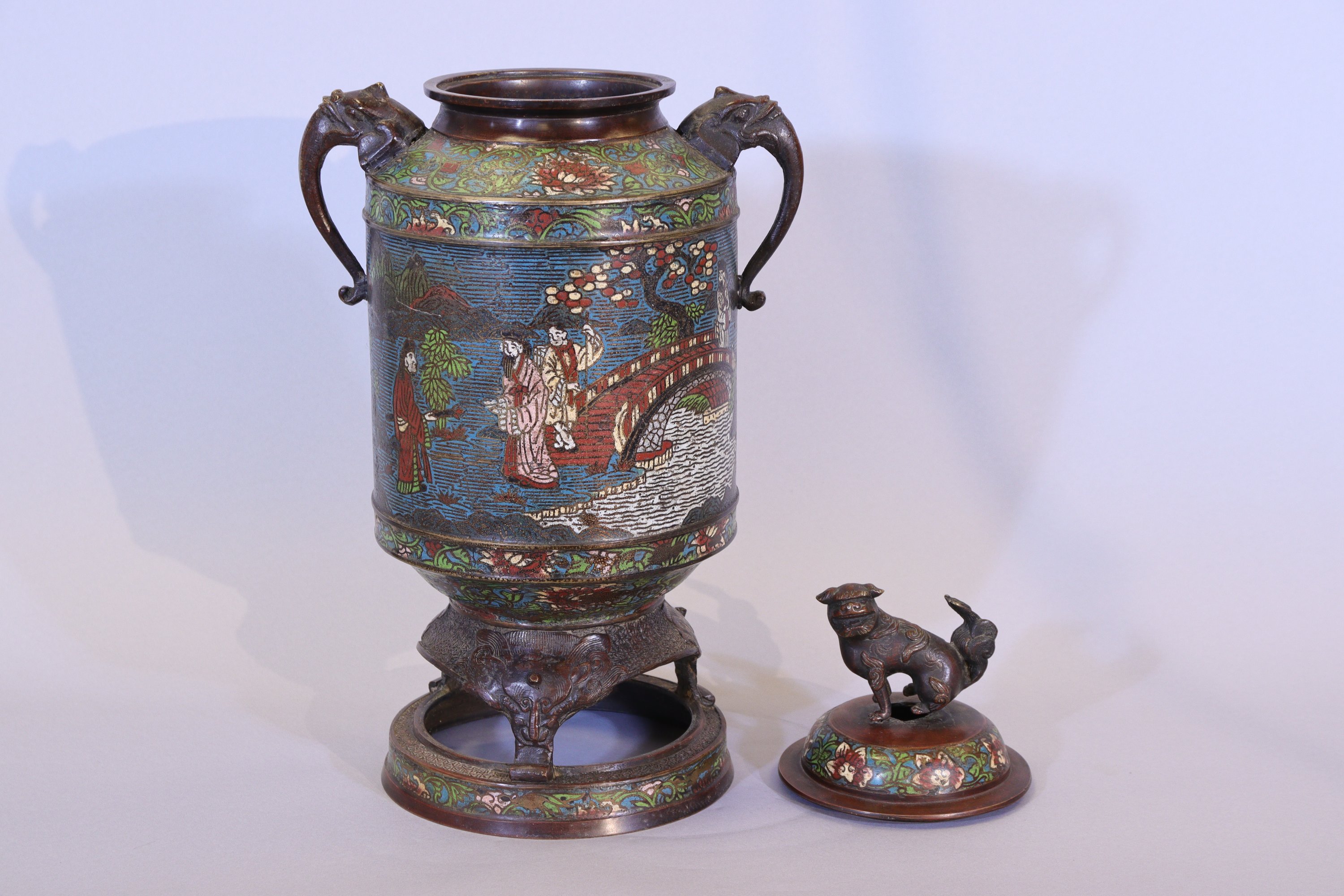 Bronze à patine brune et émaux cloisonnés.