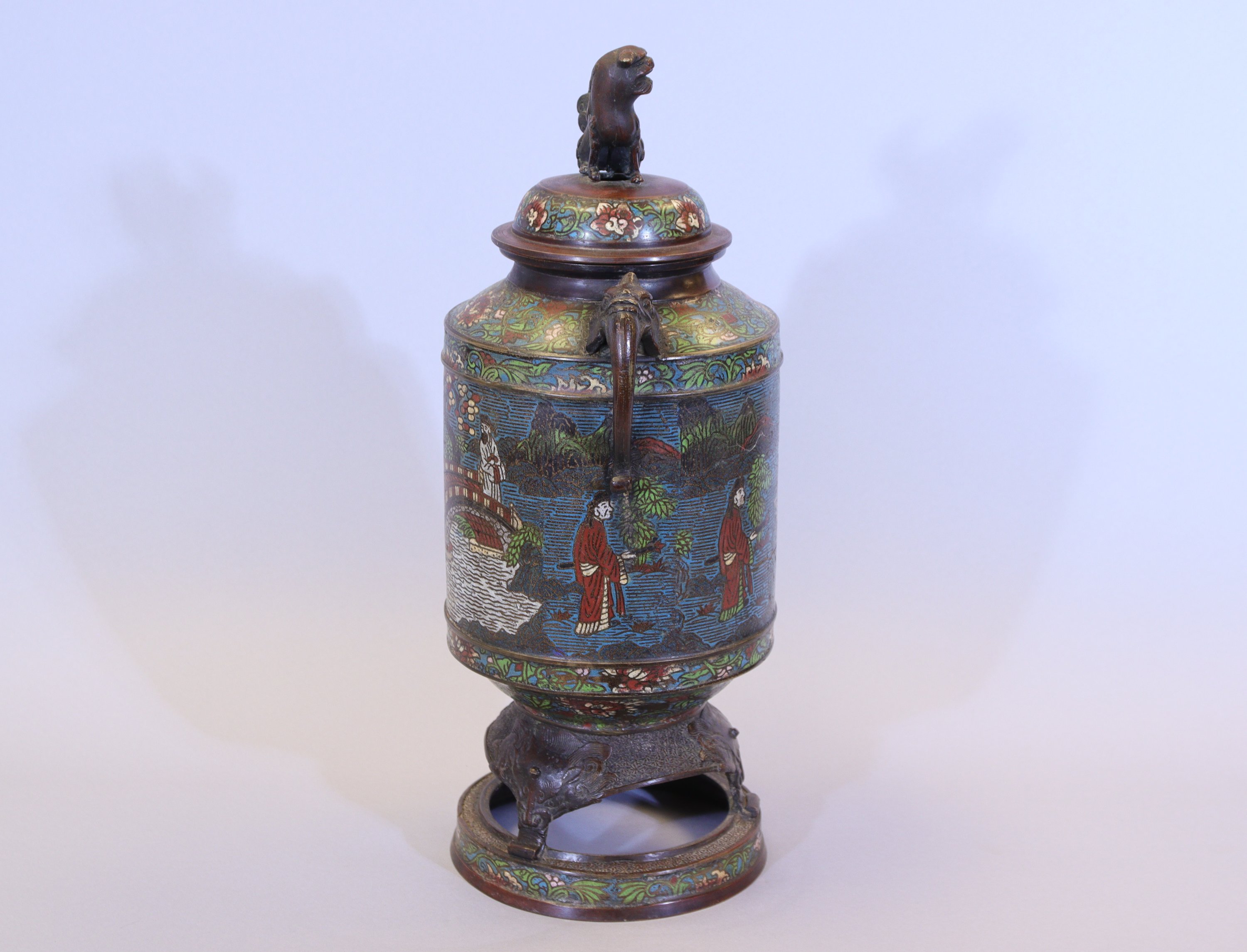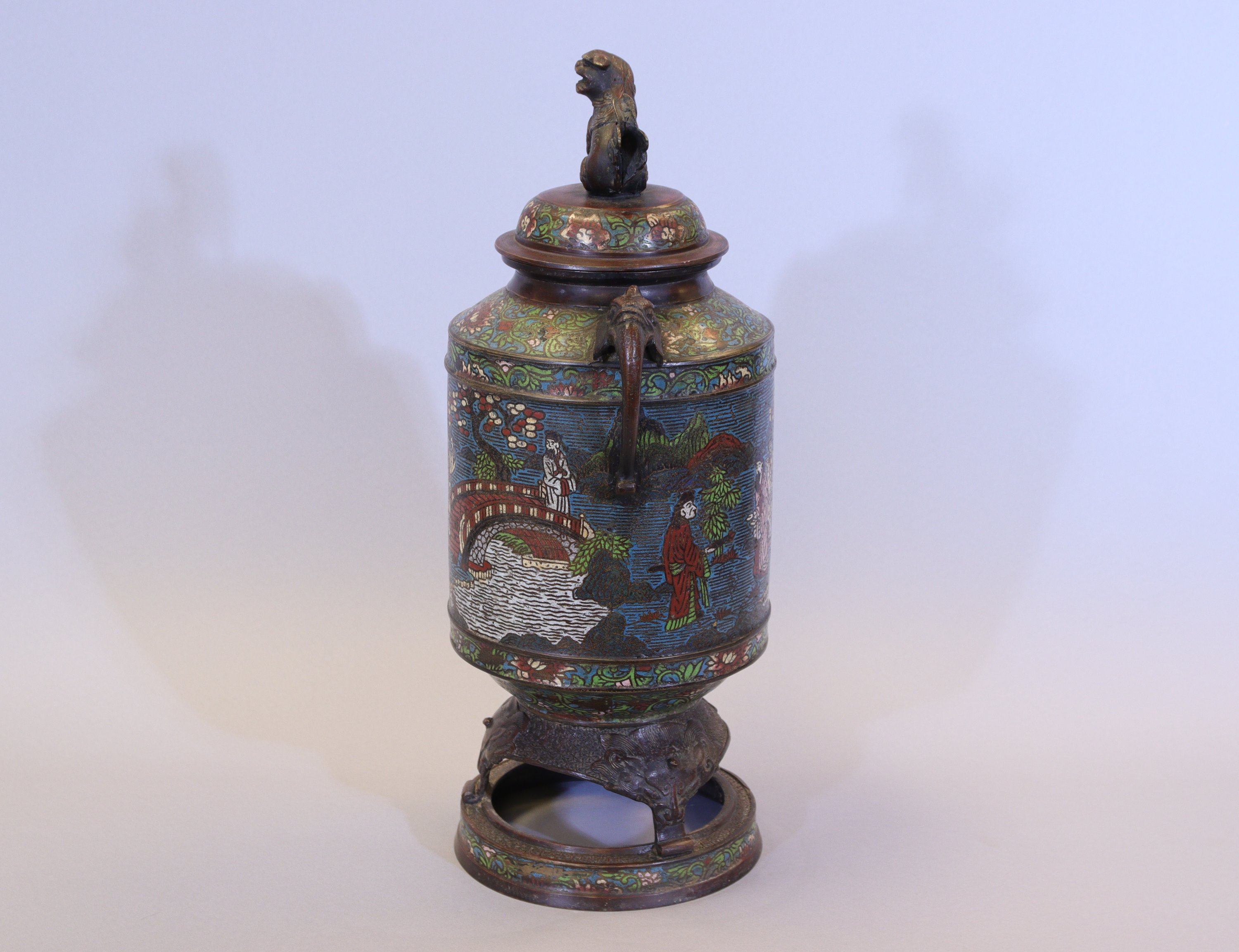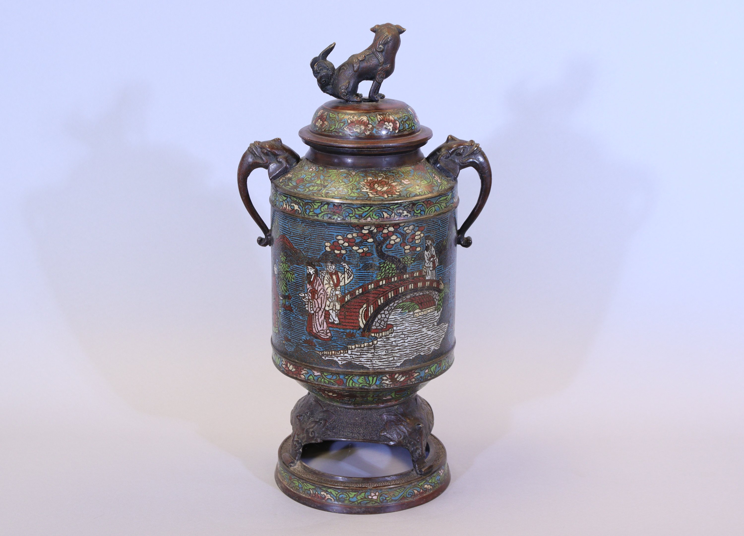 A décor de passage d'un pont, la prise du couvercle en forme de lion.