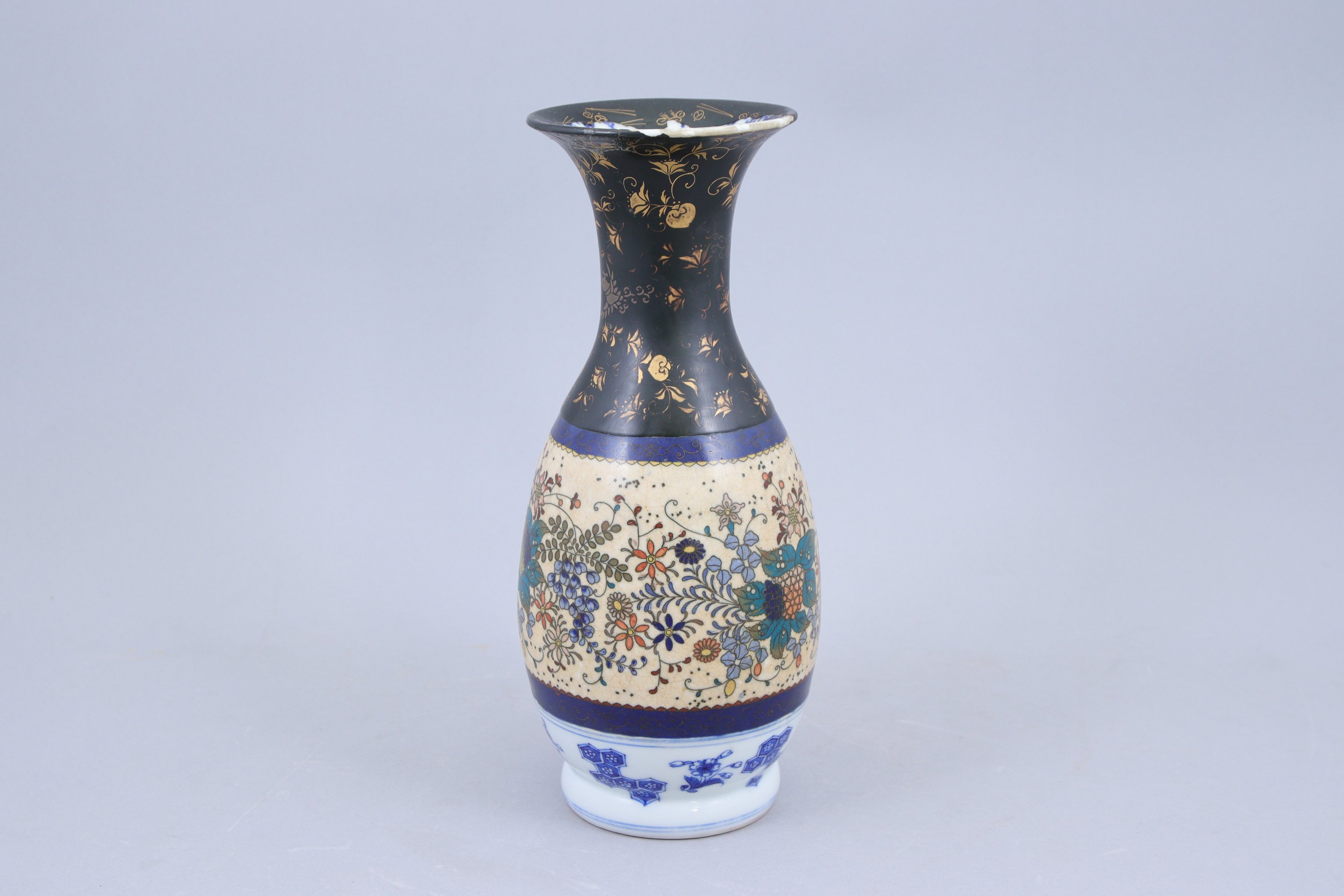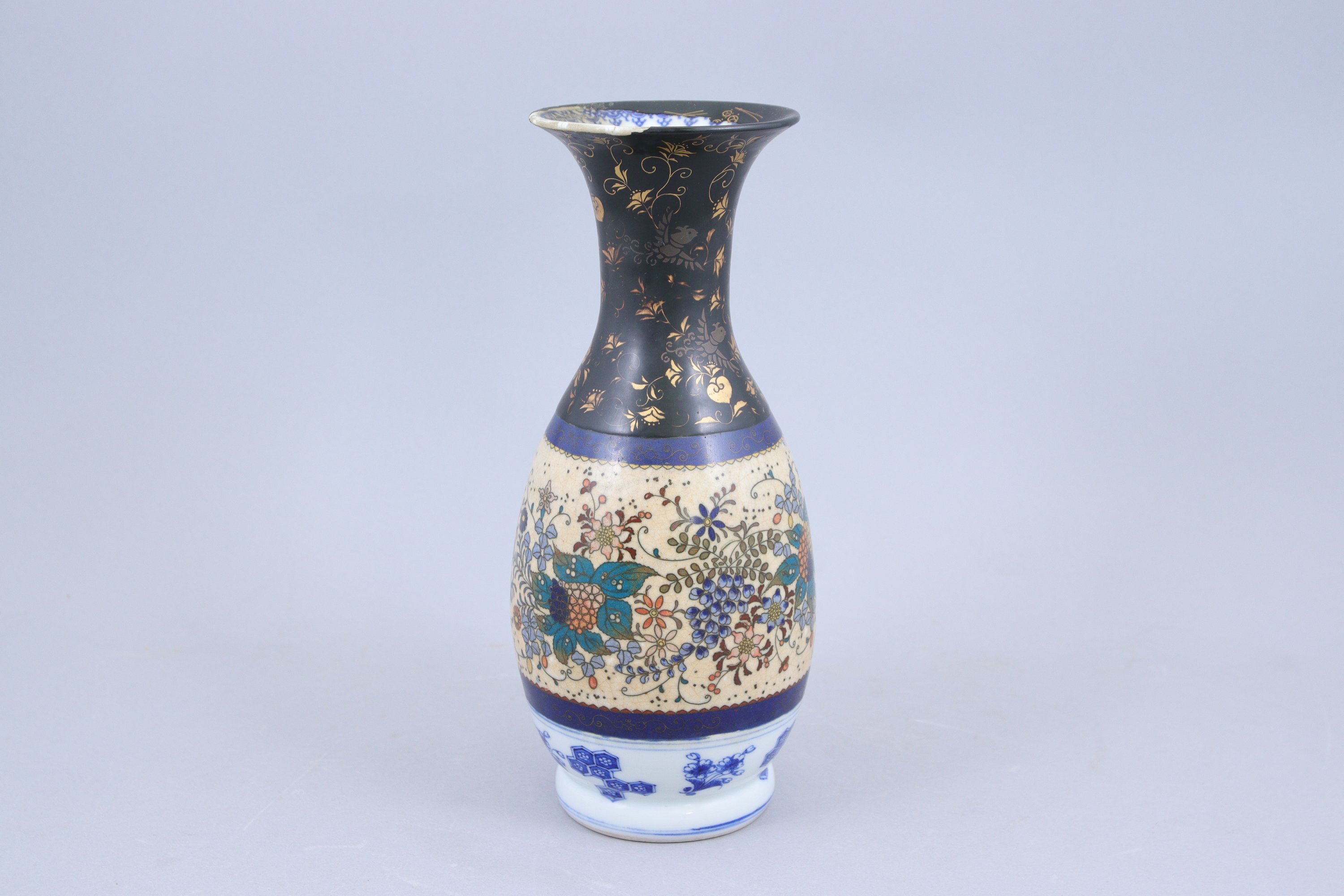 A décor en bleu sous couverte partiellement laquée et émaux cloisonnés. Le col à décor laqué noir et or de motifs floraux. La panse ornée de glycine, hortensia et fleurs variées.