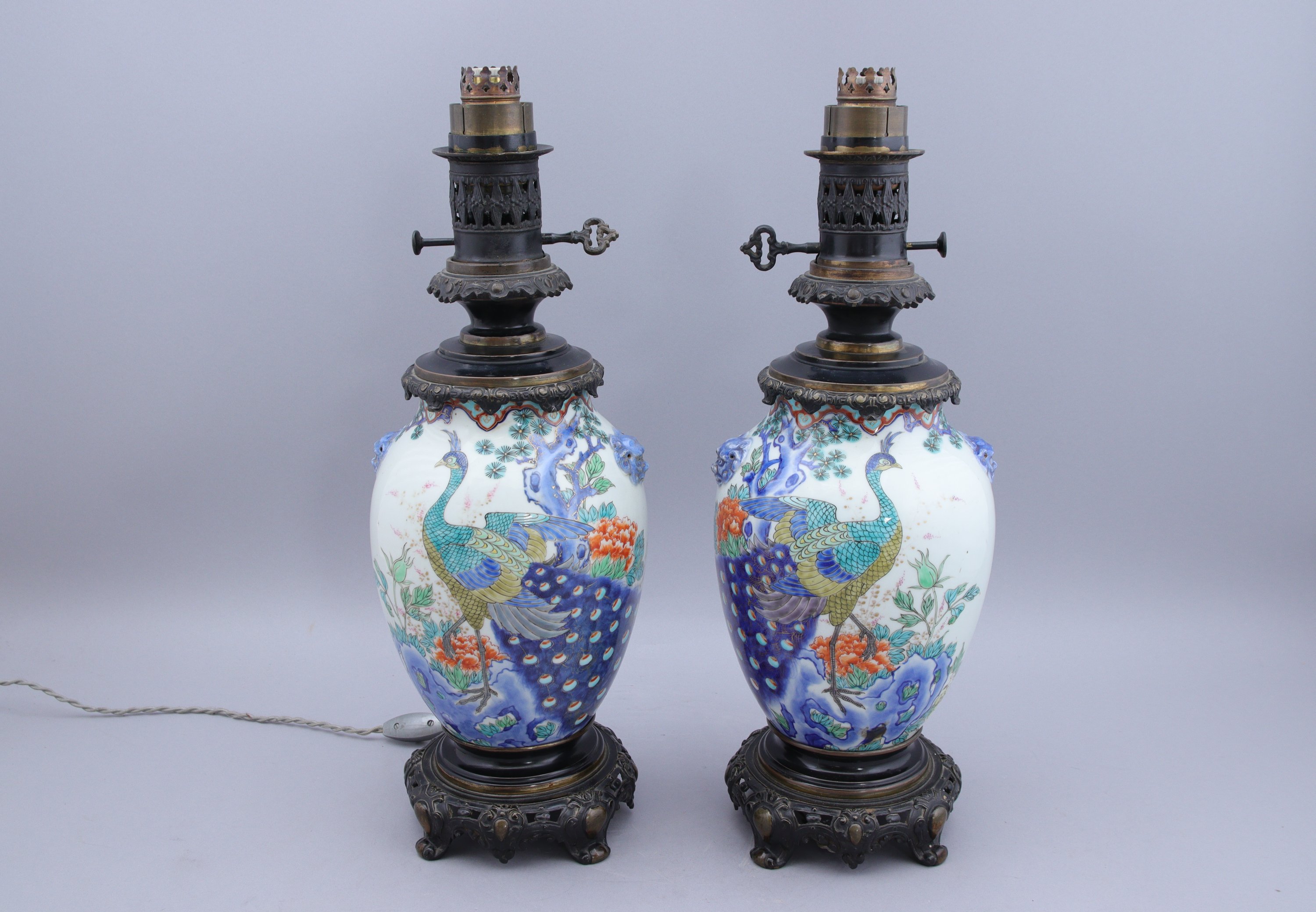 Décor en bleu sous couverte et émaux polychromes et or d'oiseaux variés dans les pins et fleurs d'automne. Montés en lampes.