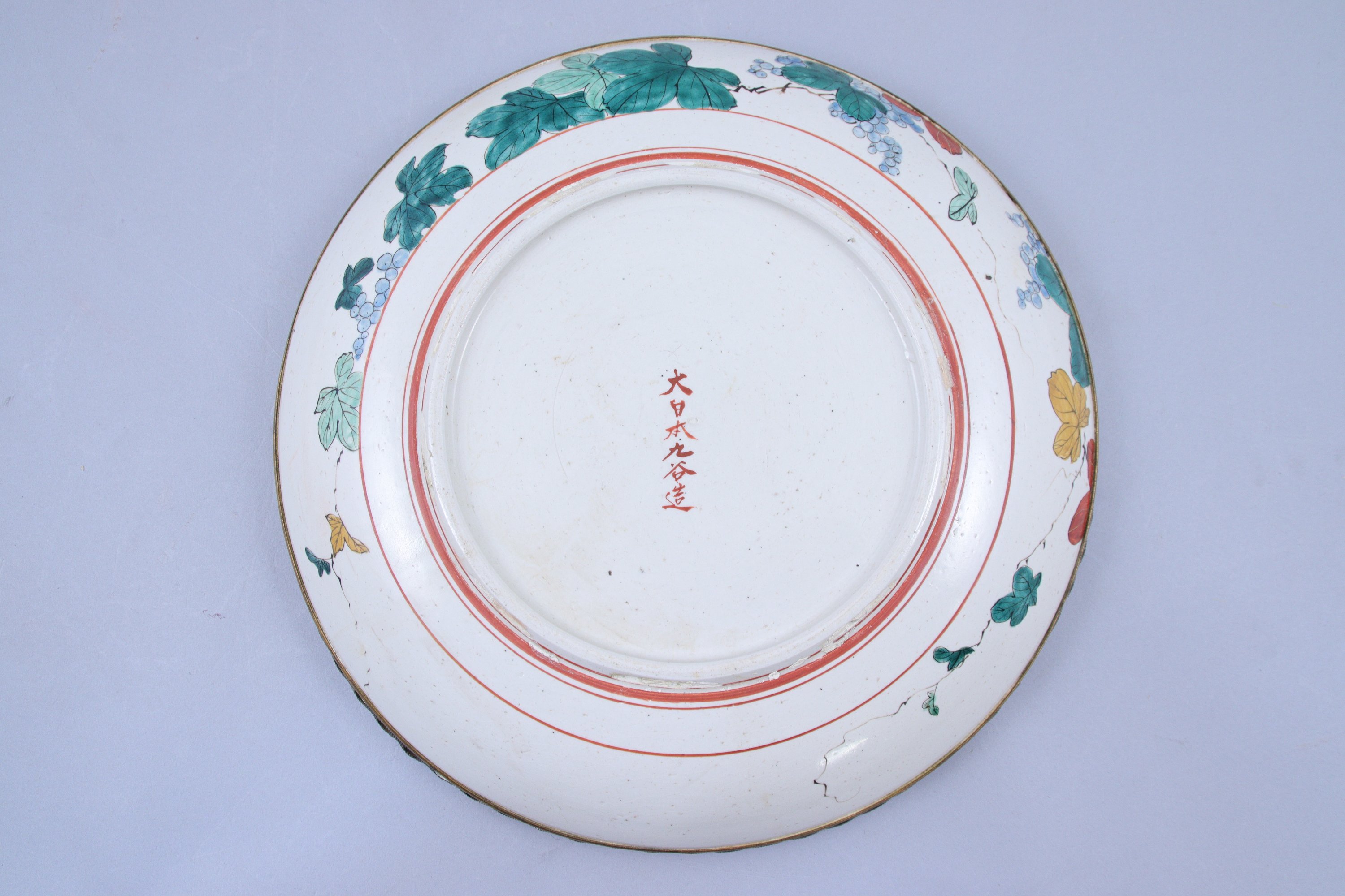A décor dans des réserves de paysans, oiseaux et fleurs. Au revers, la marque Dai Nihon Kutani zo.