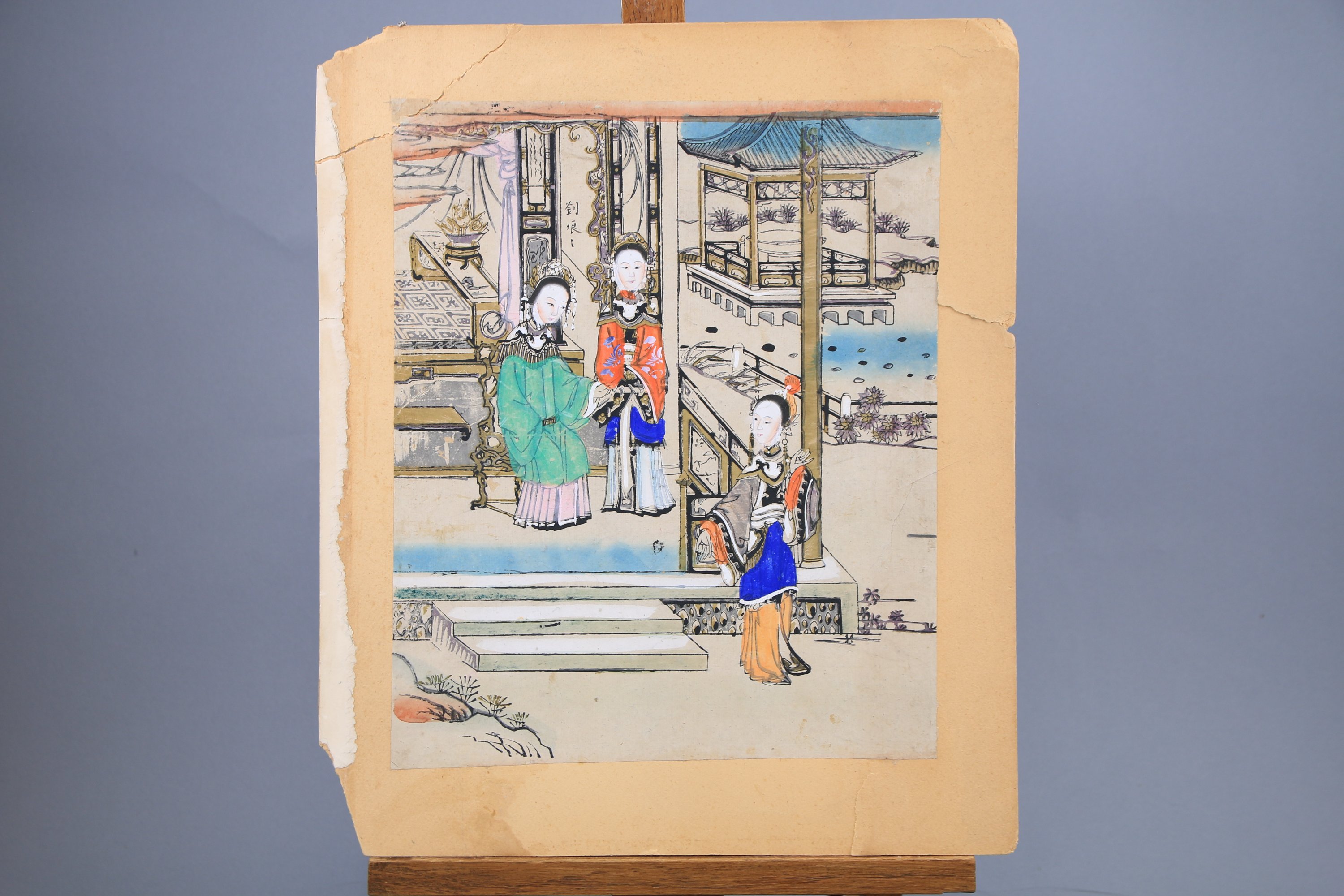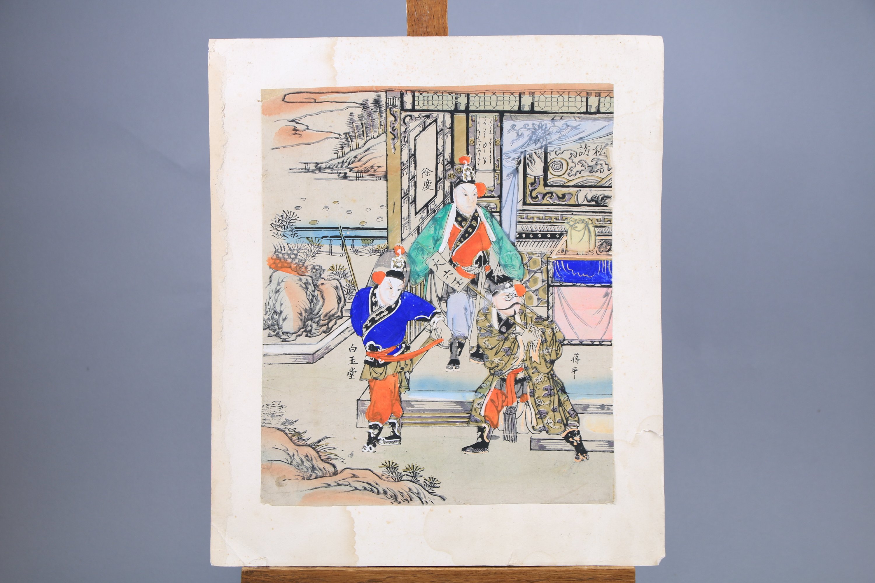 - deux encres sur papier, l'une représentant Xu Ping, Bai Yutang et Xu Qing, trois des cinq frères appelés "Les cinq Rats", protagonistes de l'histoire "les trois héros et les cinq justes (Sanxia wuyi); l'autre représentant trois jeunes femmes. Haut. 34 Larg. 29 cm