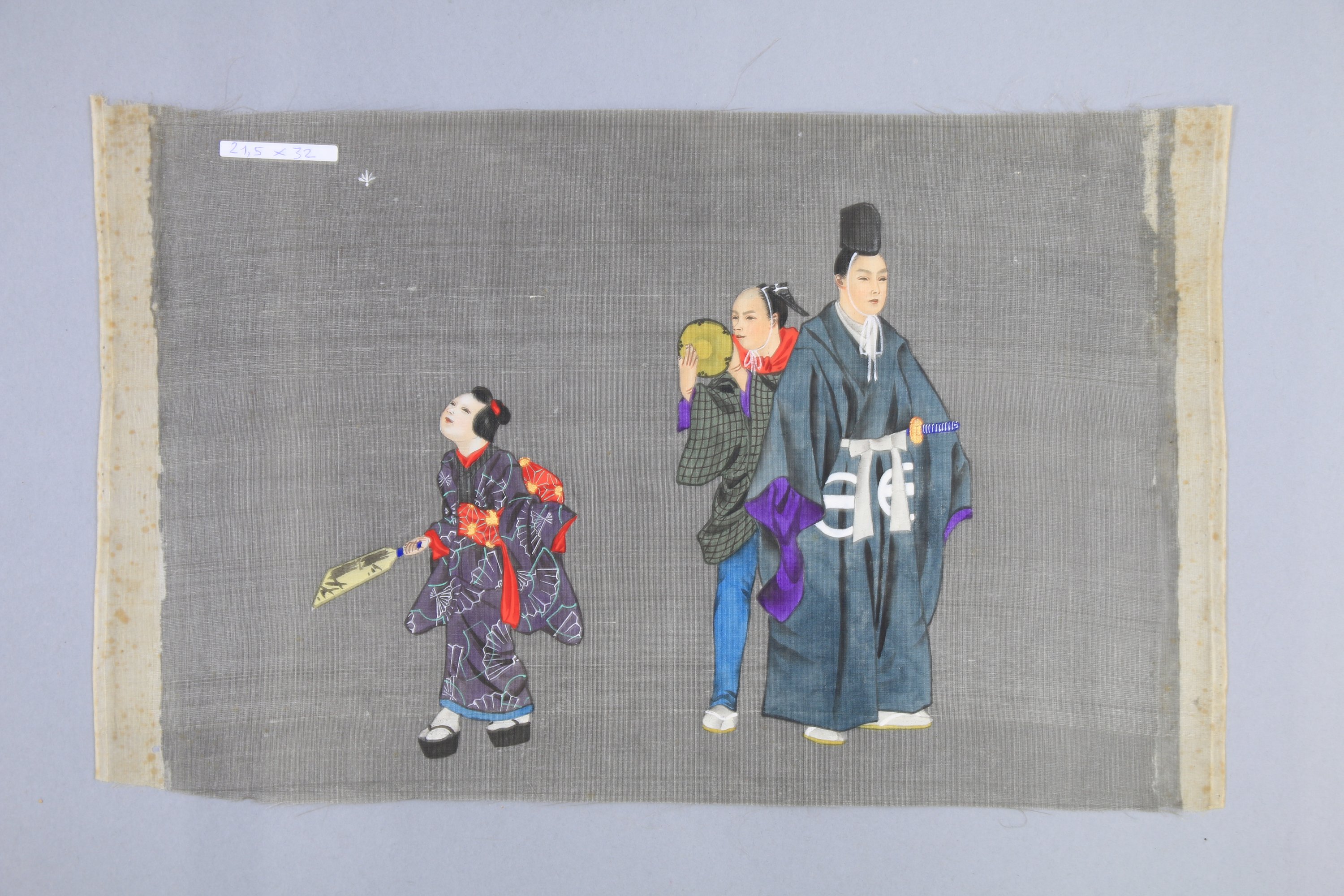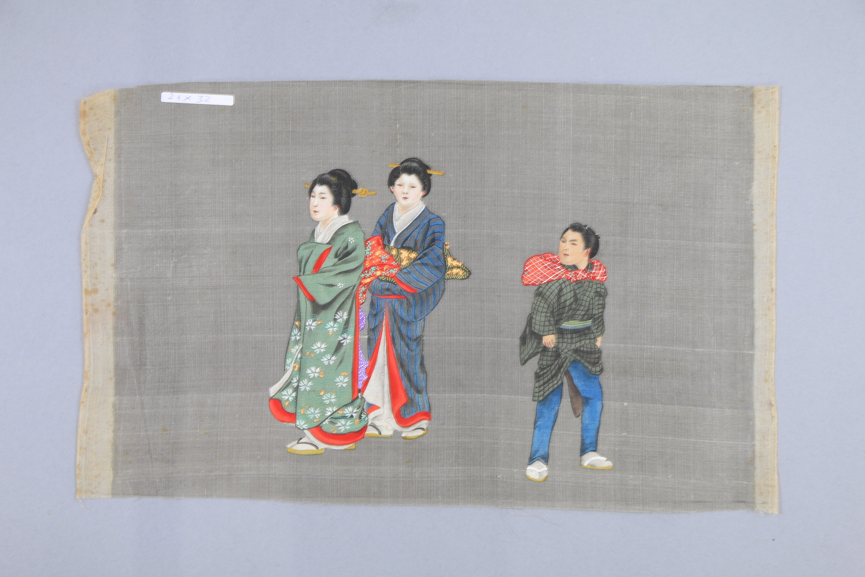 - trois encres sur soie, samouraï, jeunes femmes et enfants. Haut. 22 Larg. 35 cm