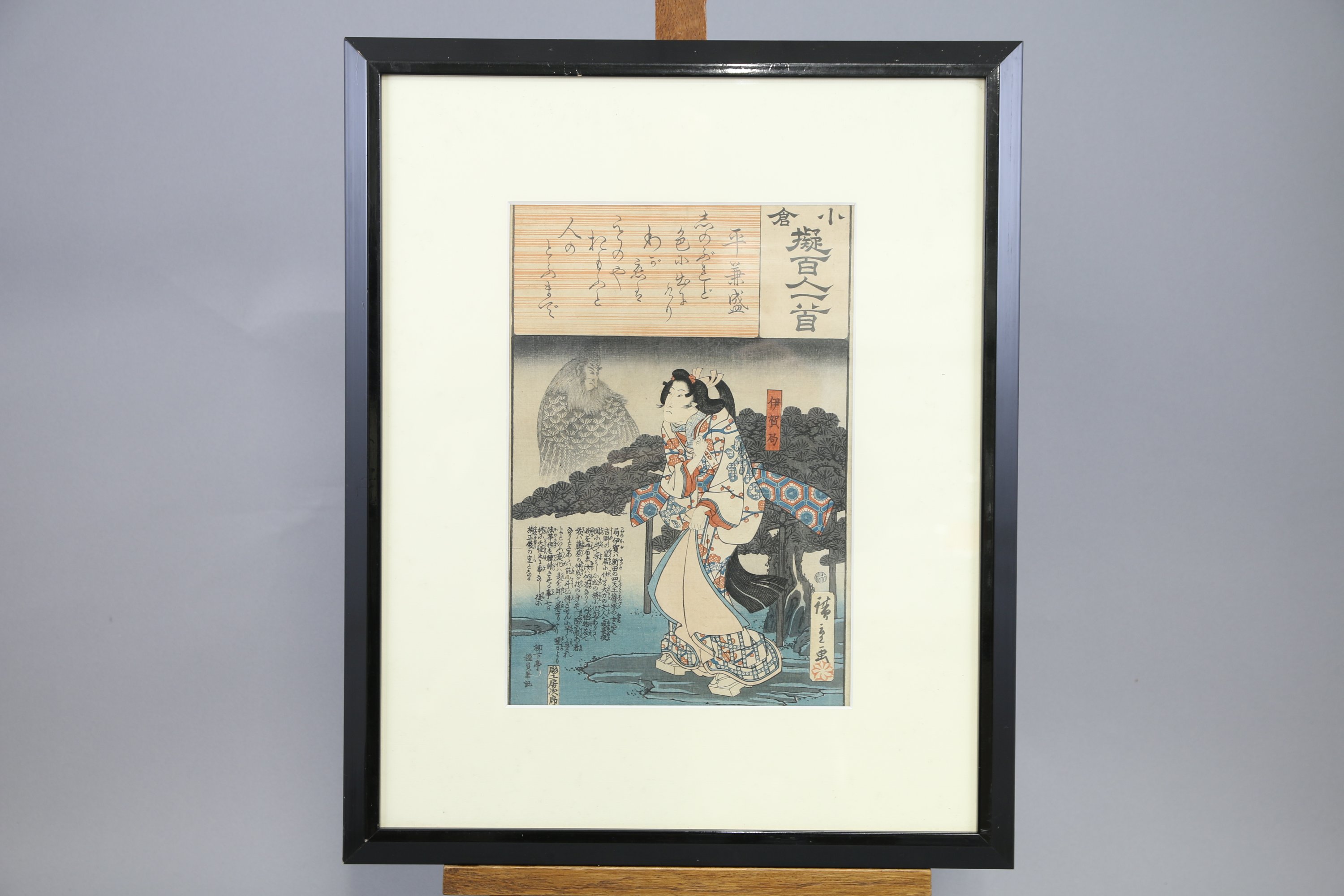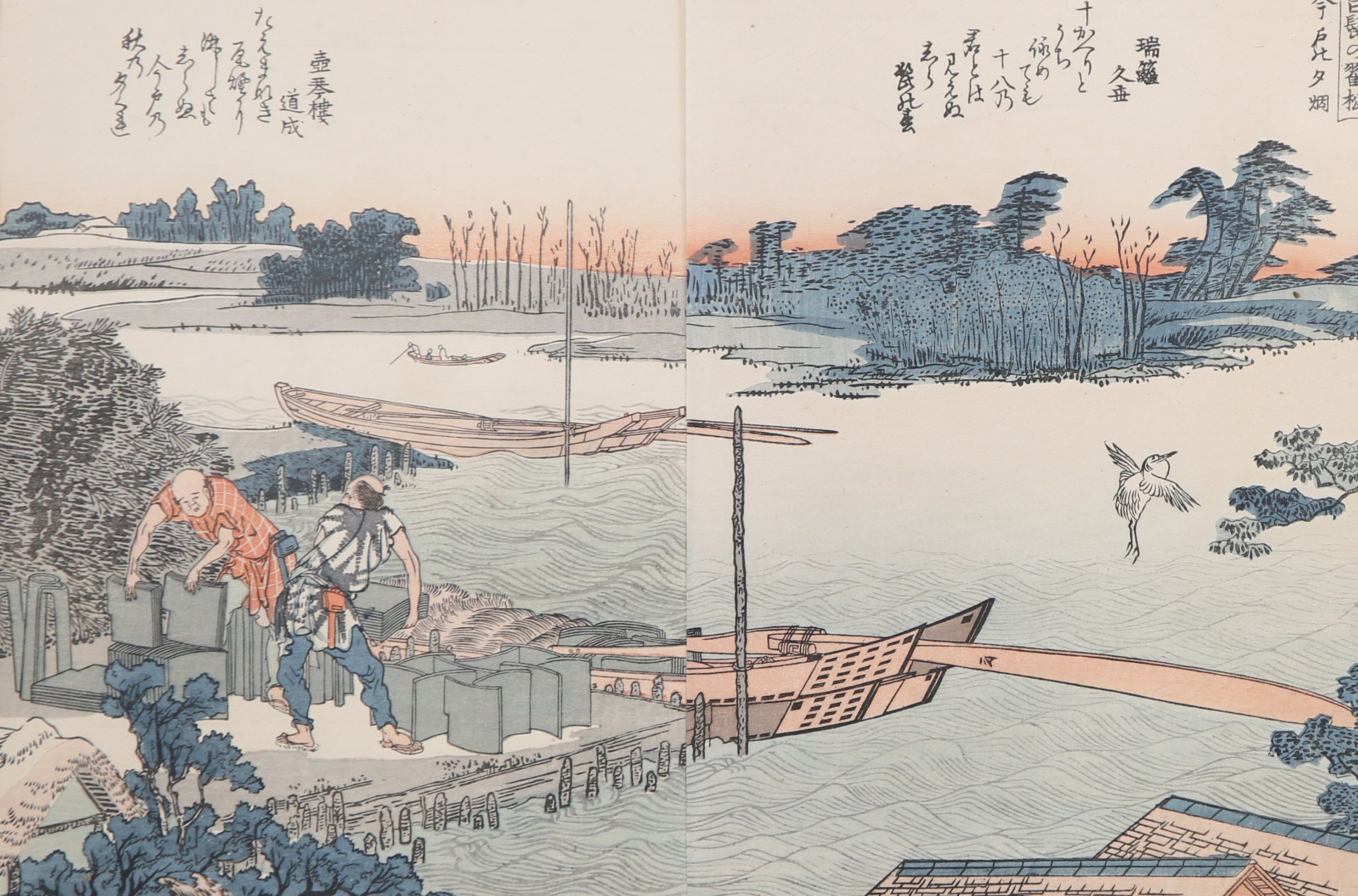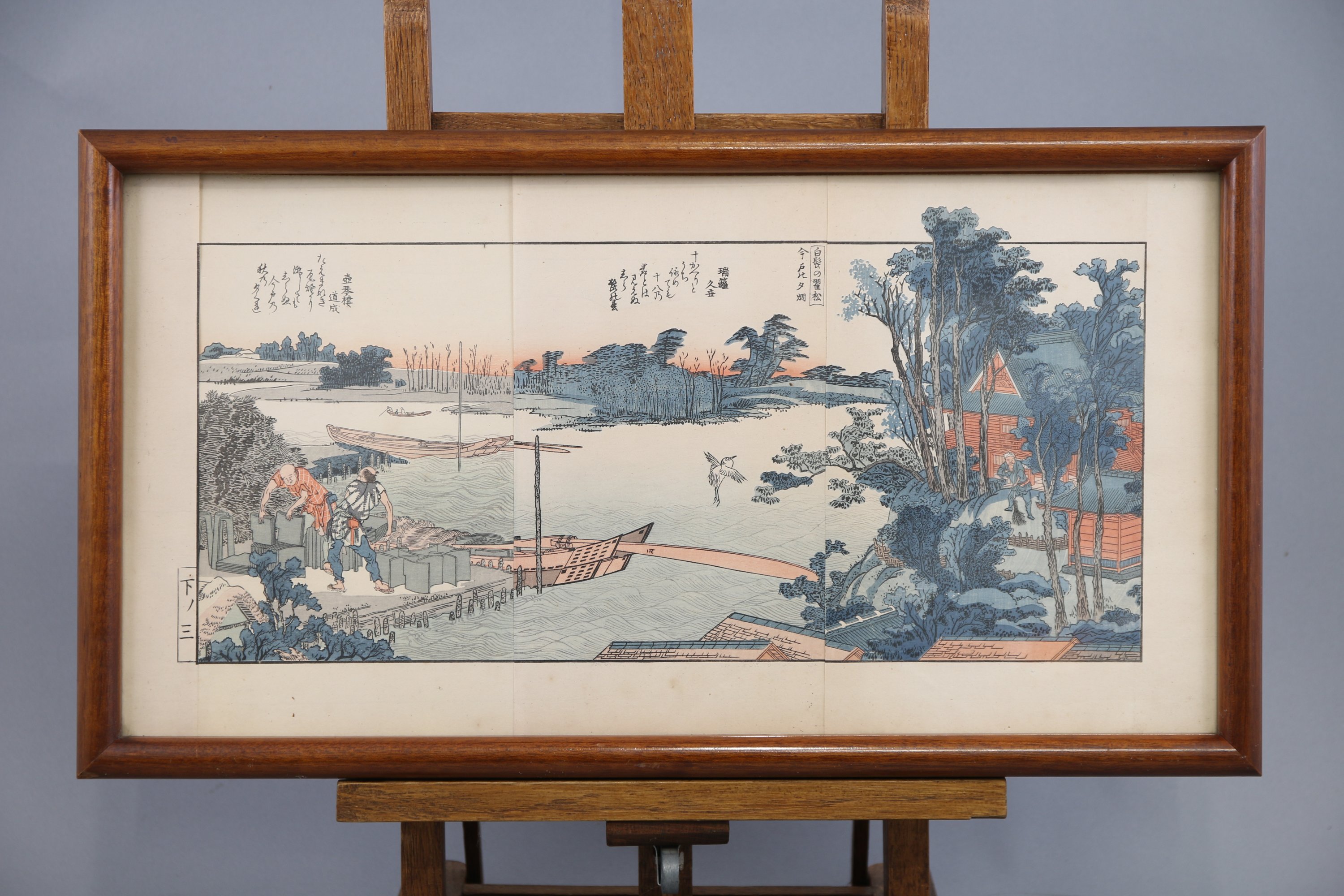 Joint : Japon, retirage d'époque Meiji. Paysage fluvial. Estampes probablement extraites d'un ouvrage. Haut. 27 Larg. 52 cm. Cadre à baguettes en bois.