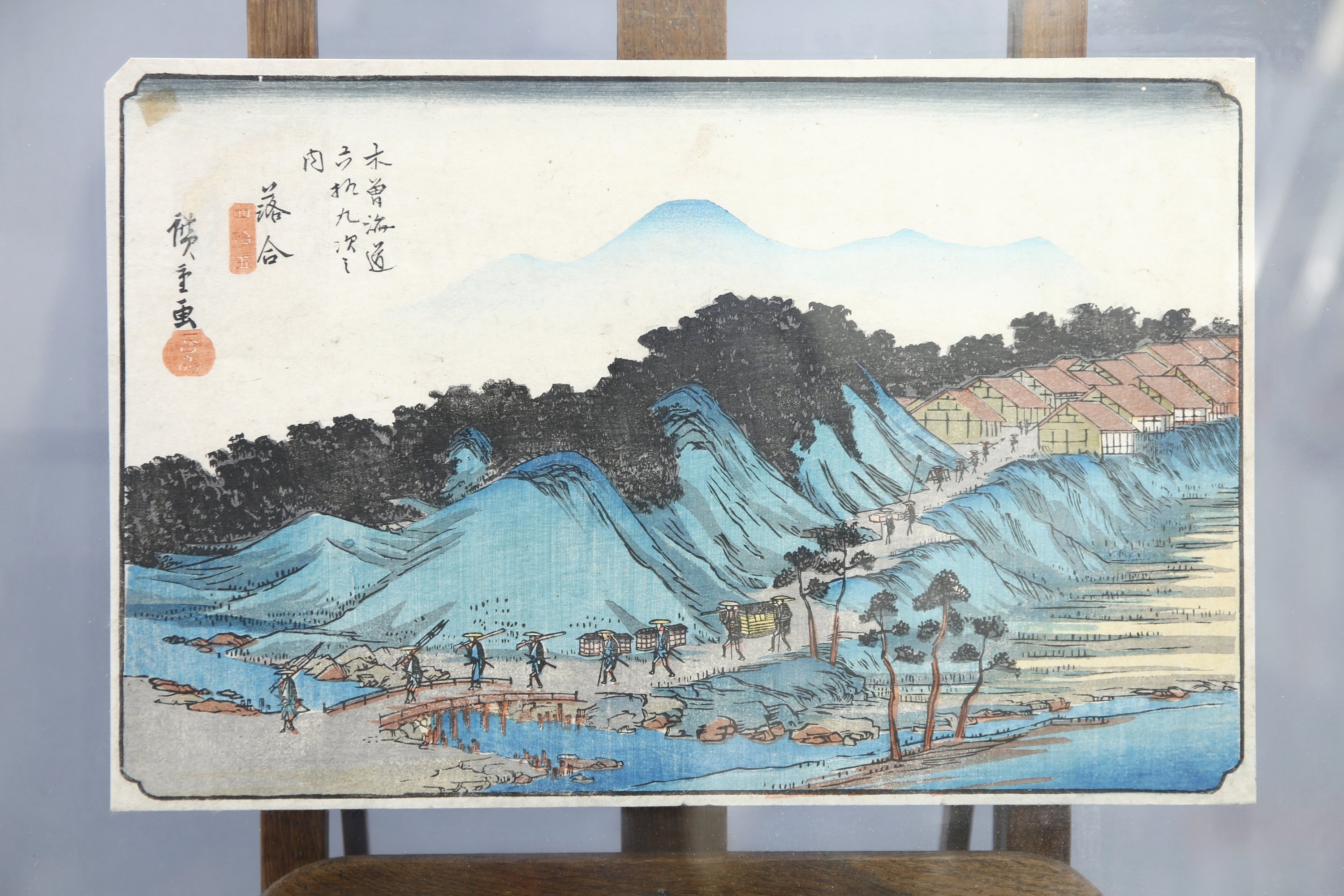 Estampe, oban yoko-e, de la série Kisokaido rokujukyu-tsugi no uchi, Les soixante-neuf stations du Kisokaido, station 45 : Ochiai. Signé Hiroshige ga.