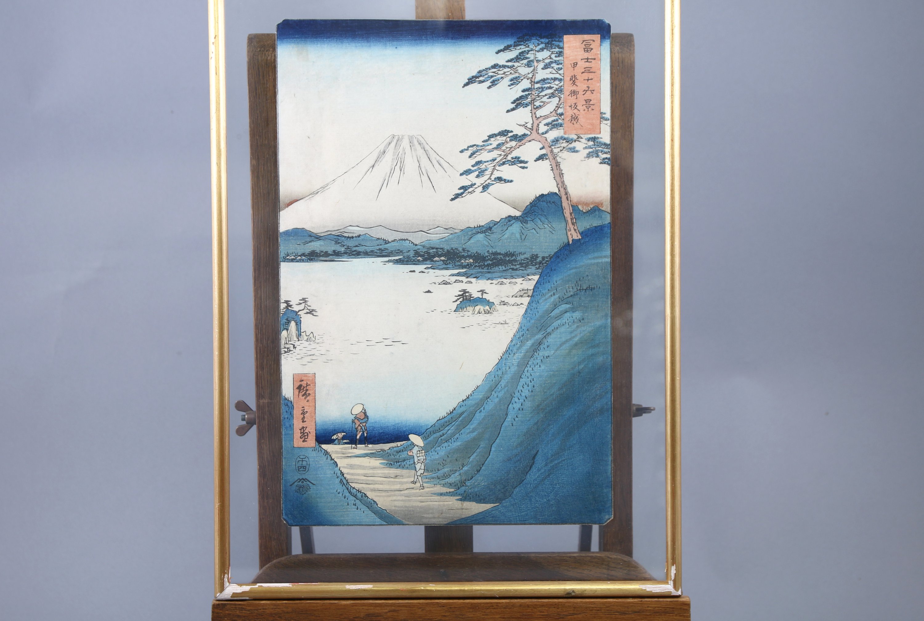 Estampe, oban tate-e, de la série Fuji sanjurokkei, Les trente-six vues du mont Fuji, planche Kai Misakagoe, La passe de Misaka dans la province de Kai.