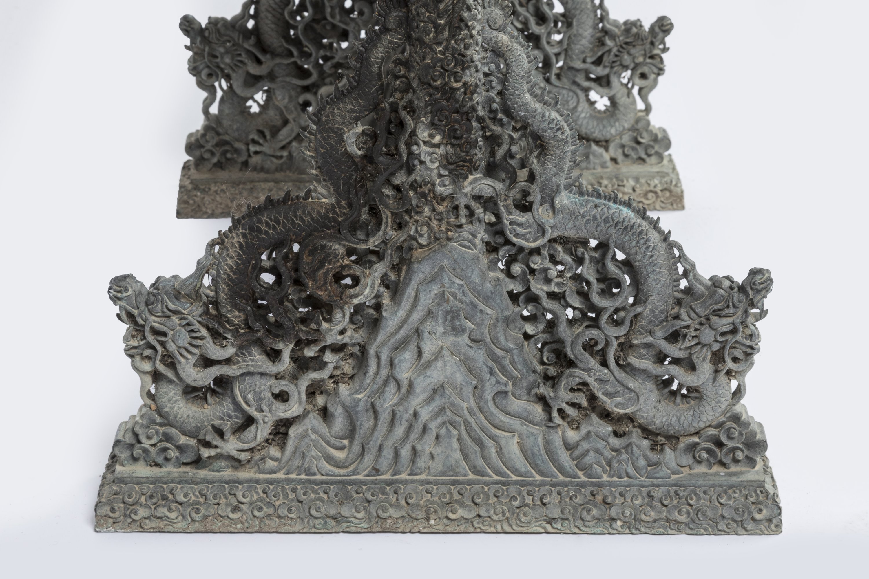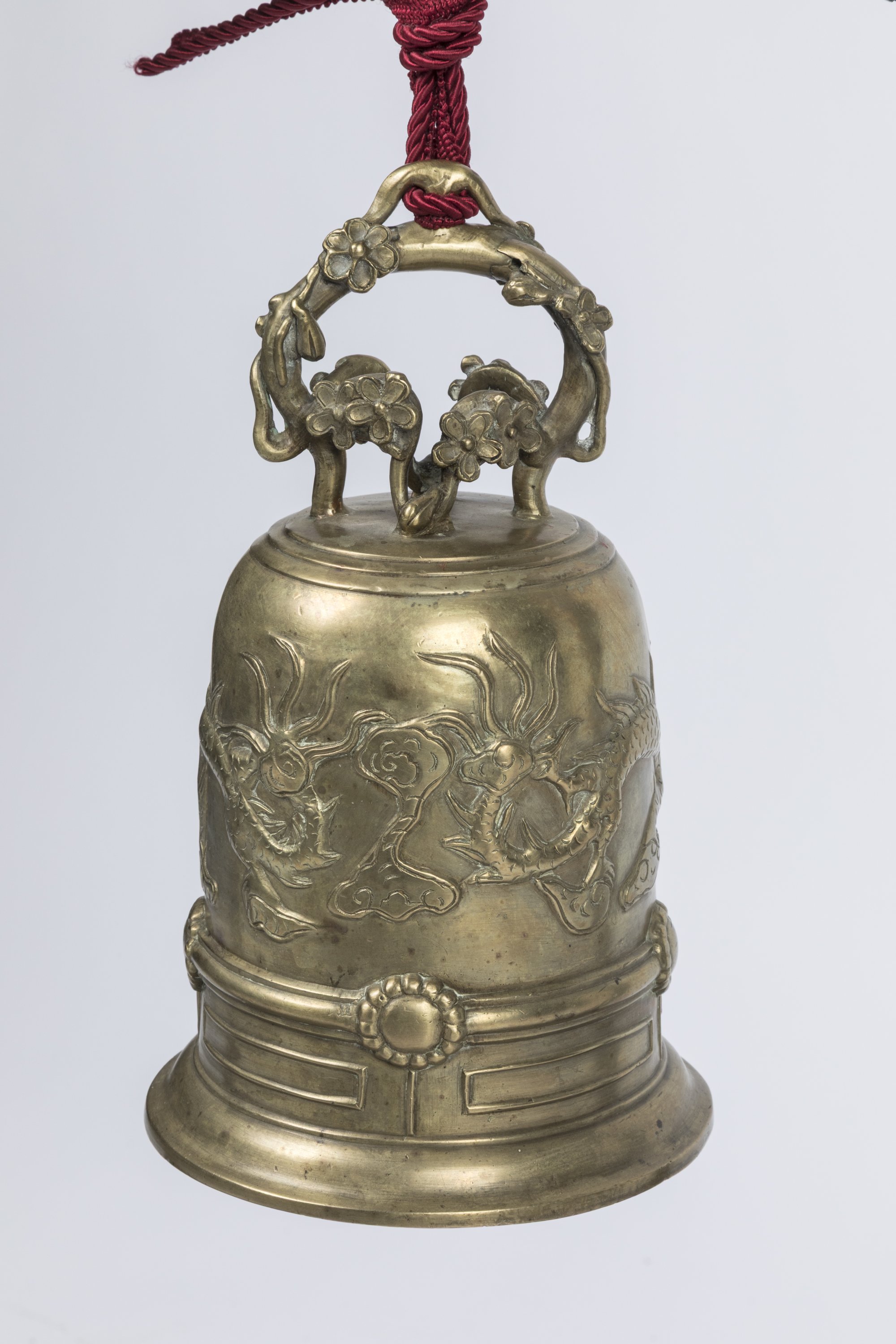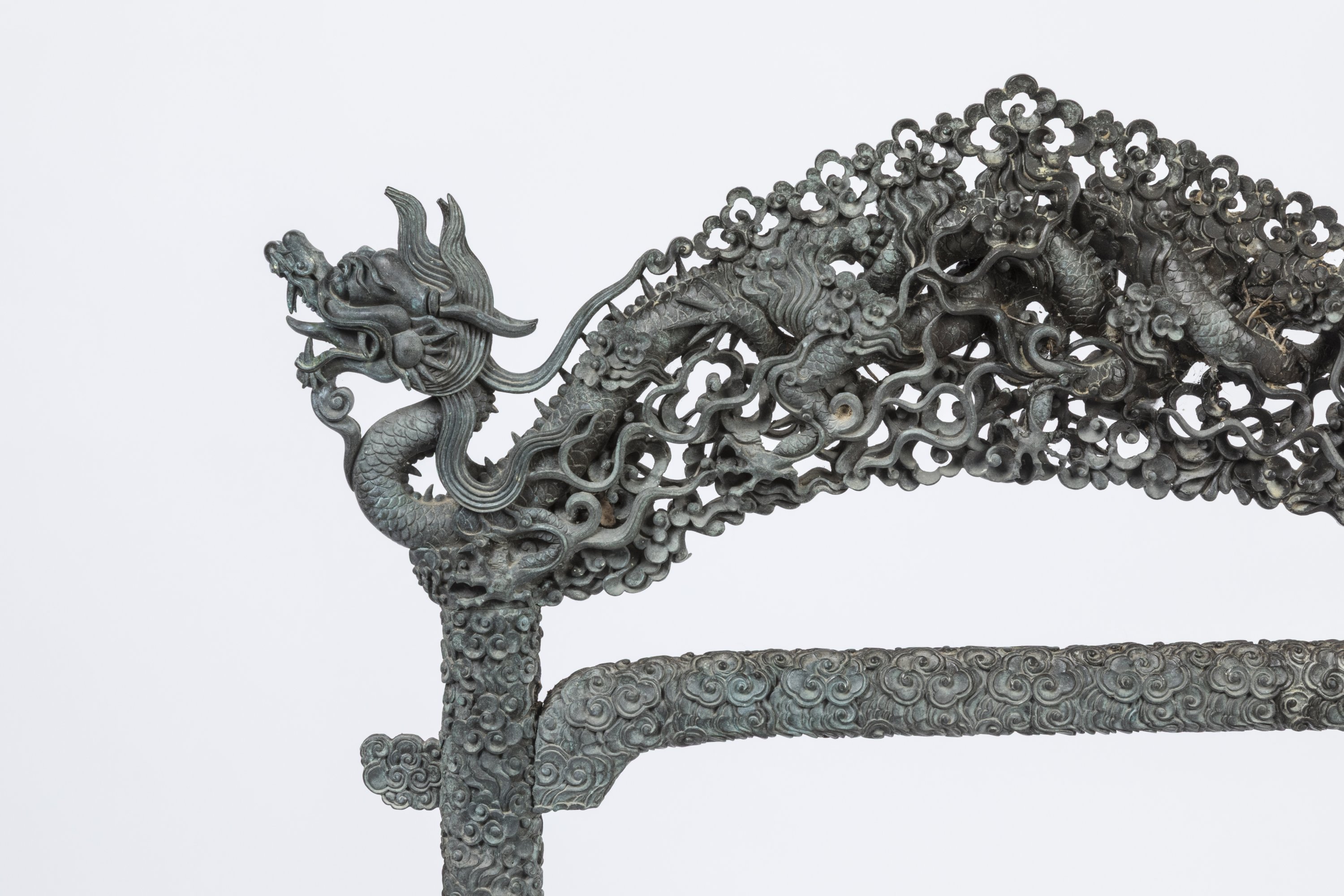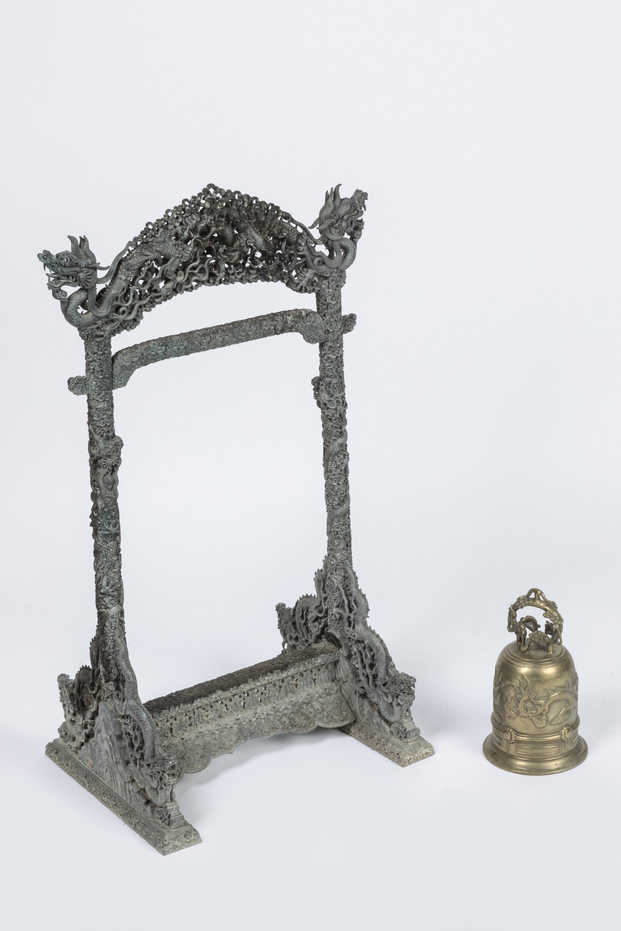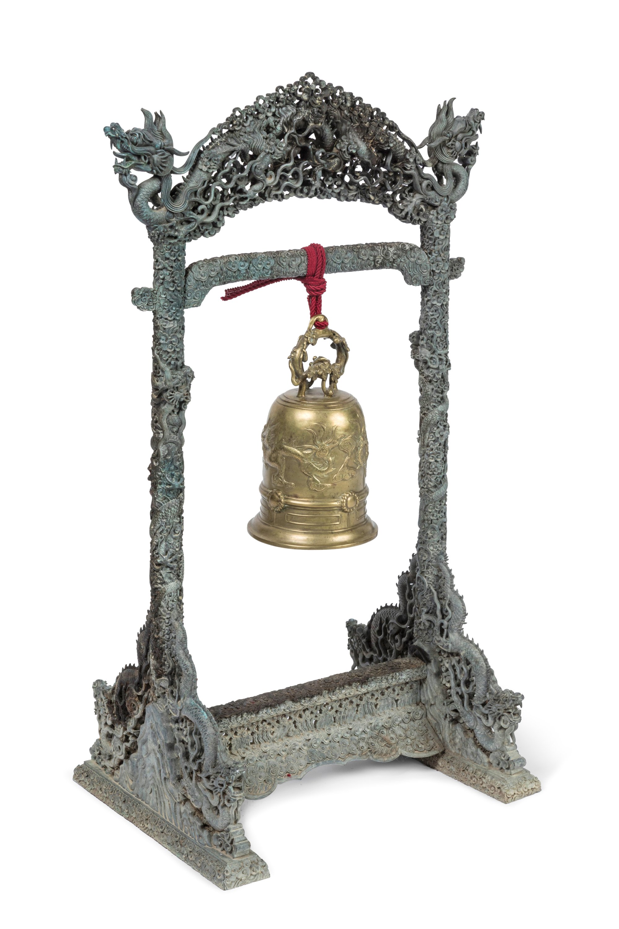 Suspendue à un support en bronze finement orné de multiples dragons dans les nuées formant les pieds et terminant le fronton supérieur, leurs gueules ouvertes, leurs corps s'enroulant autour des montants du support. Haut. 81 Larg. 41 Prof. 32 cm.
