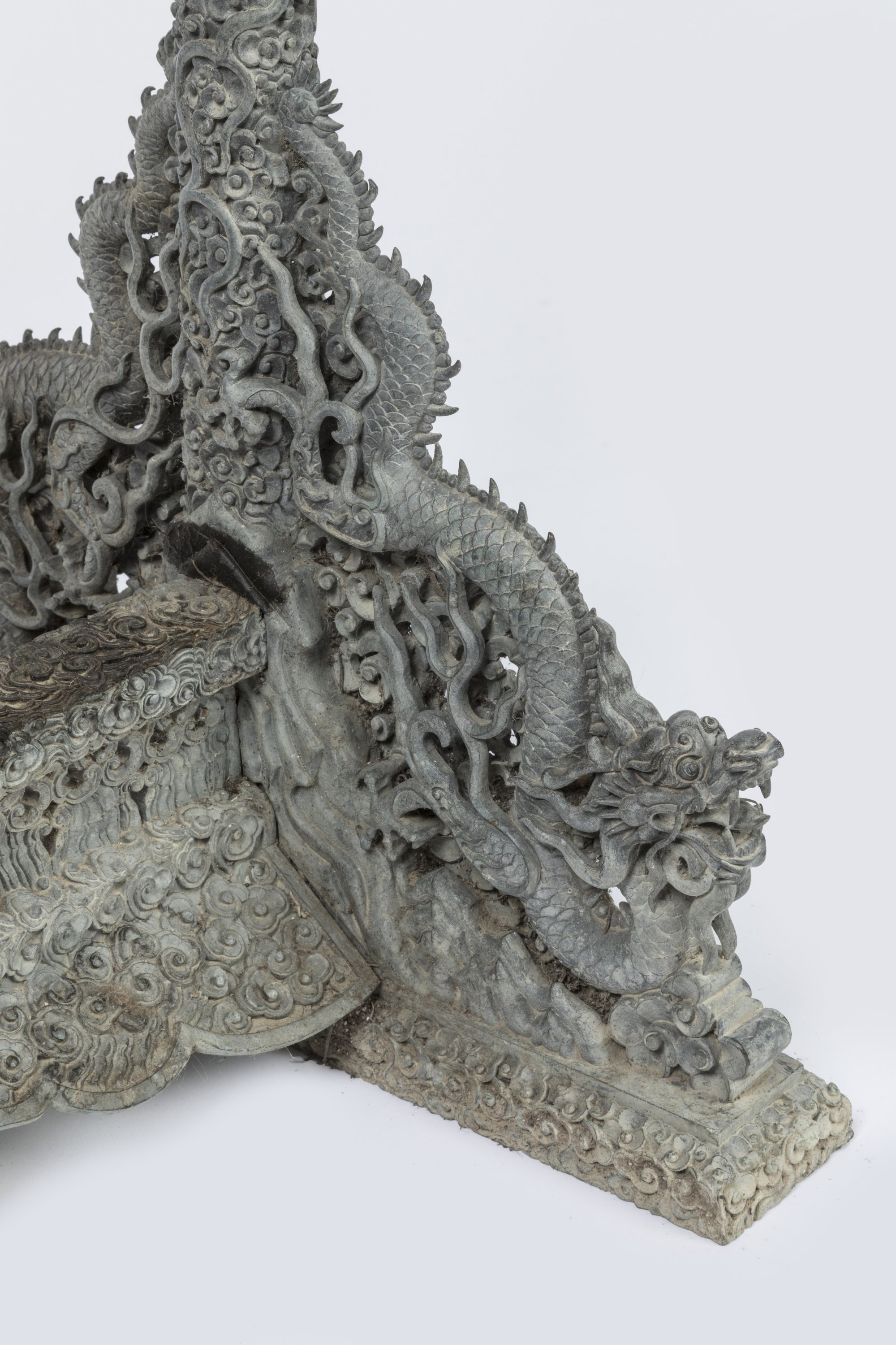 Deux dragons affrontés autour de la perle flammée, l'anse en forme de branches de prunus en fleurs.