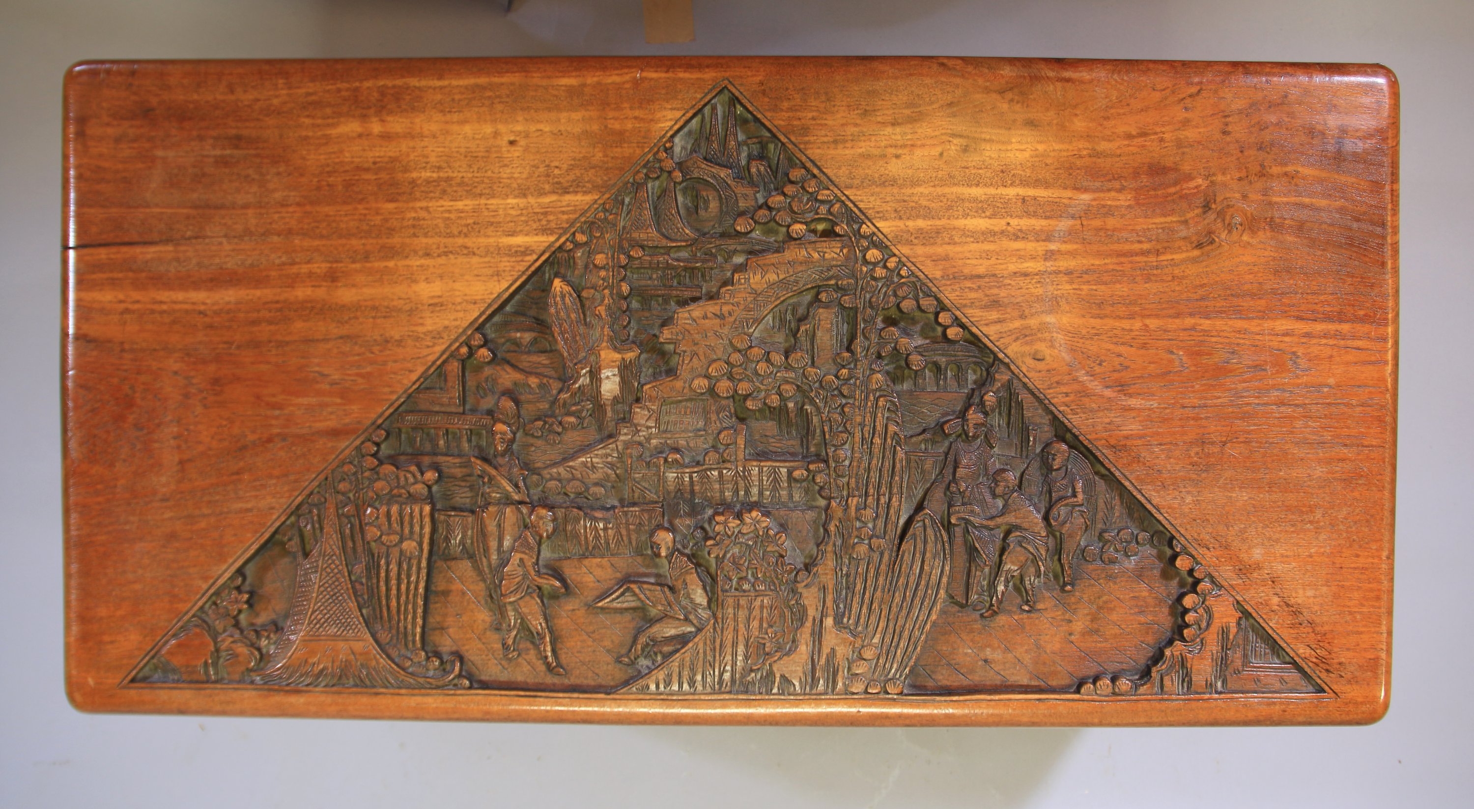 A décor de scènes de palais sur la façade et le couvercle. Le verrou en laiton gravé de végétaux et de motifs géométriques.