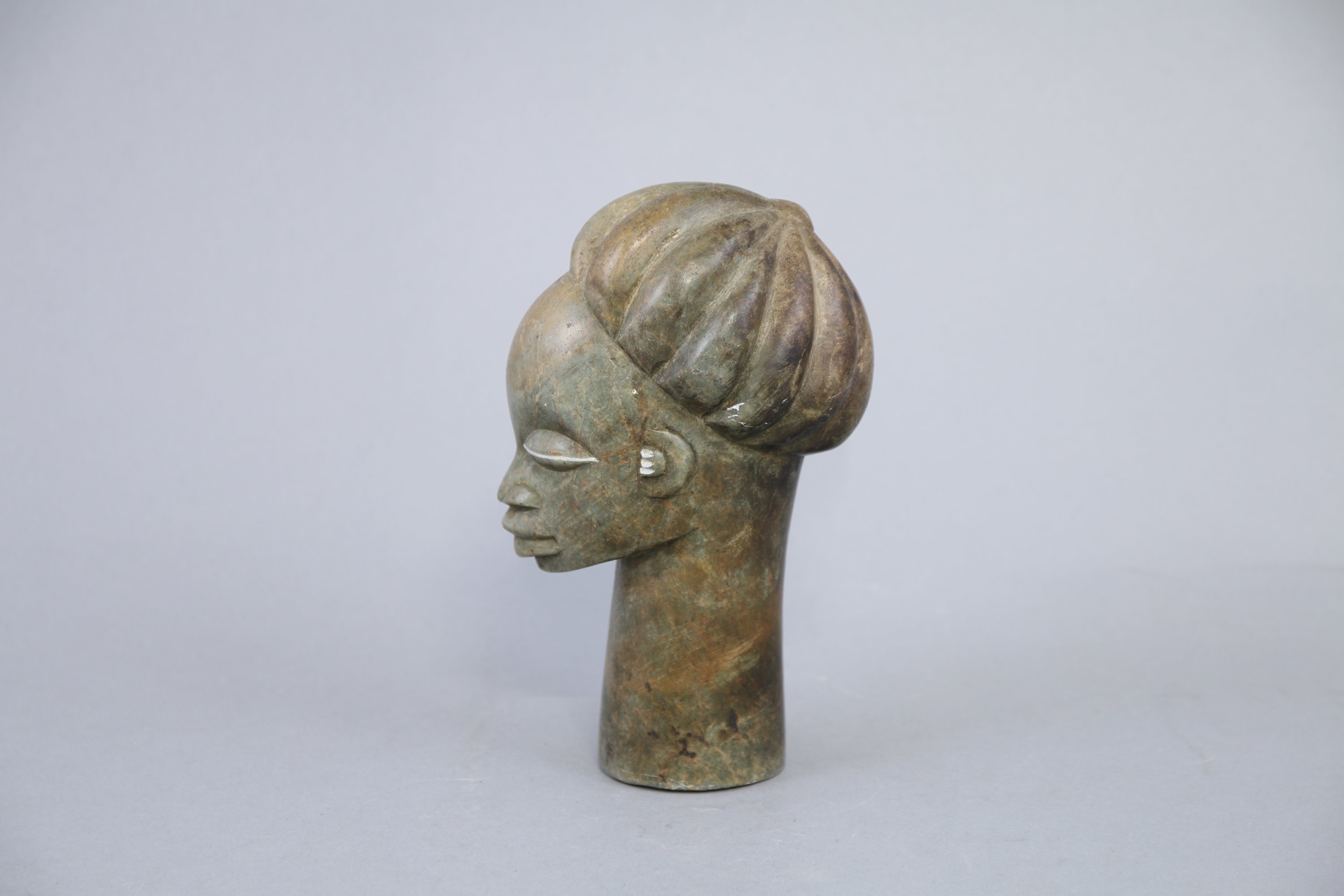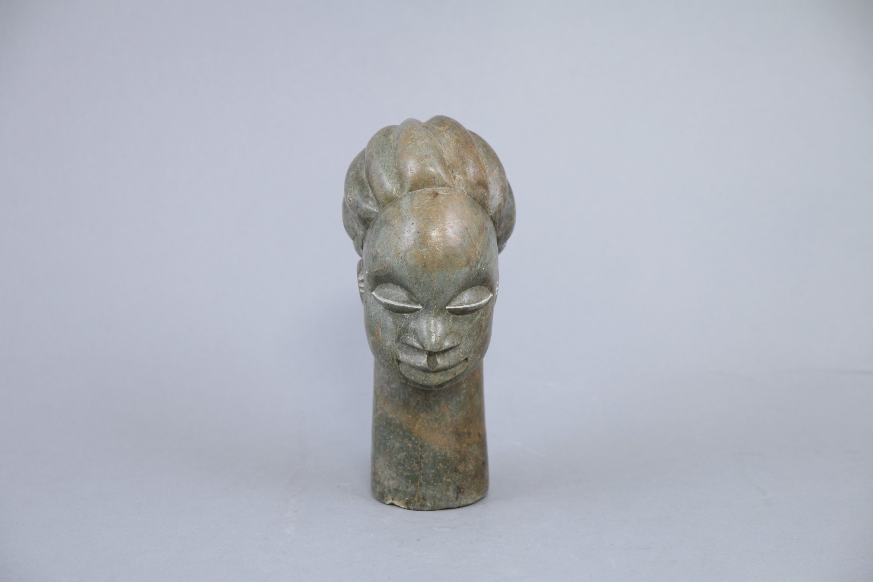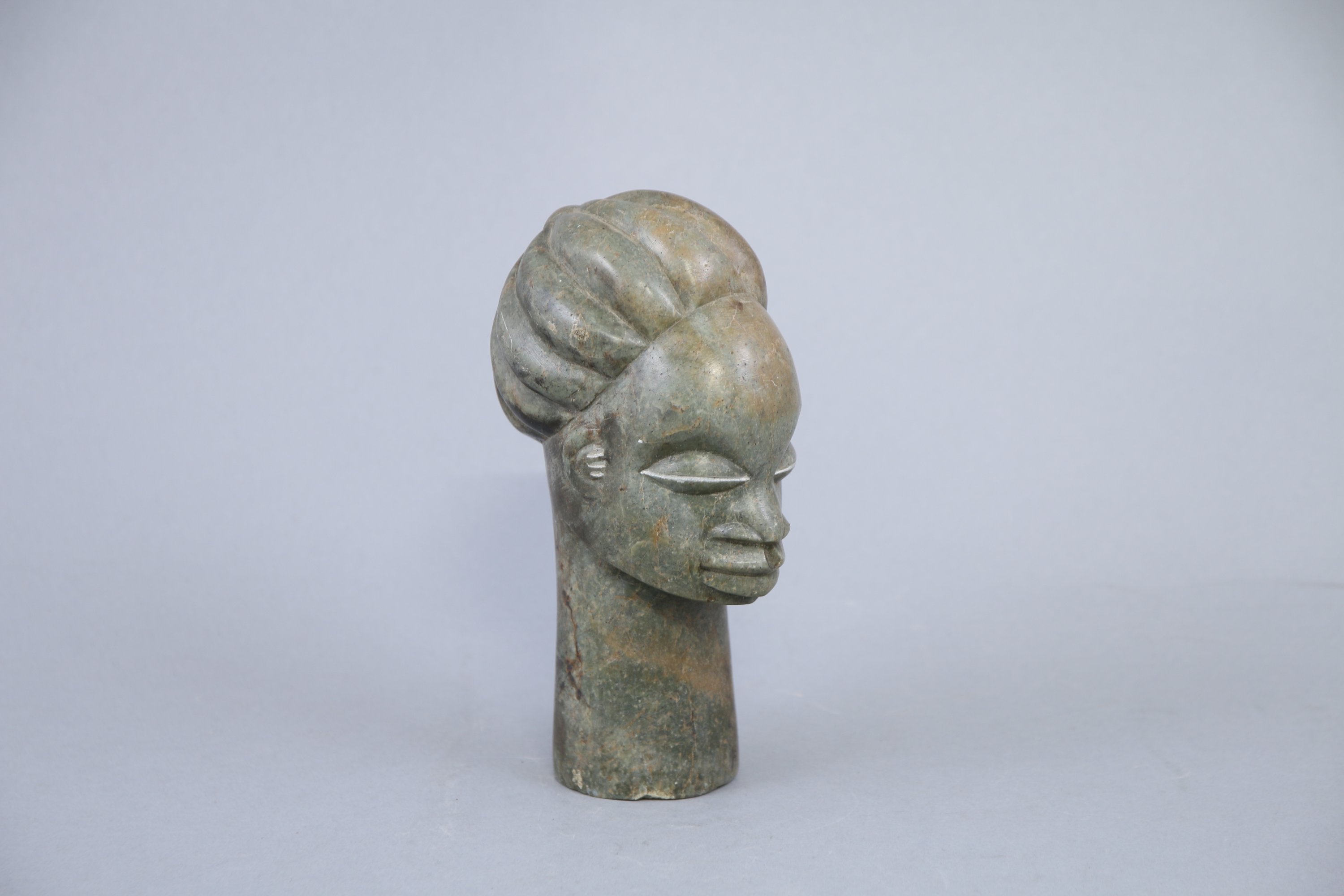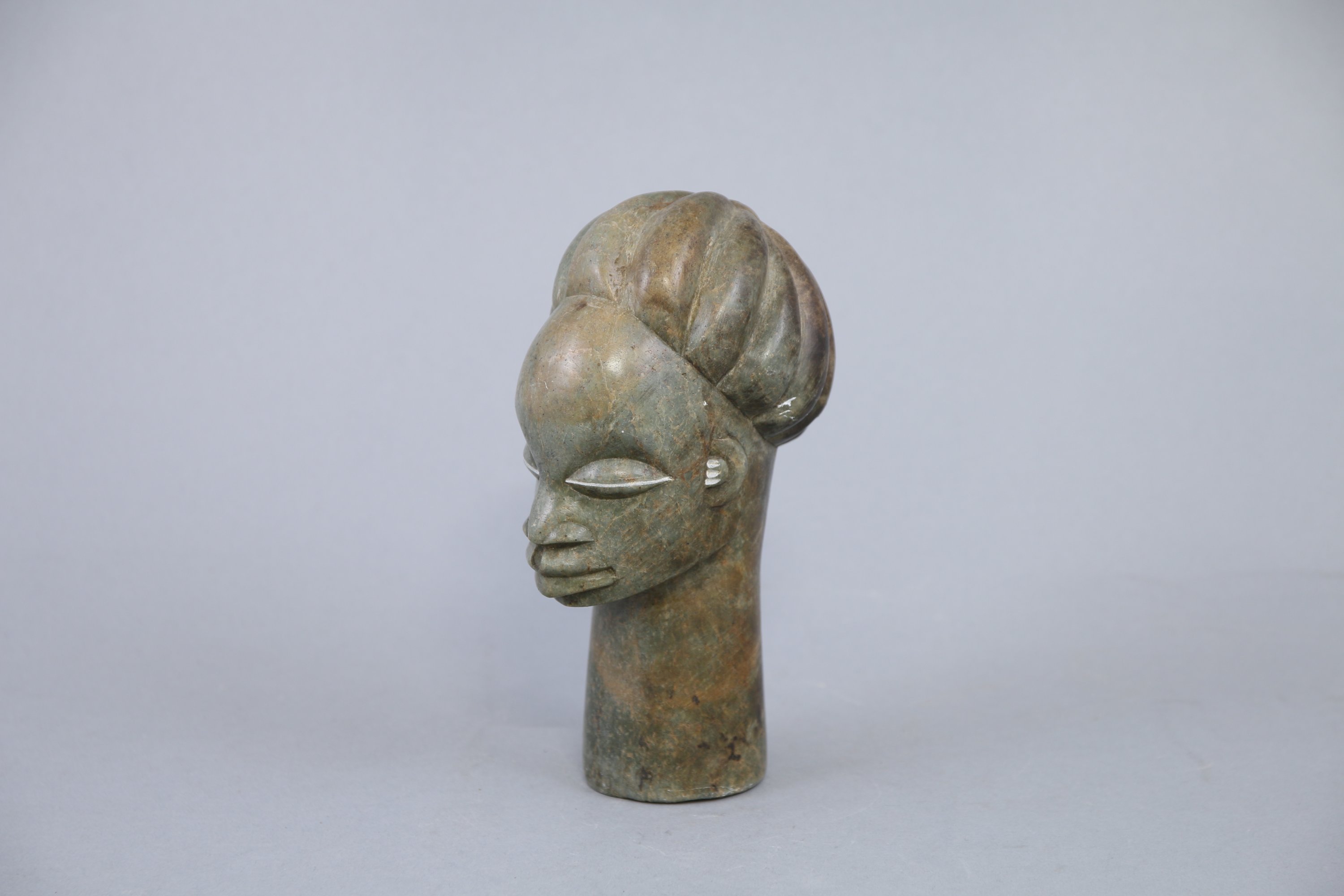 Pierre sculptée au visage serein et la coiffure à grosses nattes.