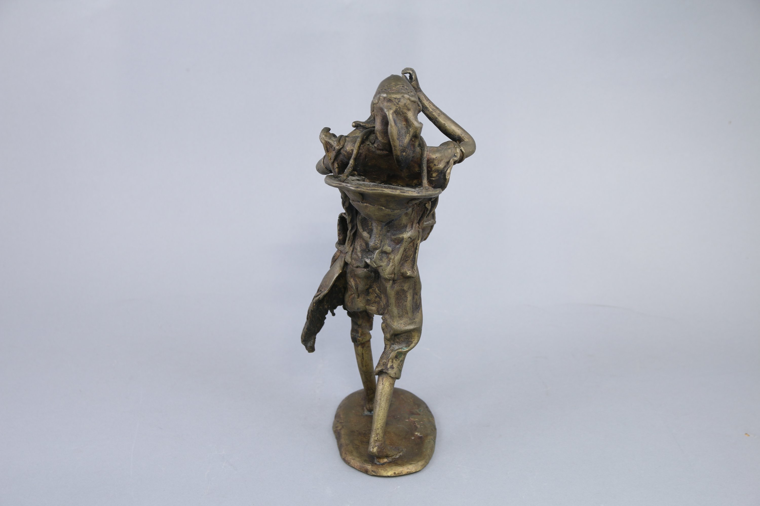 Statue représentant un tambourinaire sérère debout sur une base ovale, la tête penchée en arrière et les yeux levés vers le ciel