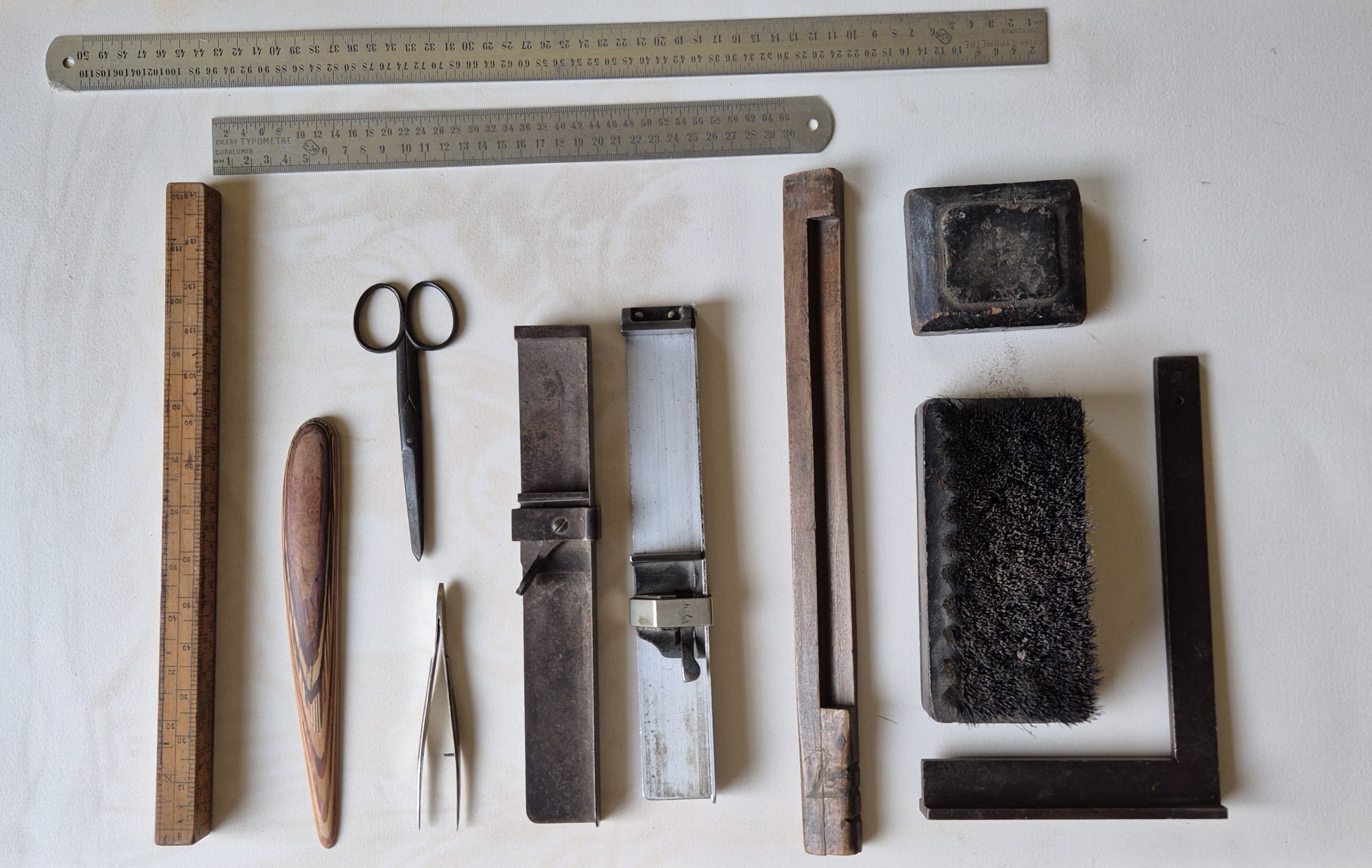 une règle typomètre en cuivre, typomètre métallique, composteur ayant appartenu à un pressier d’Auguste Lepère, composteur ayant appartenu à Robert Blanchet, lignomètre en point Didot, plioir en bois, pince typo, brosse à décrasser le bloc de composition, ciseau de mise en train, taquoir, une galée.
