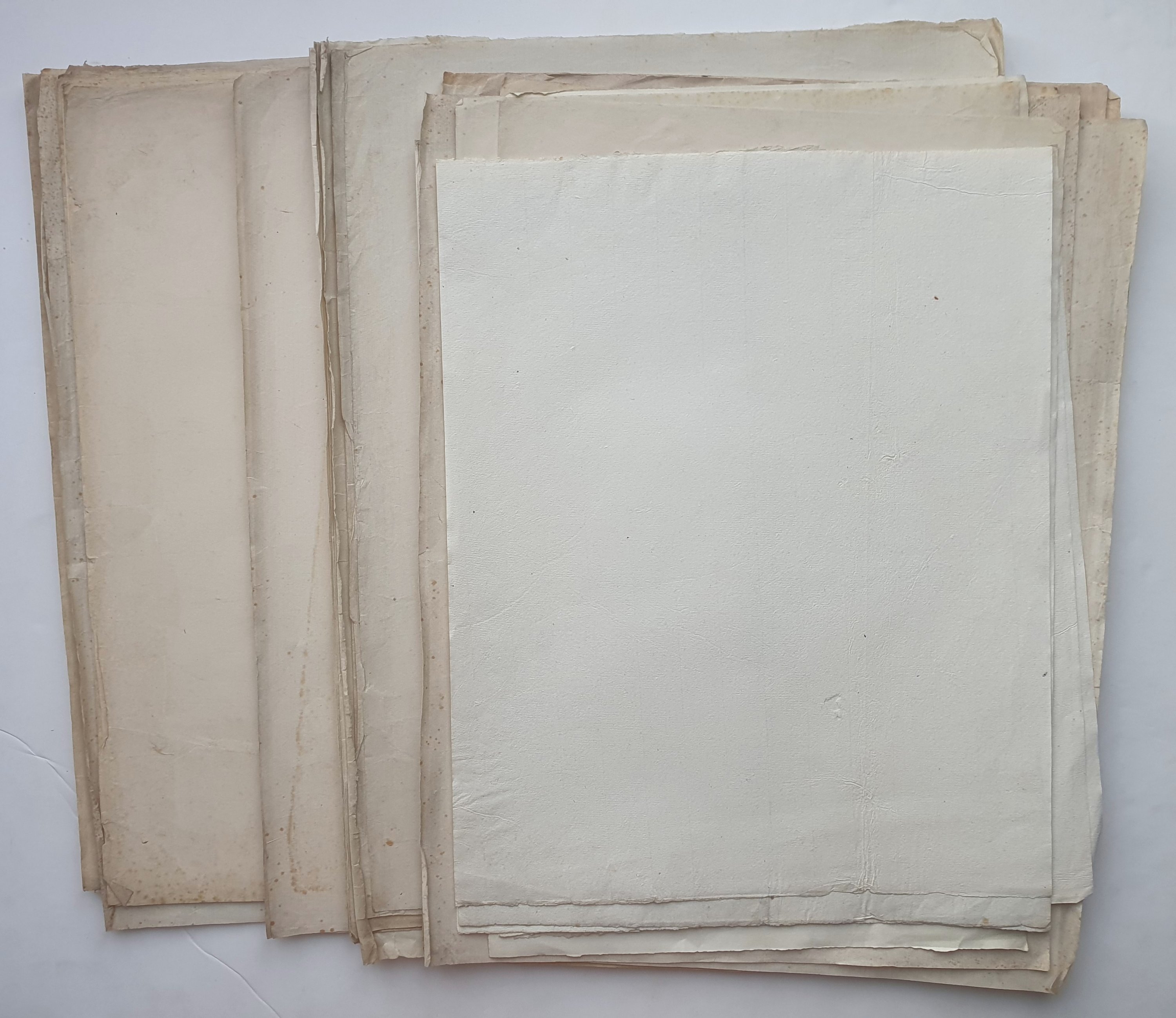 Rarissime réunion de + de 230 feuilles vierges, fabrication artisanale, à vergeures, certaines filigranées, formats divers (54 x 40 cm pour les plus grandes), comprenant notamment :