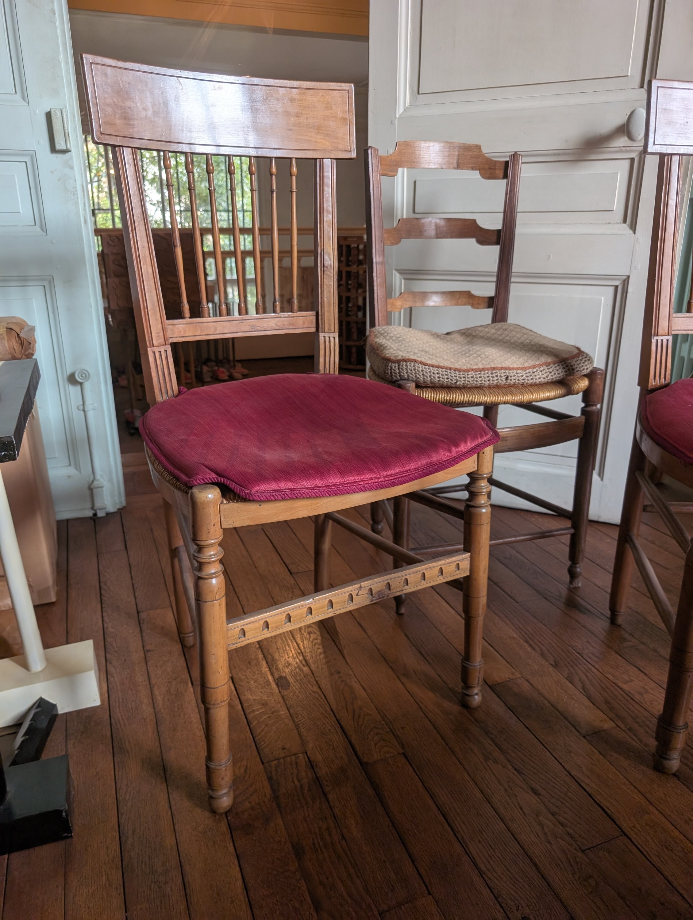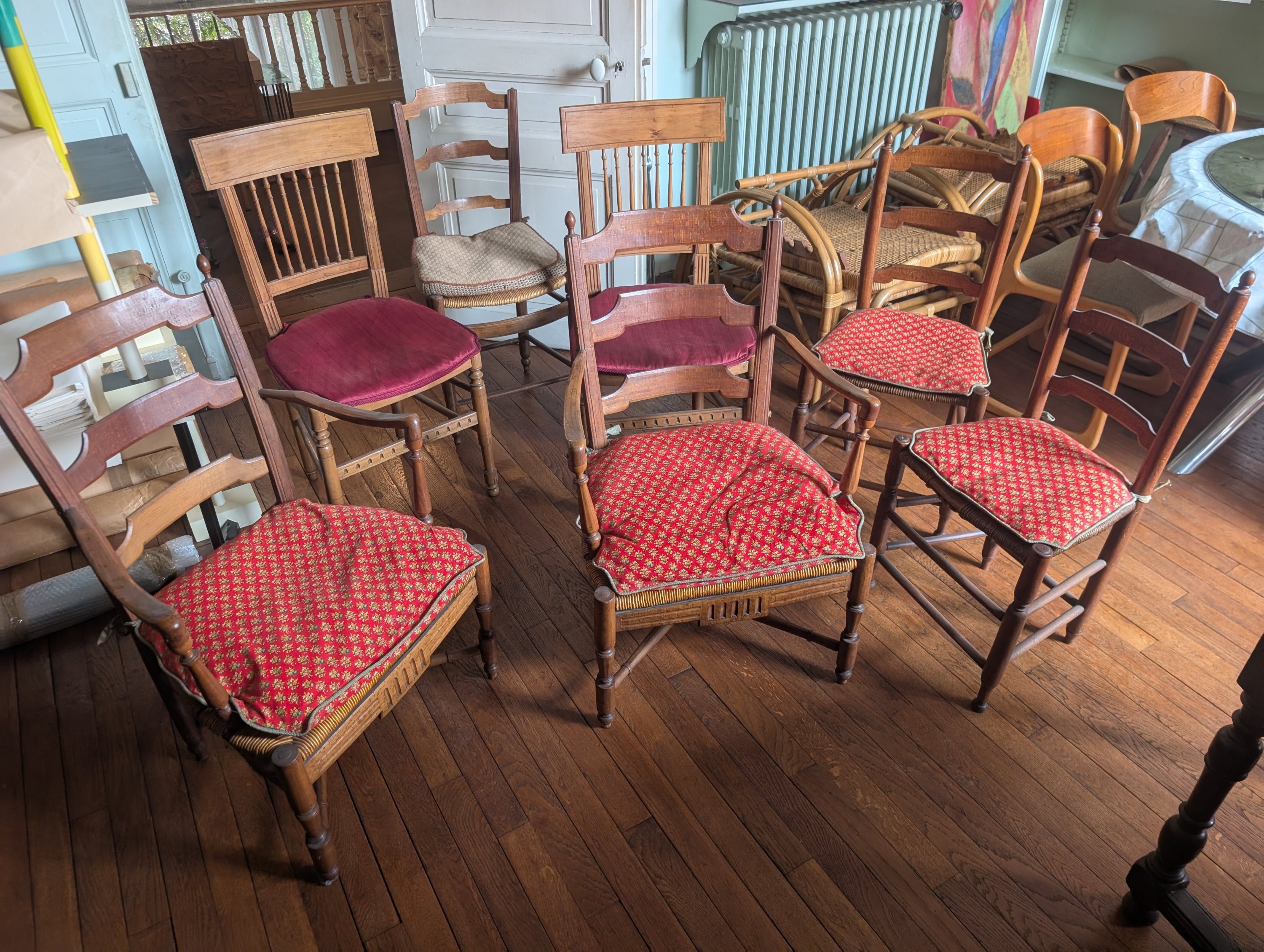 Paire de chaises Louis XVI avec leur dossier à barreaux, paire de fauteuils provençaux avec leurs entretoises en X une paire de chaises au dossier surmonté d'une pomme de pin et une chaise au dossier légèrement cabriolet.
