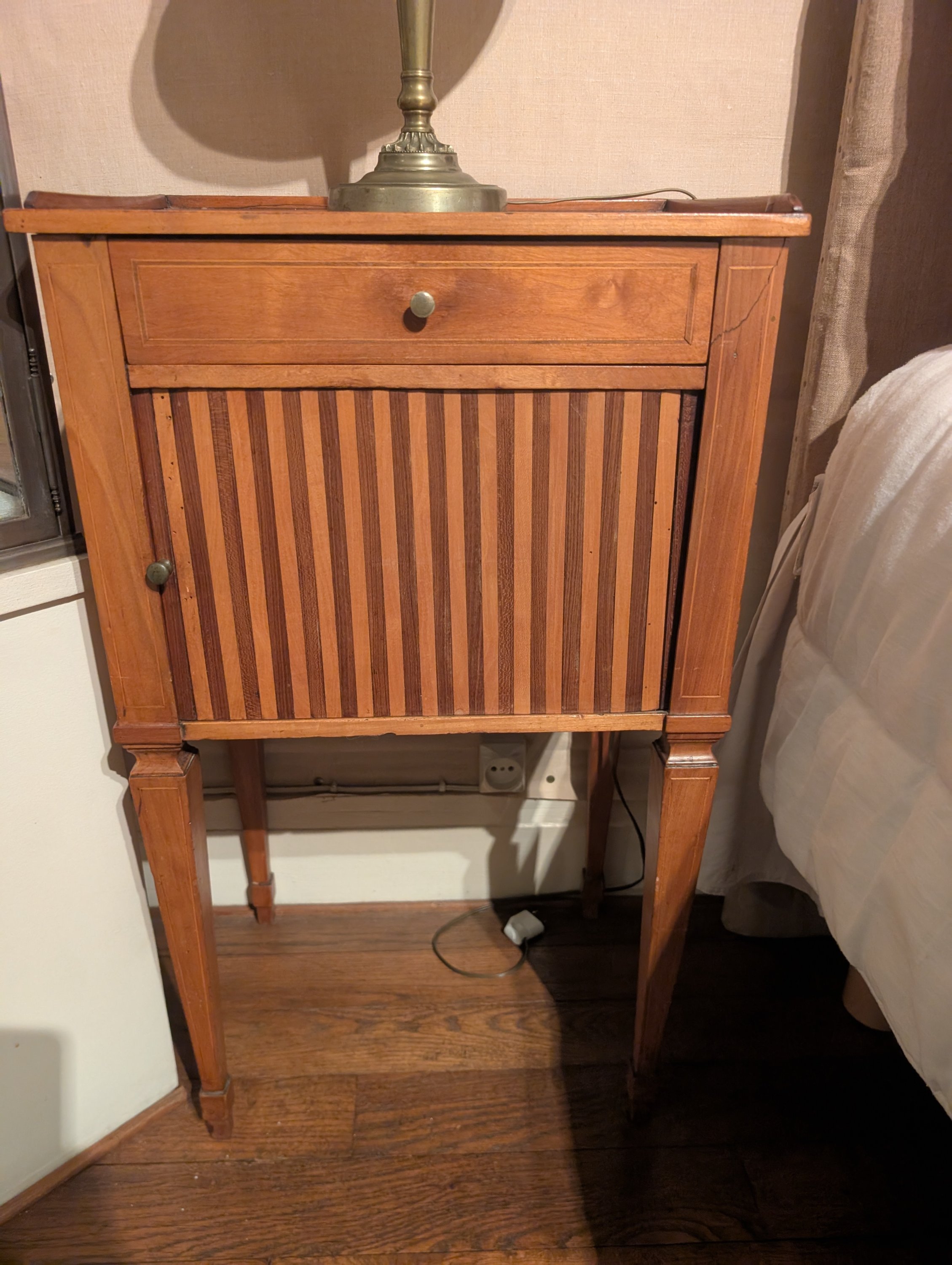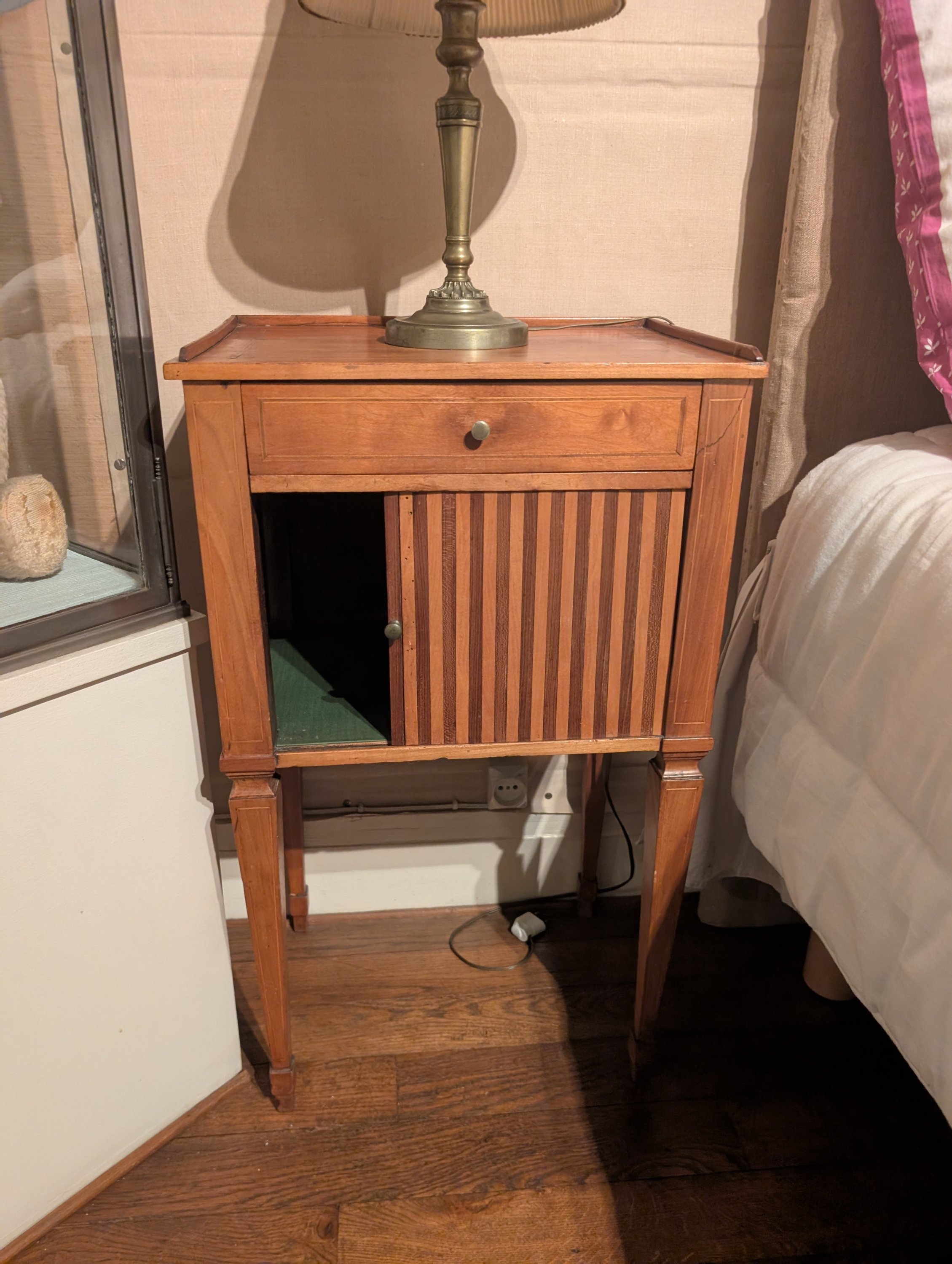 Joint : un petit chevet à casier ouvert en bois naturel de style transition Louis XV ou Louis XVI.