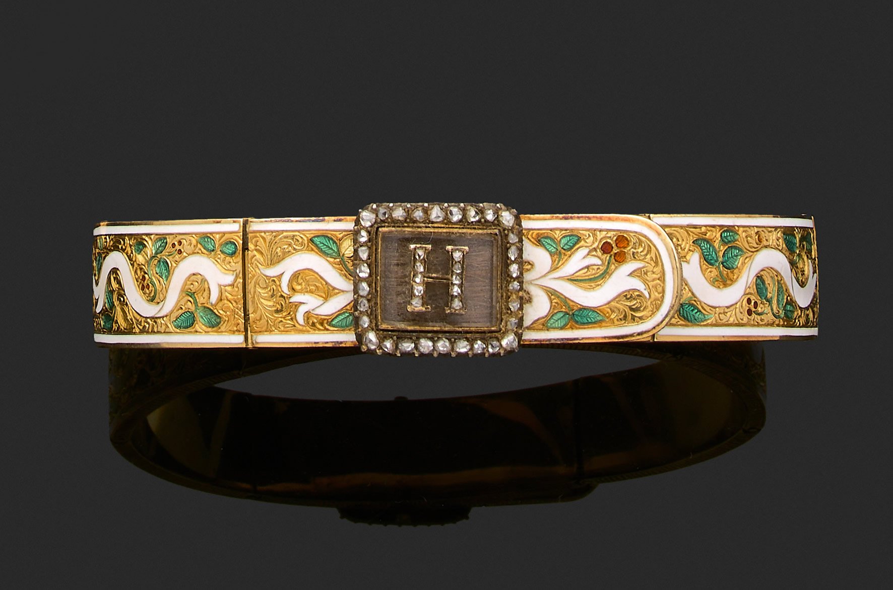 Le centre figurant une boucle de ceinture, décoré de la lettre H ornée de diamants et renfermant des cheveux sous verre.