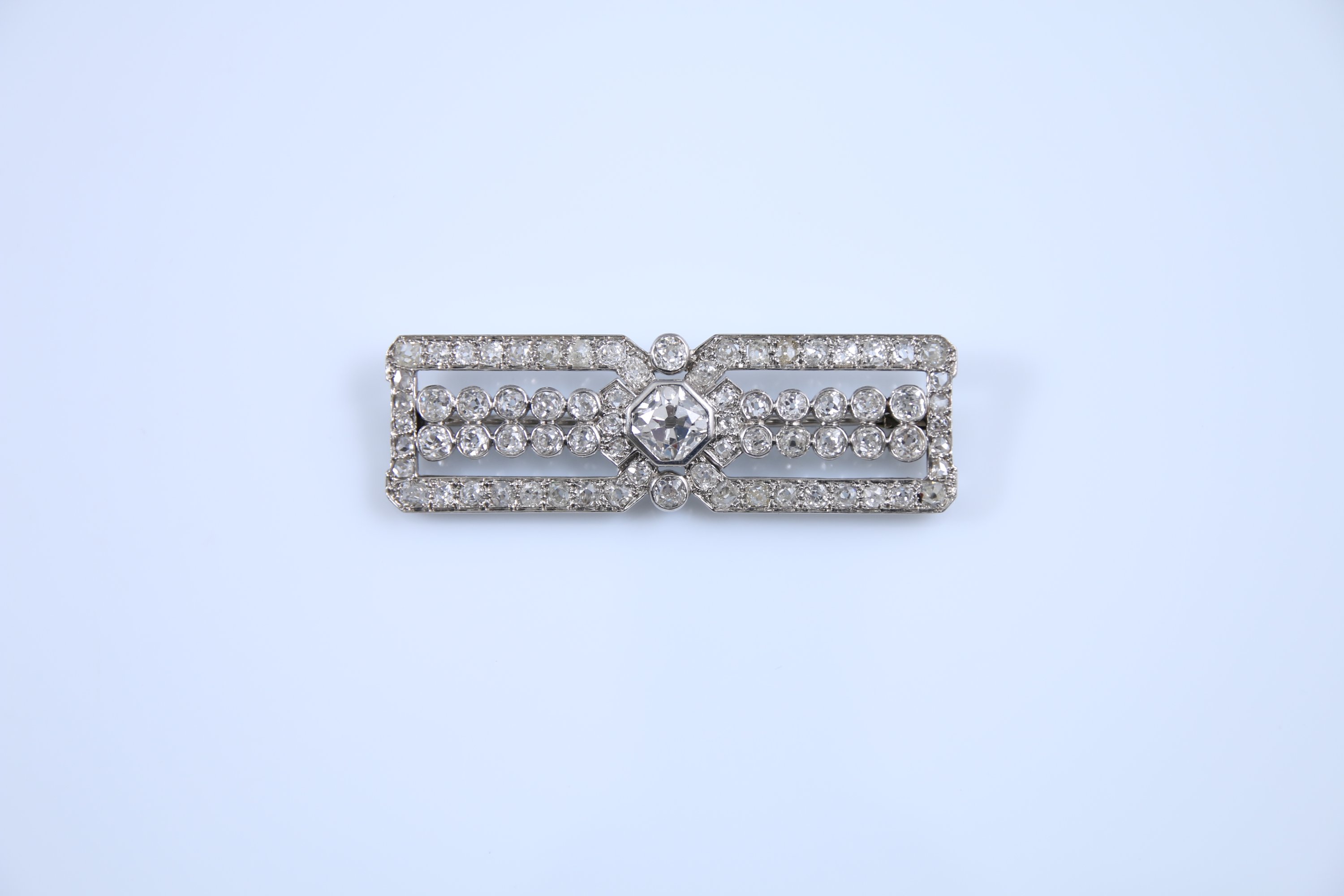 Or 750 millièmes et platine 850 millièmes ajourés, à décor géométrique entièrement serti de diamants taillés en rose ou ronds et coussins de taille ancienne, celui du centre plus important.