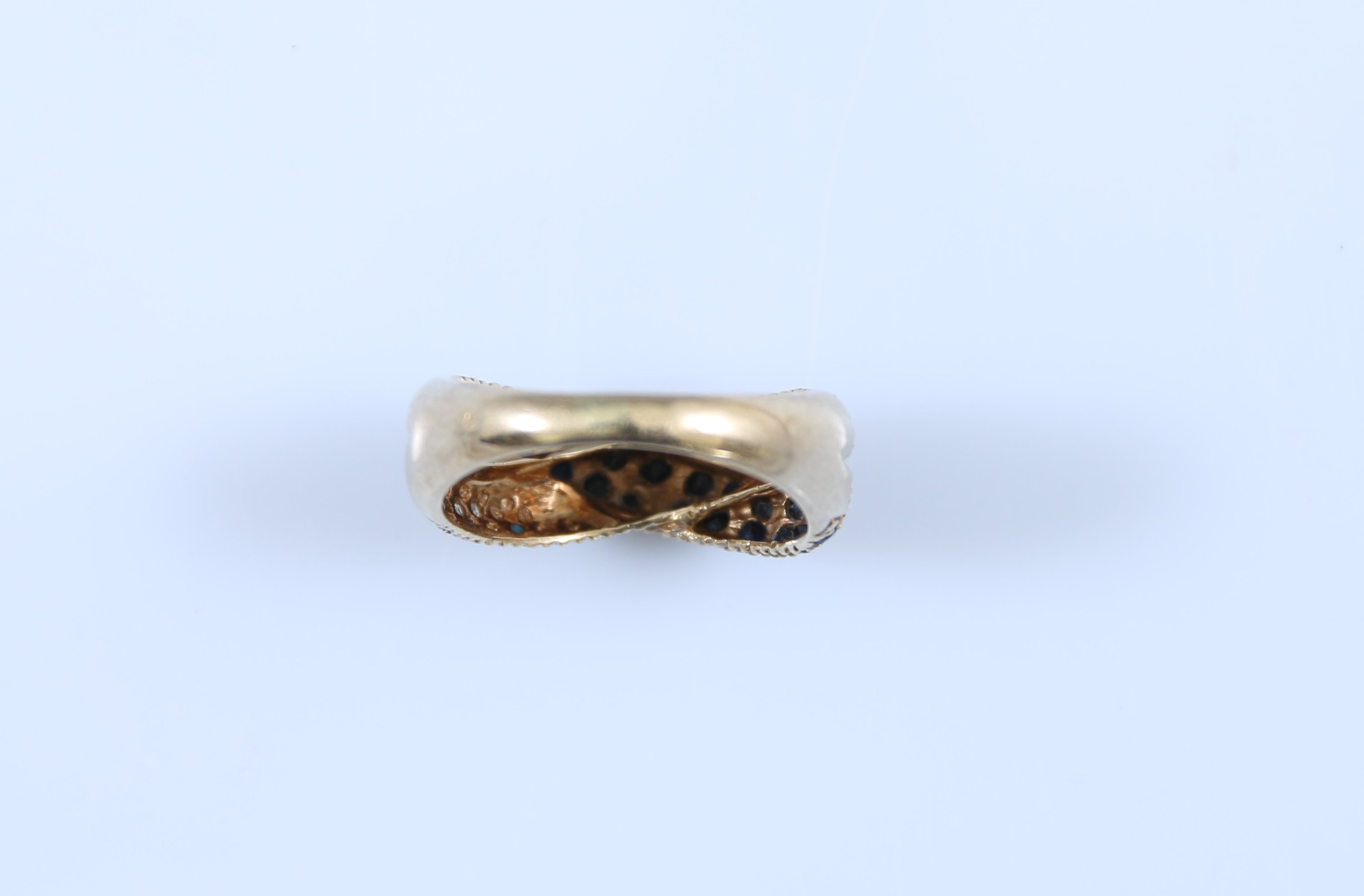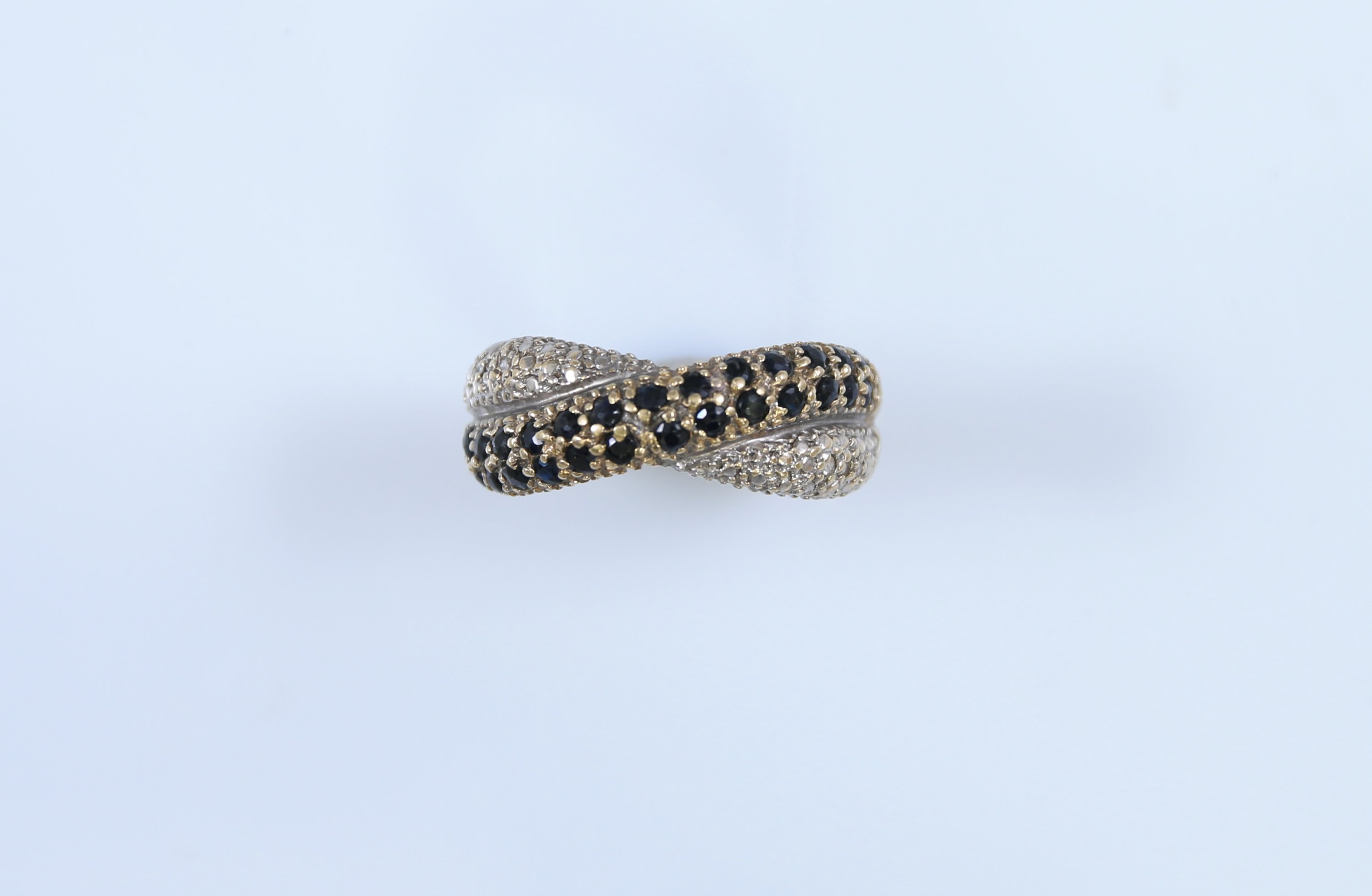 Sertie de pierres bleues et pierres blanches de forme à simuler deux anneaux entrelacés.