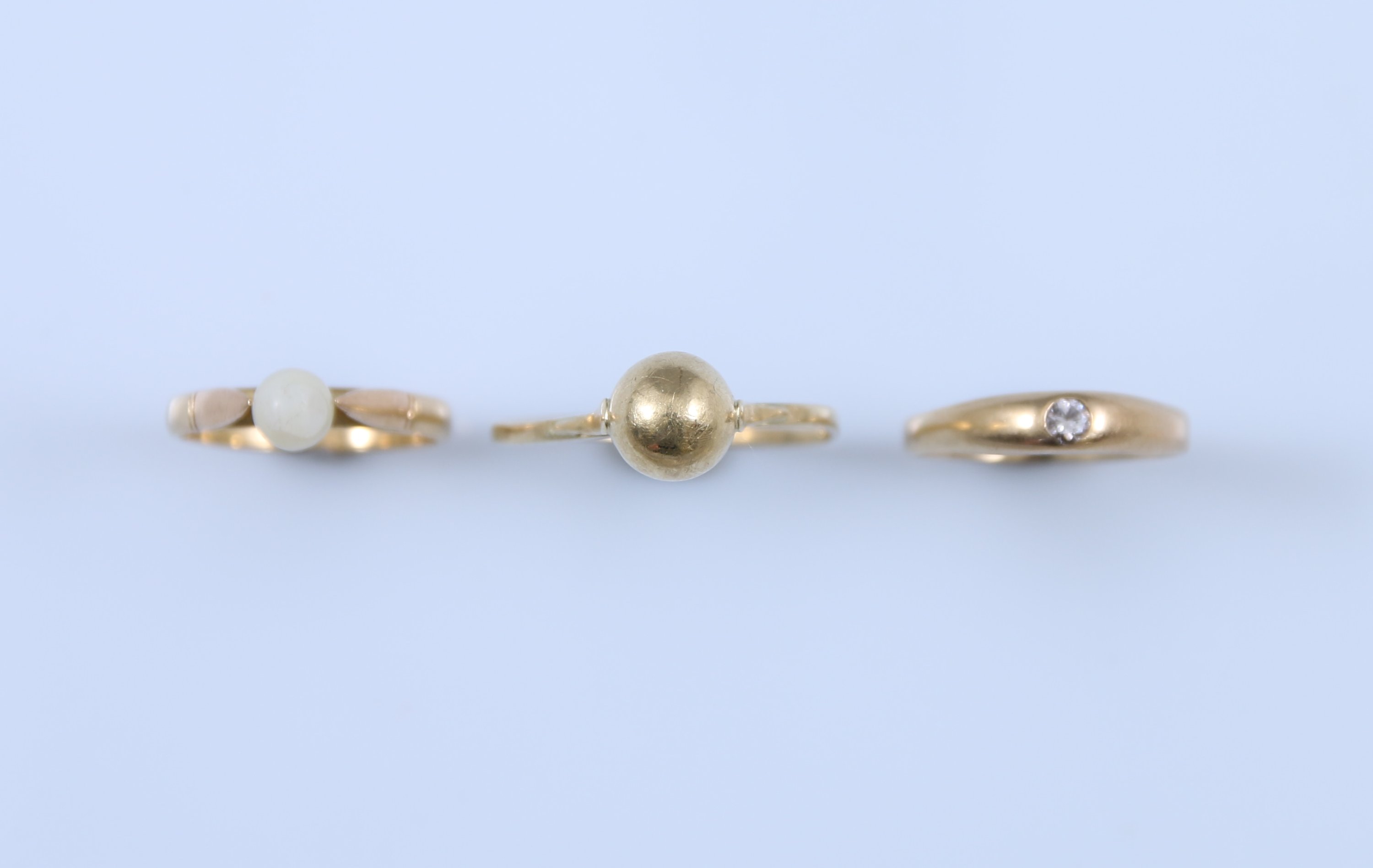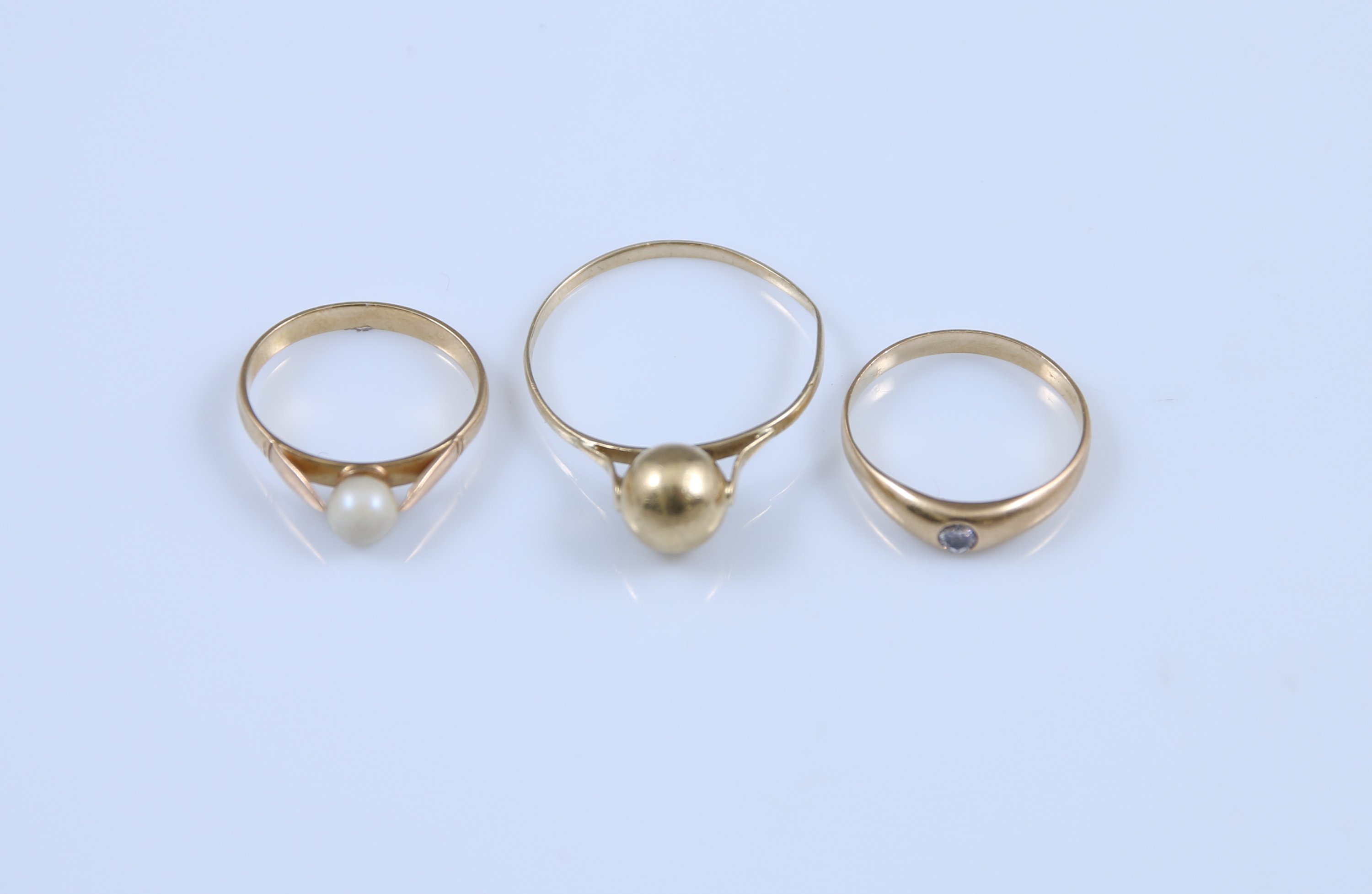 L'une sertie d'une perle, une deuxième à perle simulée, la troisième sertie clos d'une pierre blanche.