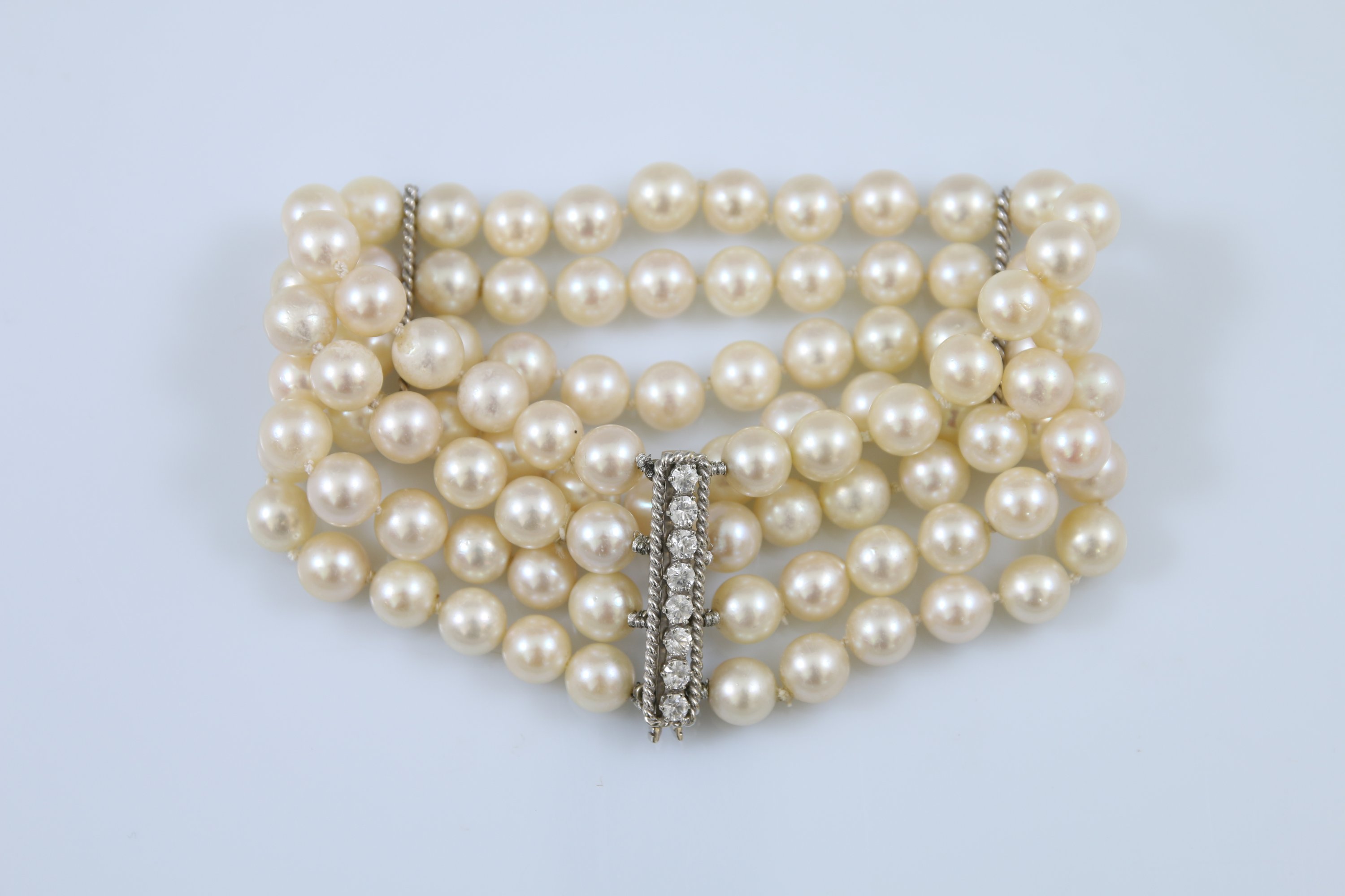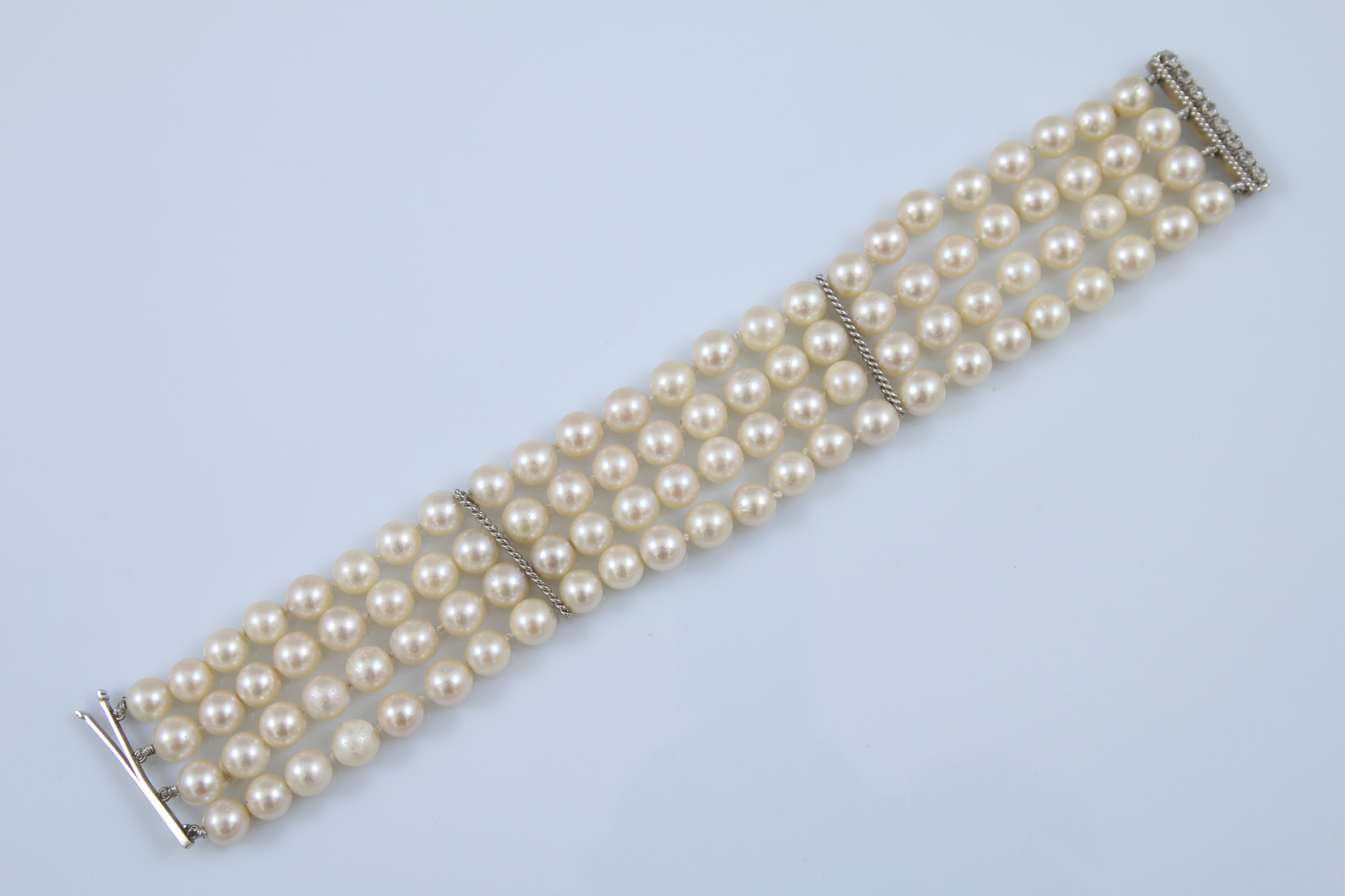 Monture en or gris et Quatre rangs de 24 perles chacun.
