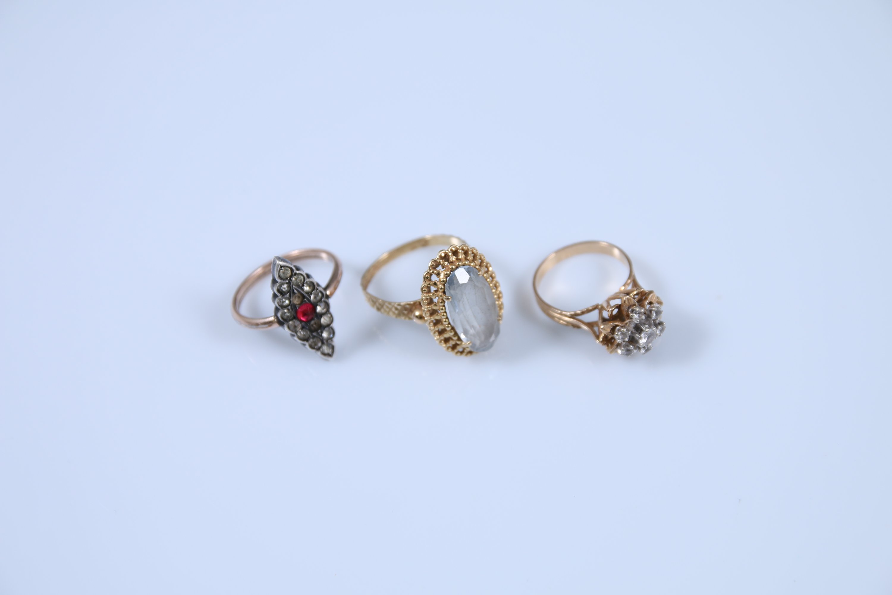 Joint : une bague marquise en métal doré sertie d'une pierre rouge et pierres du Rhin. TDD 53. Poids brut : 3 g. (manque des pierres)