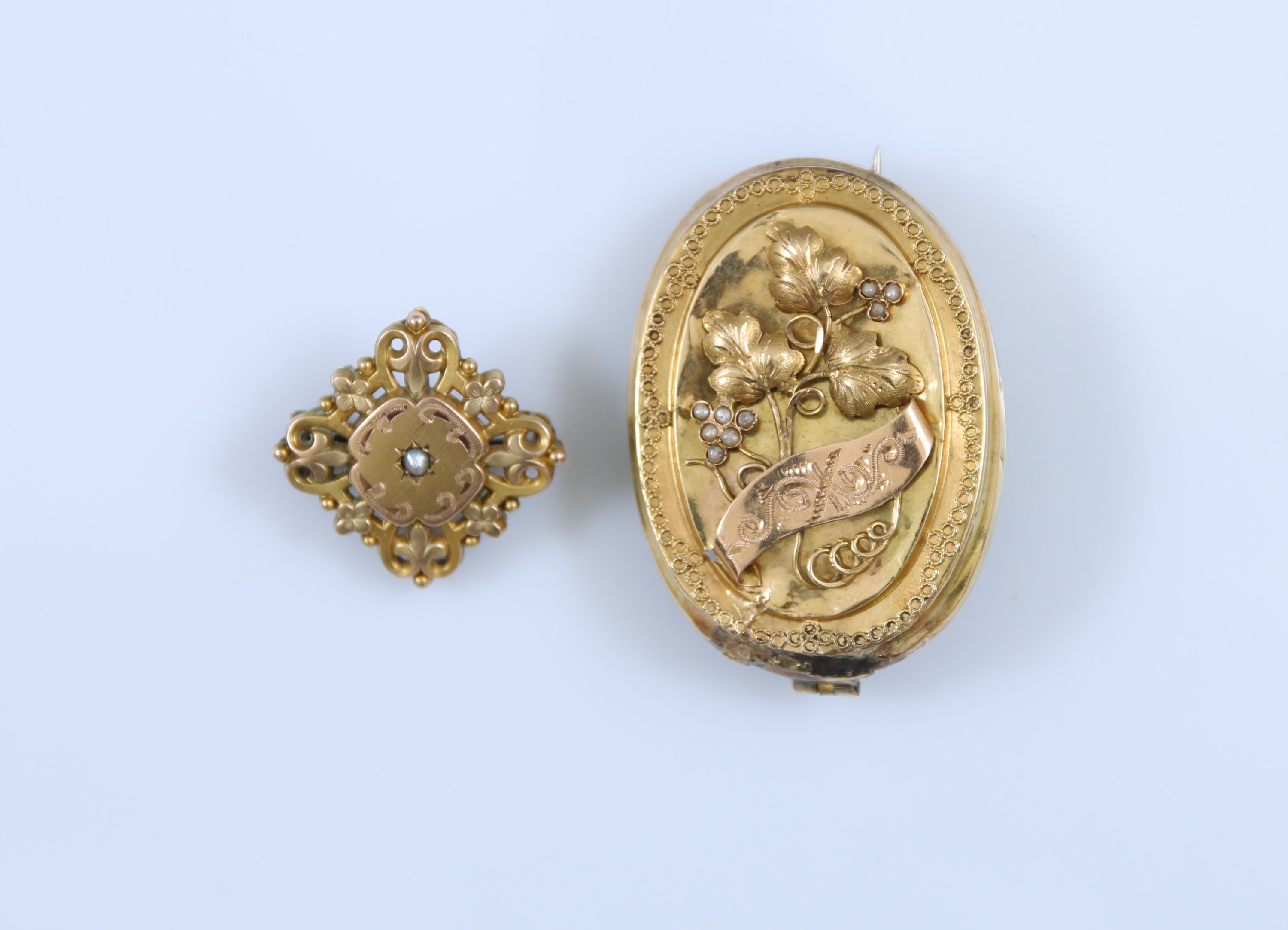 La première de forme médaillon en or deux tons, à décor de pampres de vigne sertie de perles dans un entourage filigrané. Epingle en métal.