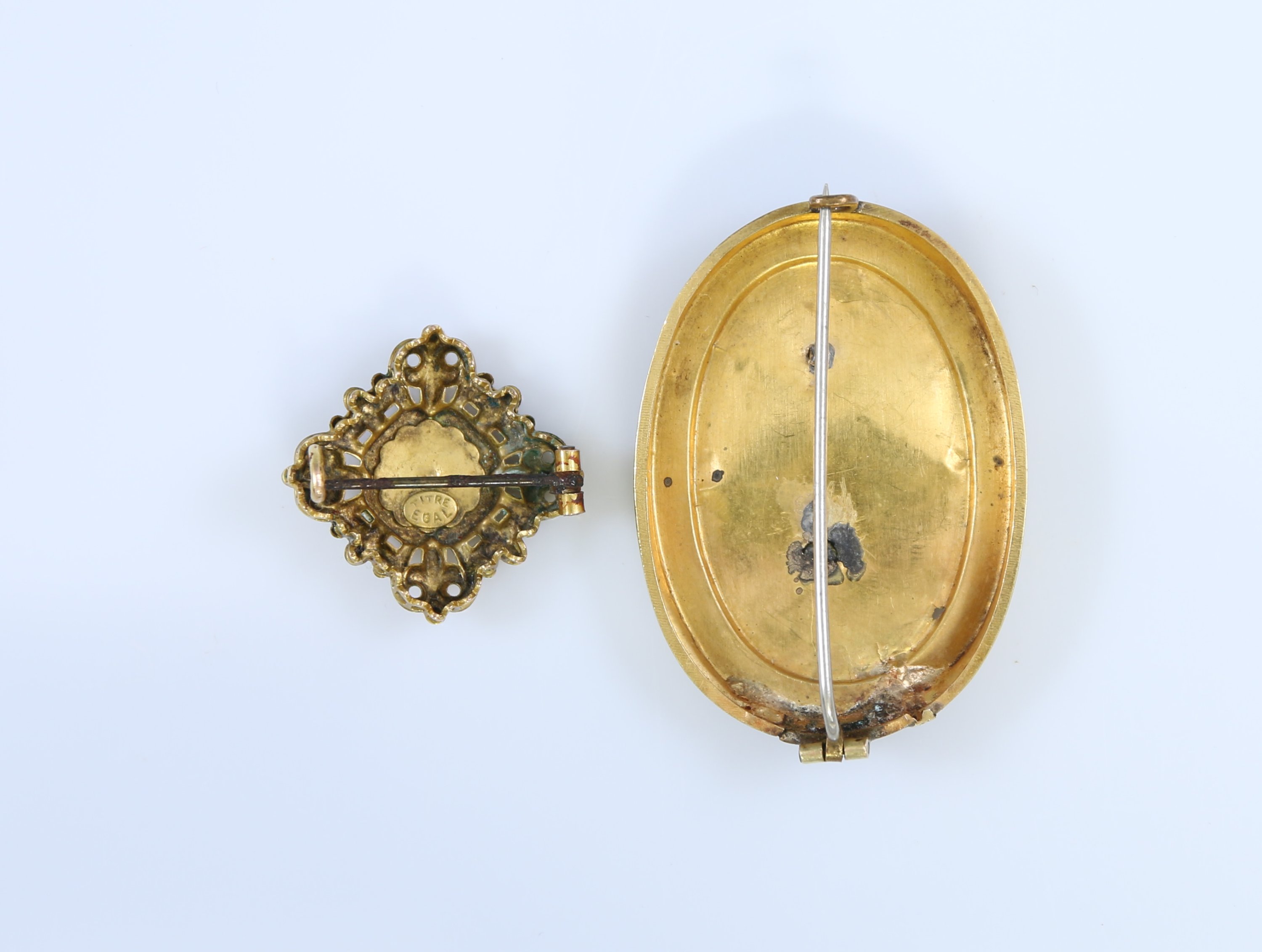 L'autre carré à deux tons d'or, à décor ajouré de fleurettes, fleurs de lys et centré d'une perle. Epingle en métal.