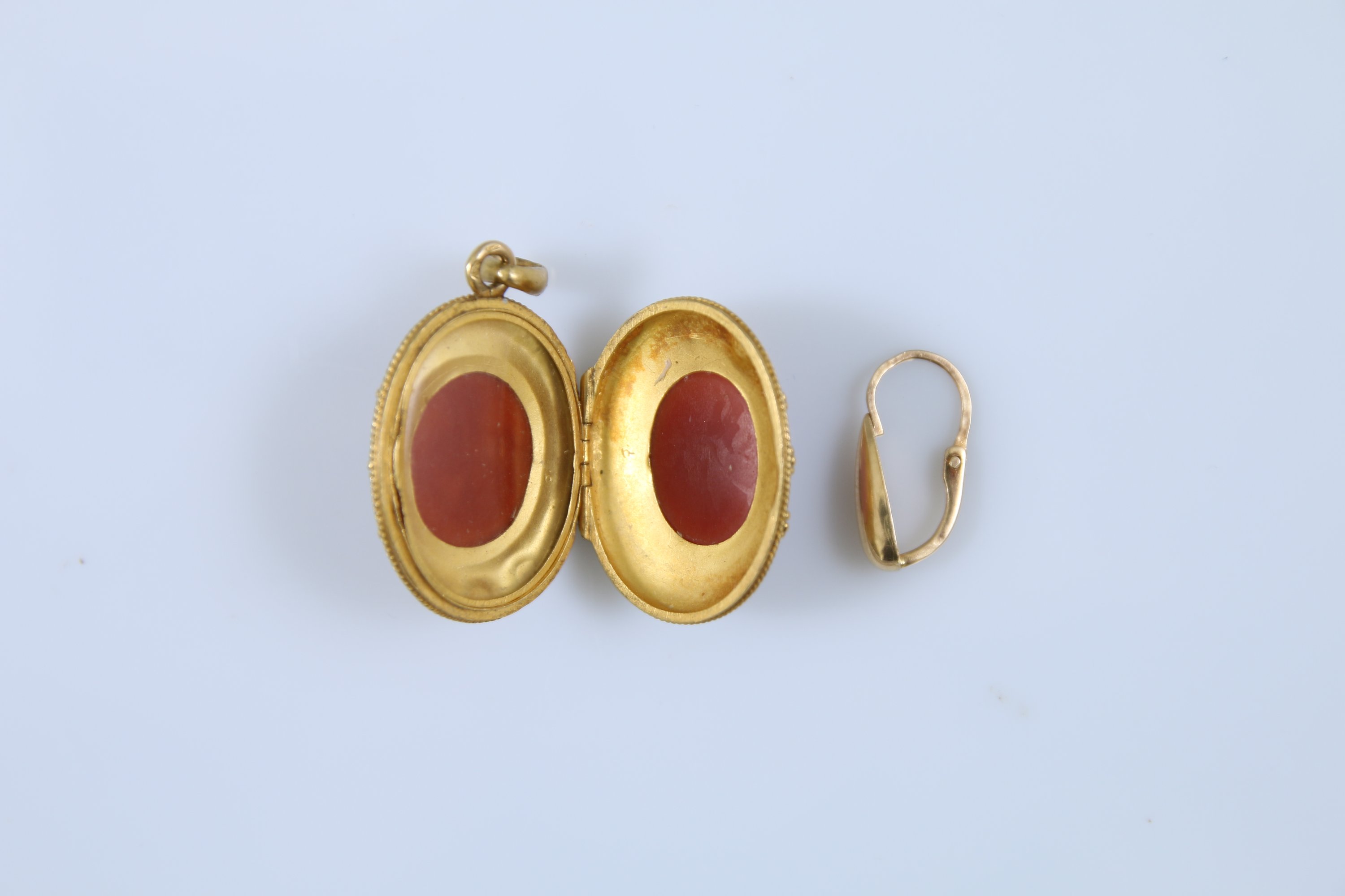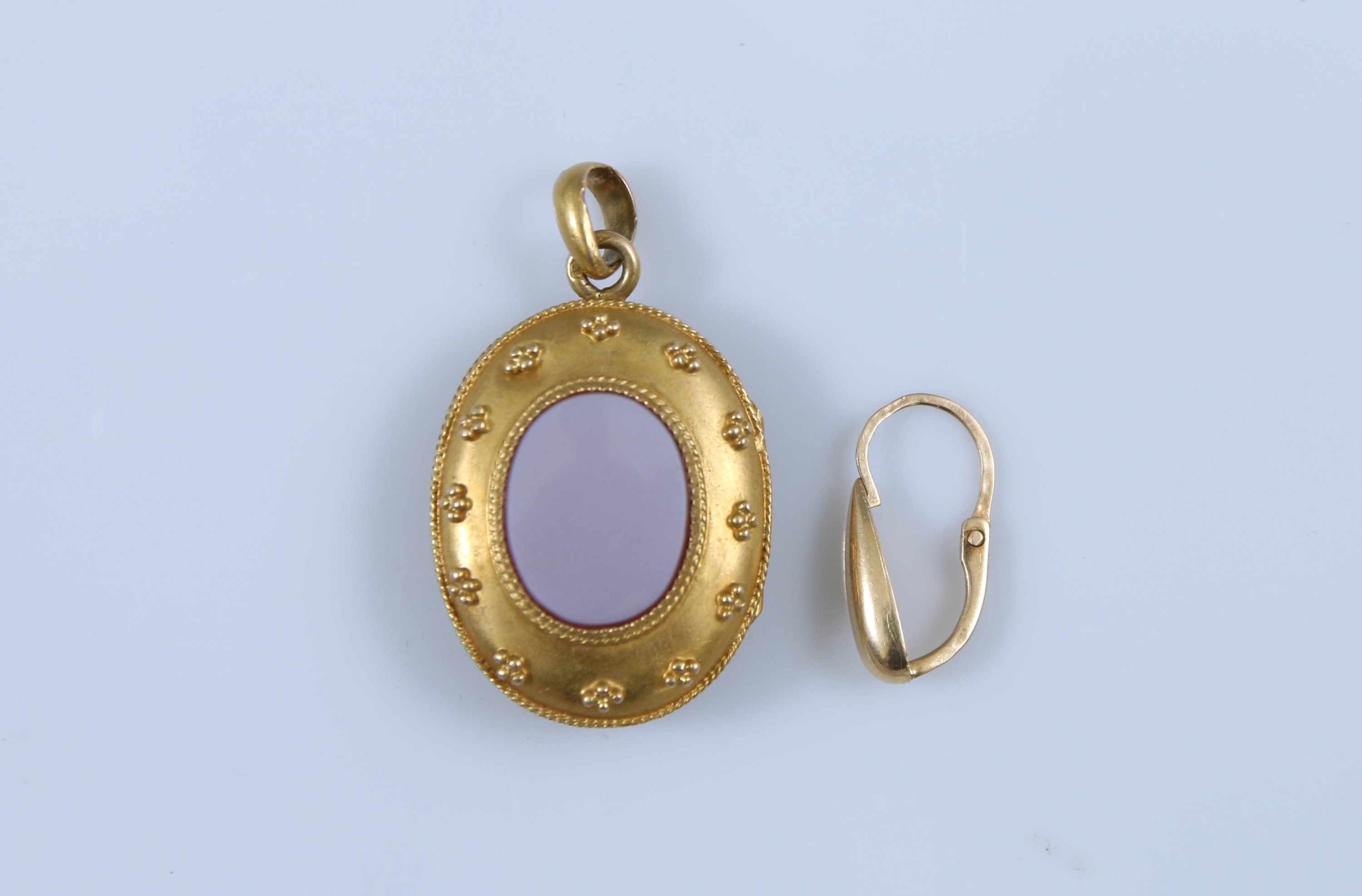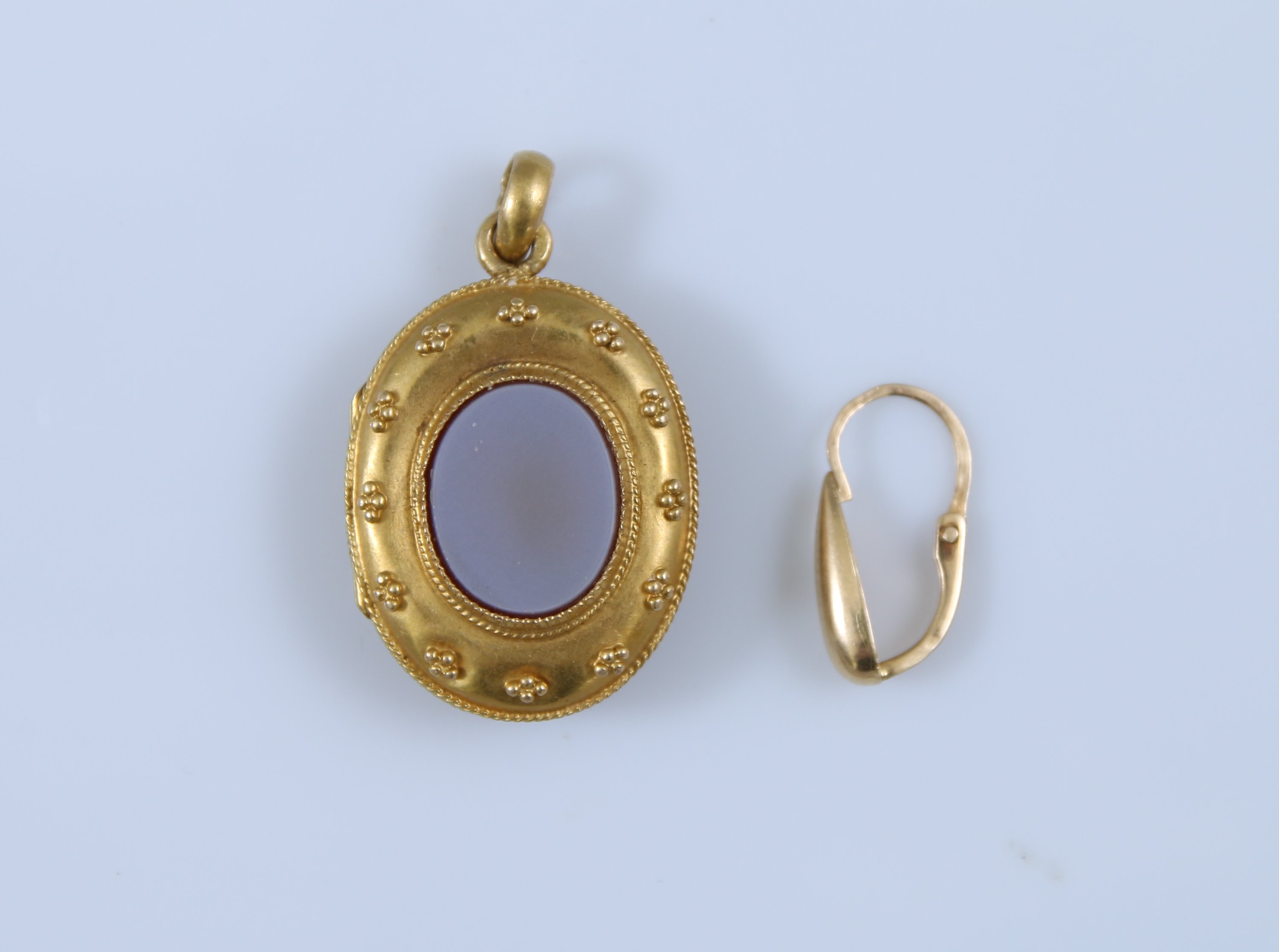 Comprenant une boucle d'oreilles et un médaillon porte-photo en or 750 millièmes serti de pierre dure.