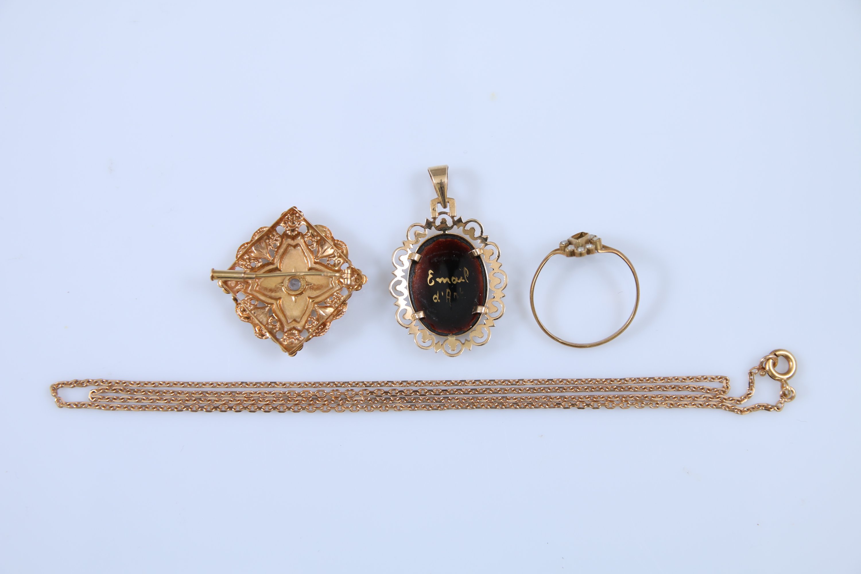 L'ensemble comprend une bague sertie de petites perles, une broche, une chaine et un médaillon décoré d'un émail.