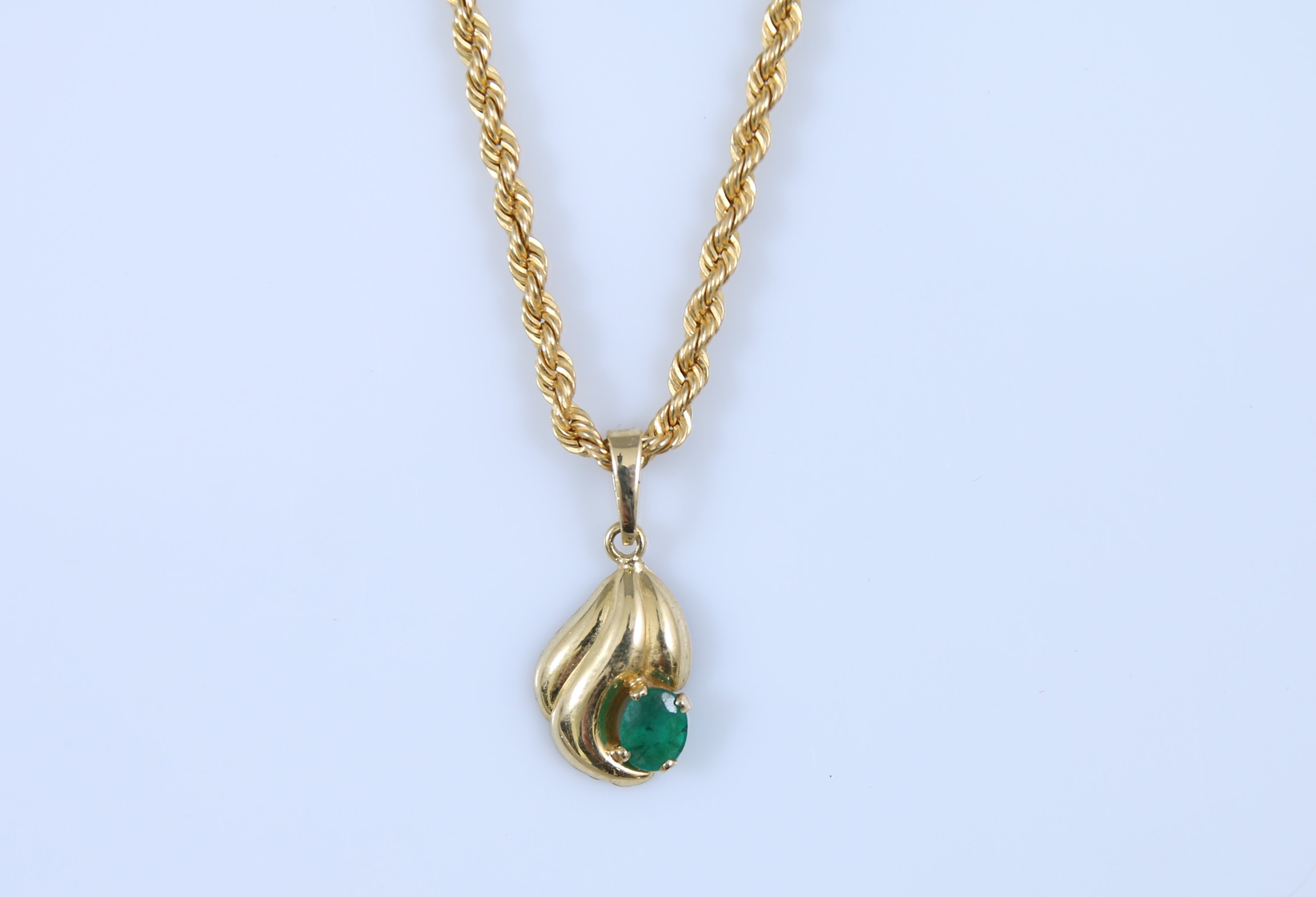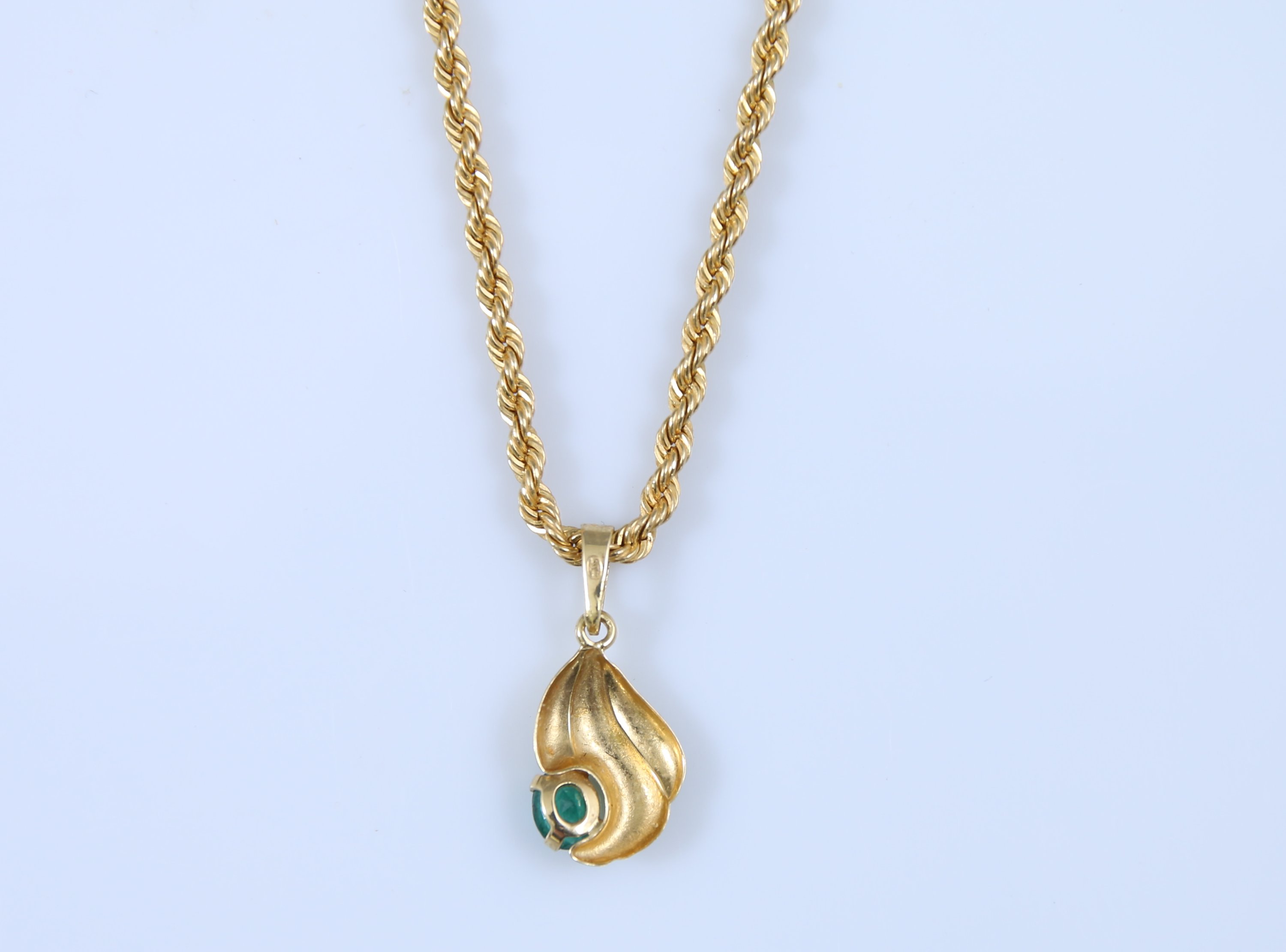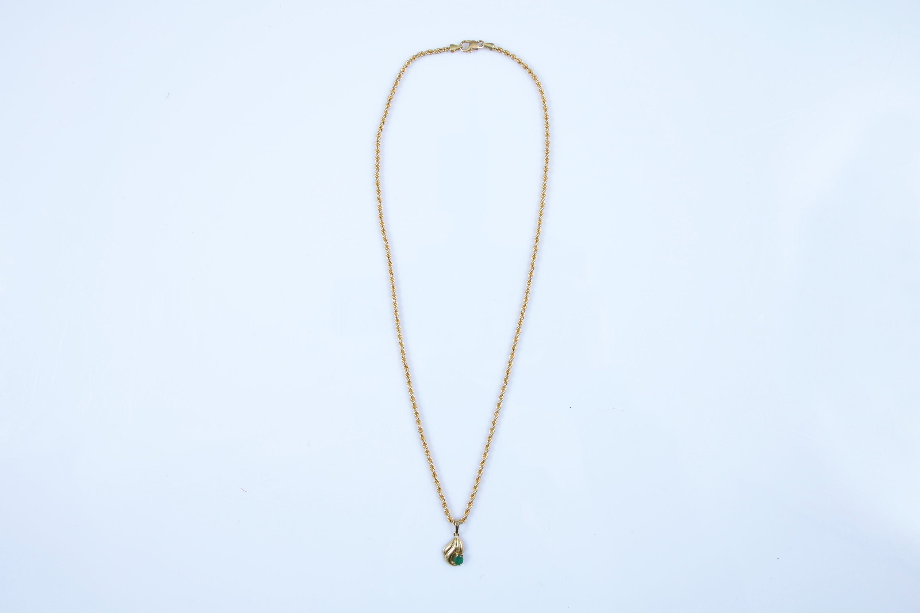 La chaine à mailles torsadées retenant un pendentif à godron serti d'une pierre verte.