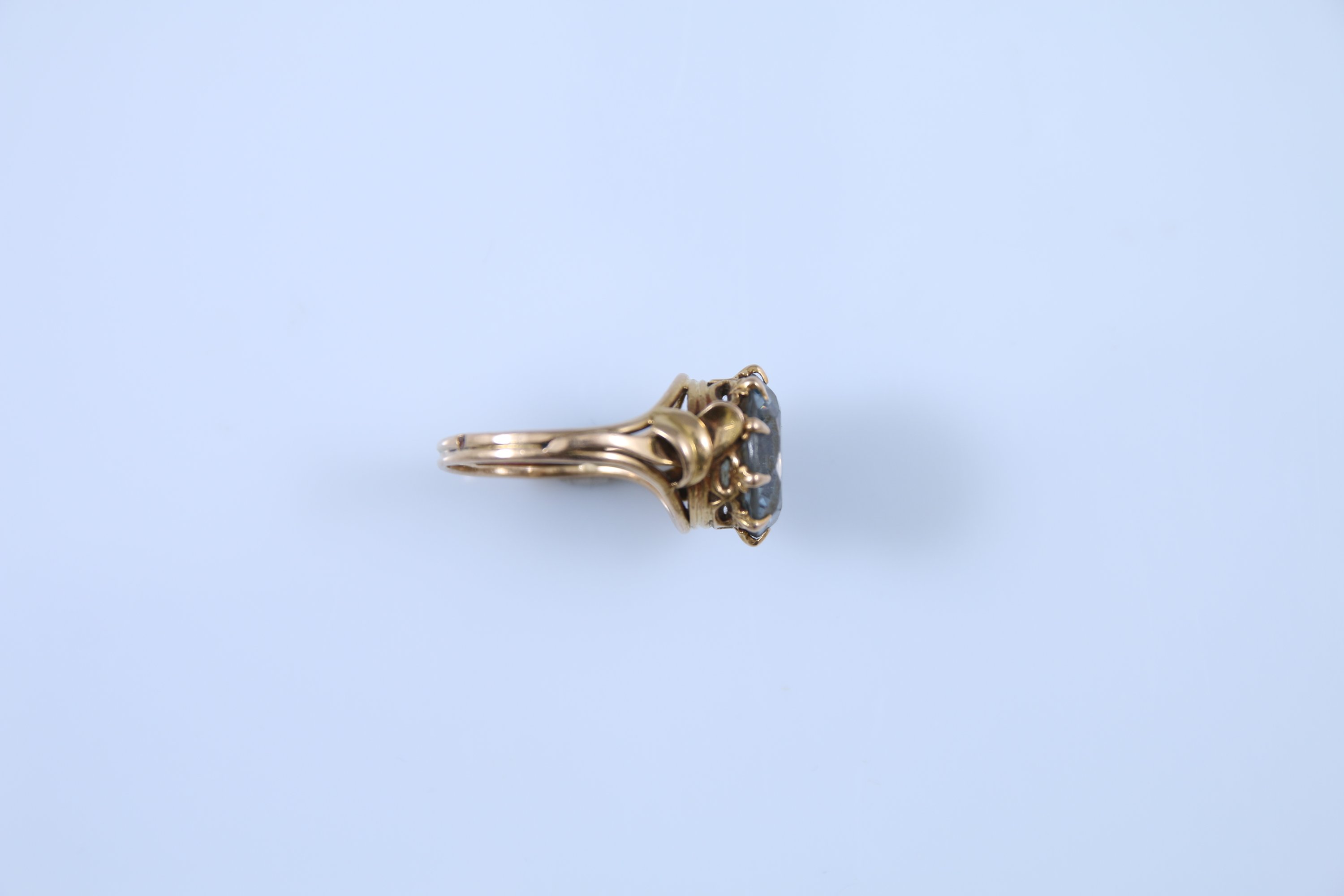 Or jaune 750 millièmes sertie d'une aigue-marine ronde. La monture à décor de feuilles affrontées.