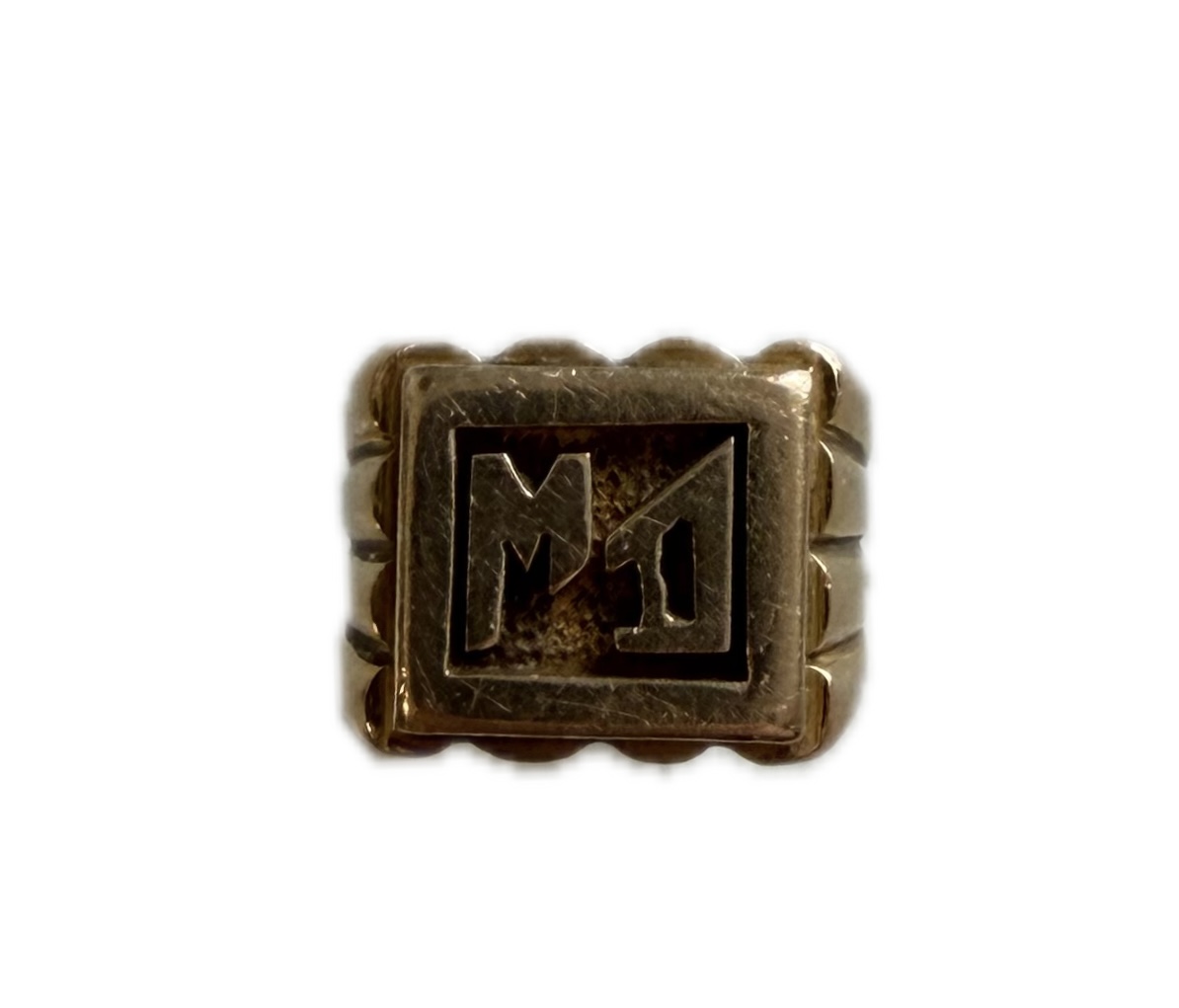 Or jaune 750 millièmes. Le chaton monogrammé "MD" dans un entourage de godrons.