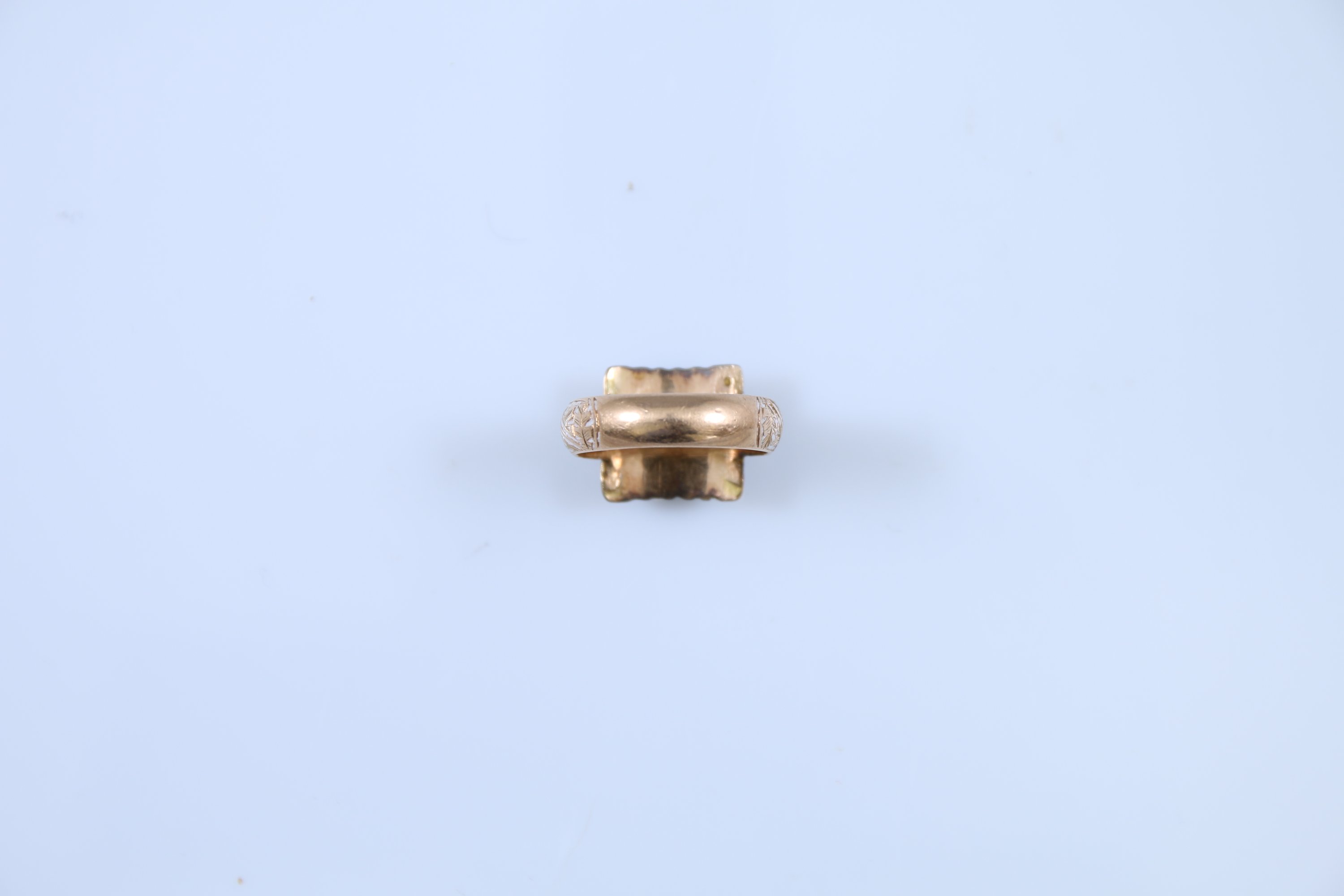 Or jaune 585 millièmes ornée au centre d'un grenat serti clos dans un décor gravé et émaillé blanc.