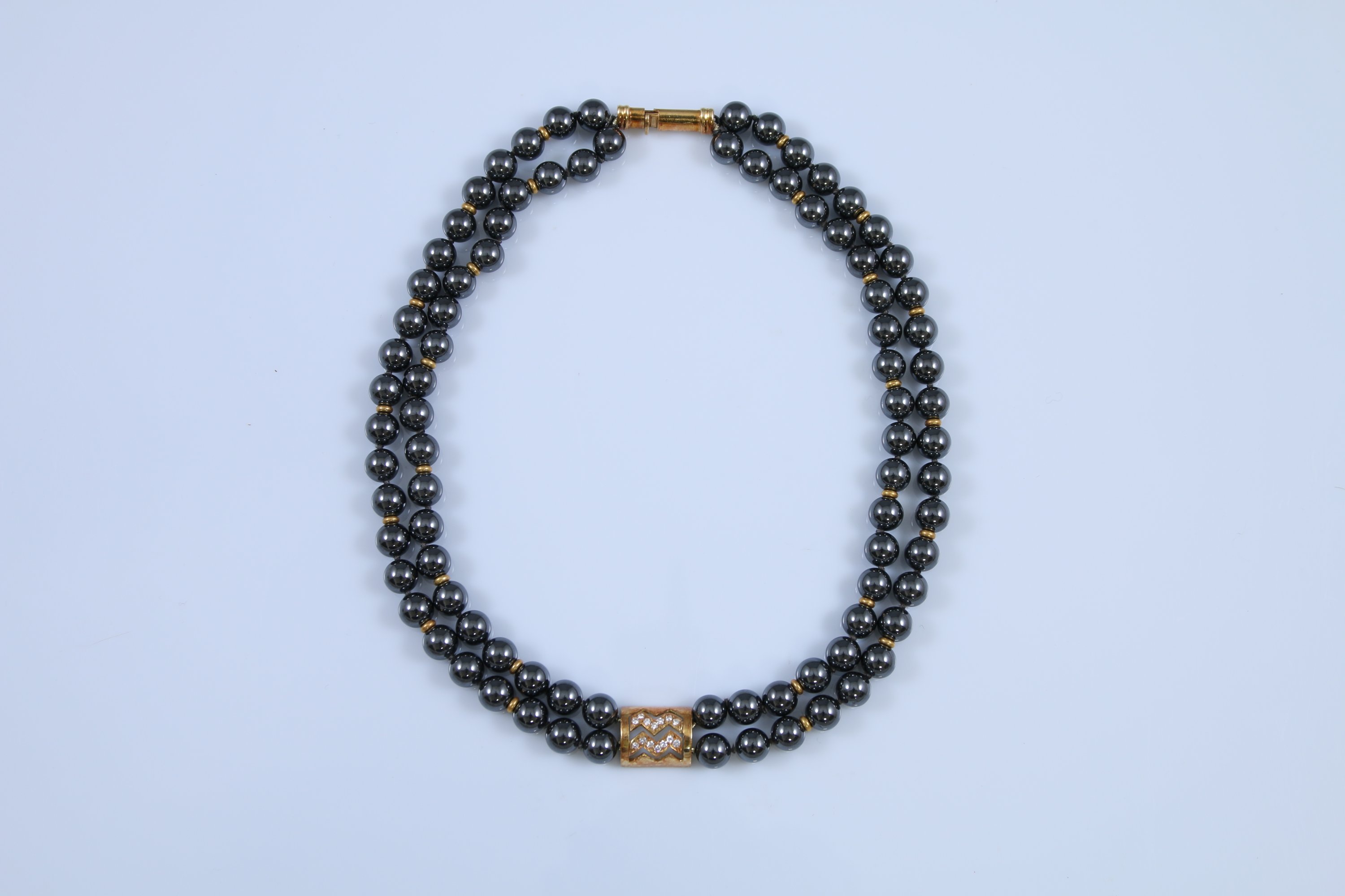 - L'un à deux rangs de perles en magnétites, fermoir et centre en or jaune 750 millièmes orné d'un symbole sertis de petits diamants tailles brillant.