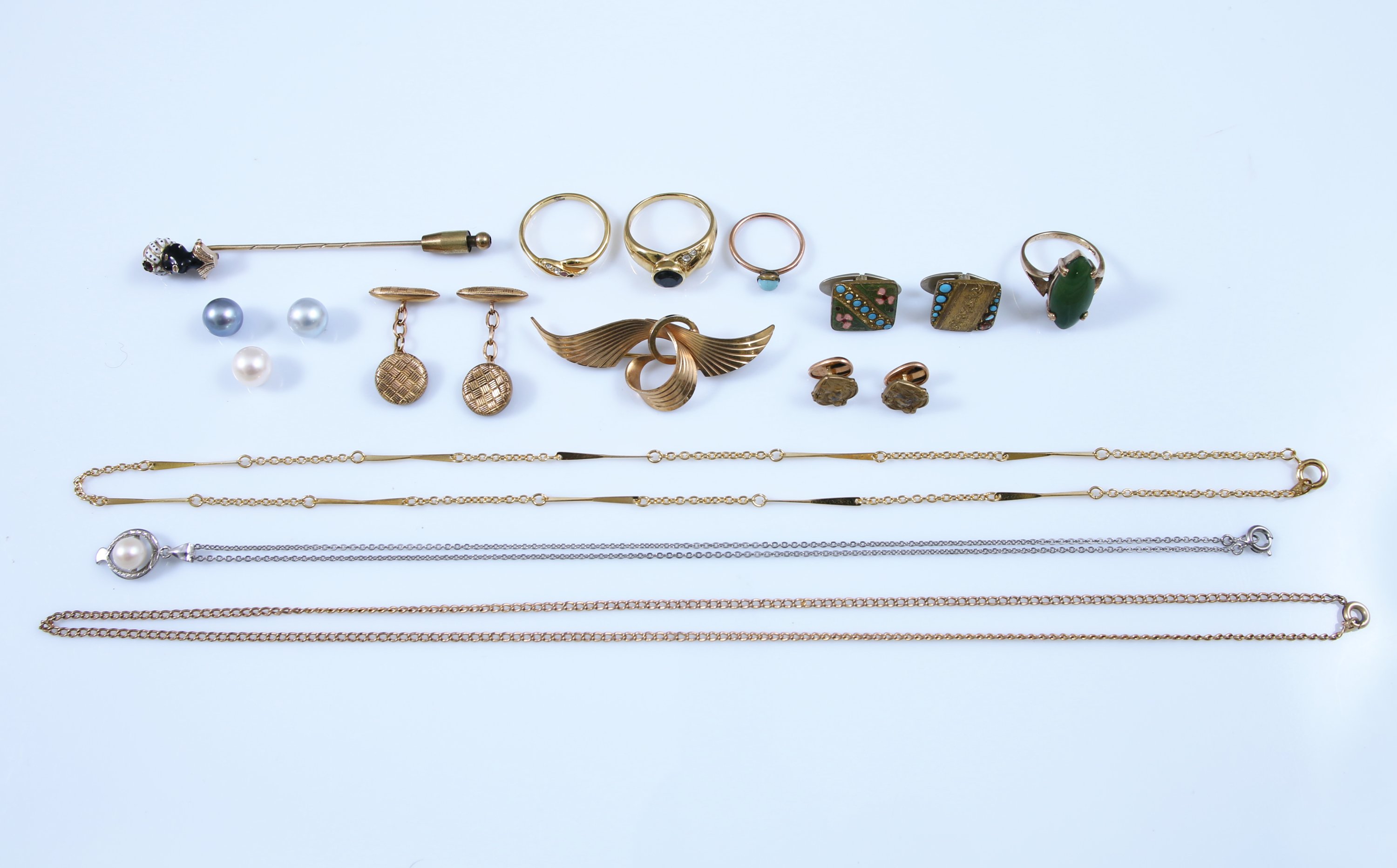 Comprenant notamment un collier en métal argenté, trois perles de culture dont deux percées, deux paires de boutons de manchettes, une paire de paire de boutons de col, deux chaines, quatres bagues ornées de pierres fines ou imitations, une broche et une épingle émaillé figurant un moretto dans le goût vénitien.