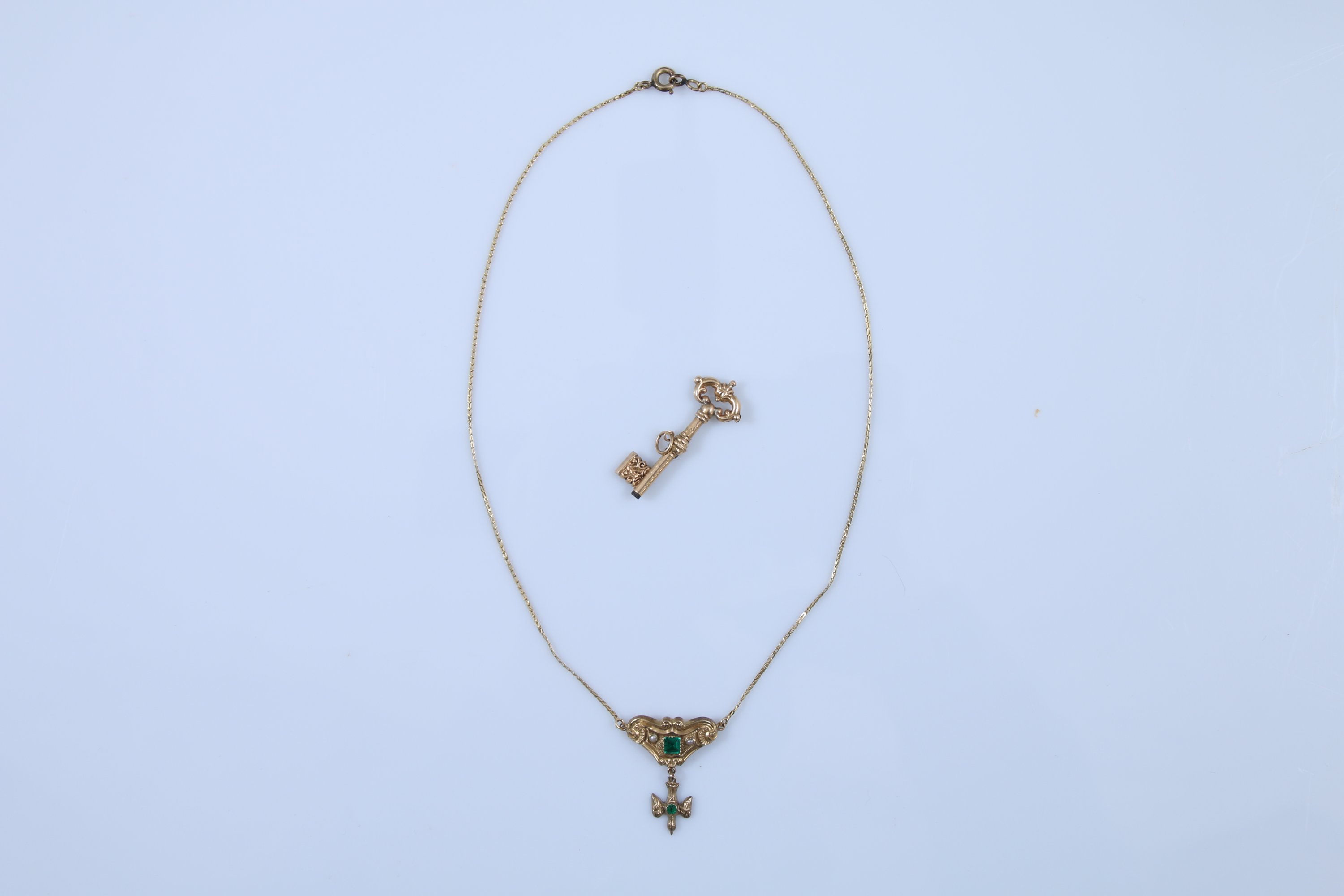 - Pendentif en or jaune 750 millièmes en forme du Saint-Esprit sertie de deux semences de perles et pierres vertes. La chaine en métal doré. Poids brut : 2,2 g.