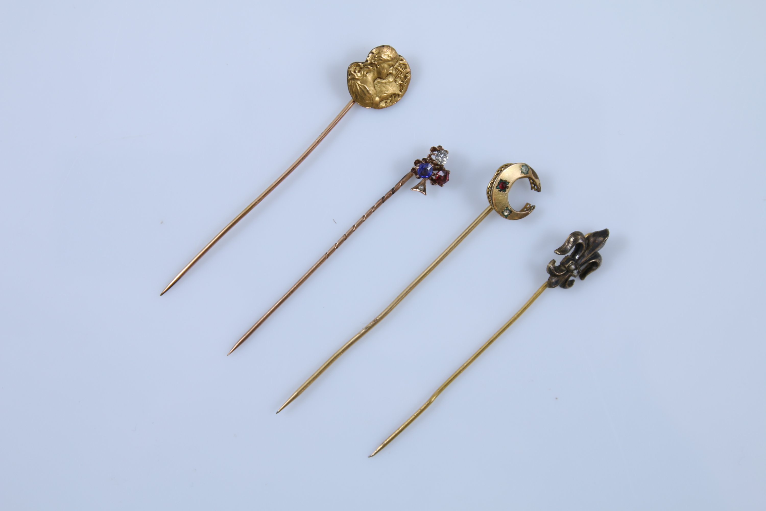 Joints : quatre épingles en métal doré dont en forme de fleur de lys et croissant de lune.