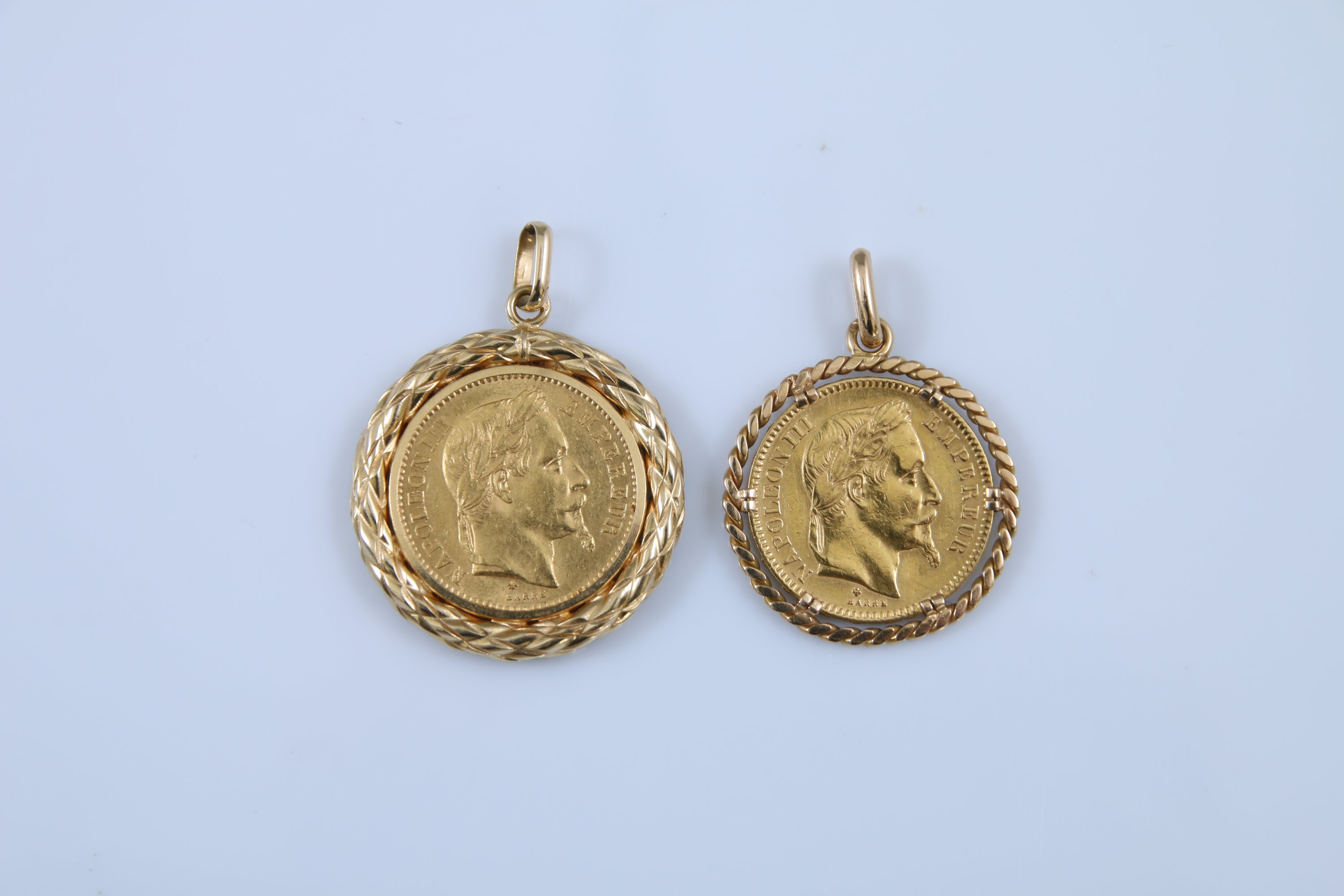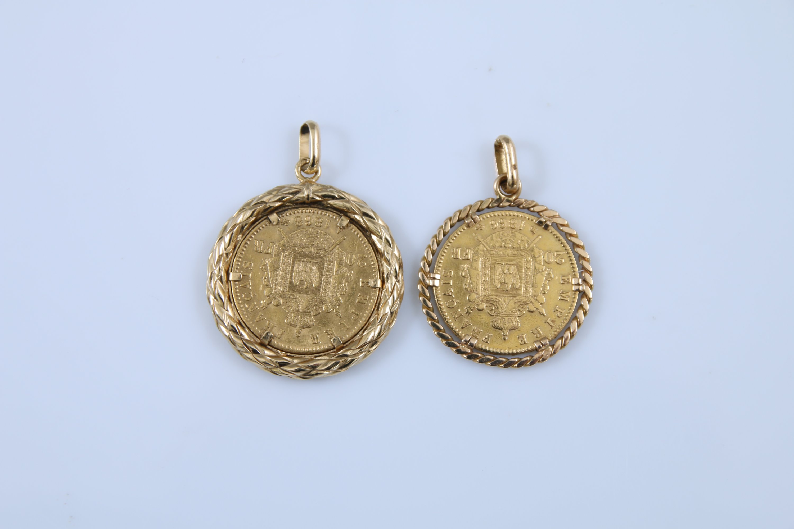 Tors de laurier et cordelettes entourant chacun une pièce de 20F (1866 et 1868).